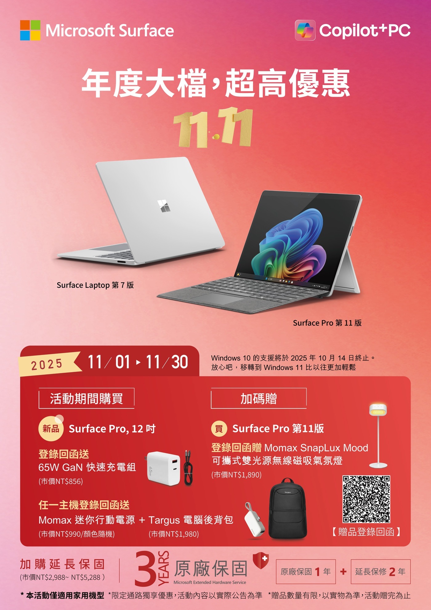- 指定家用Surface主機回函登錄送Momax 行動電源(市價$990) + Targus電腦後背包(市價$1,980)