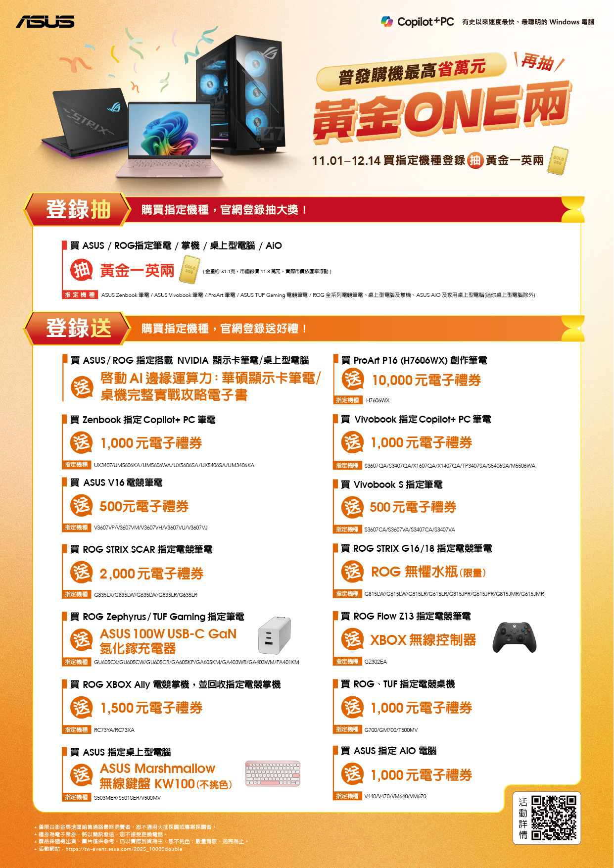 11/1 - 12/14 購買 ASUS / ROG 系列指定機種,登錄抽黃金一英兩 ( 共抽 1 名 )