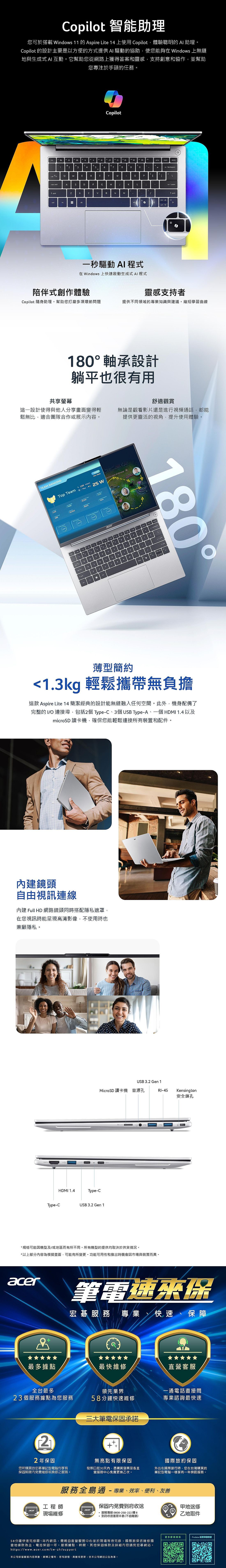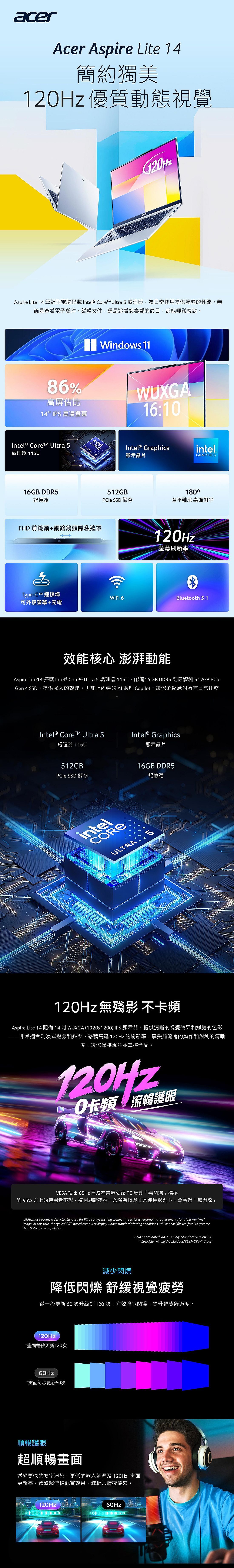 型號:AL14-53P-52SF作業系統:Windows 11 HomeCPU:Intel® Core™ Ultra 5 processor 115Uclock/Turbo:1.5 GHz/4.2 GHzCores/Threads:8/10Smart Cache:10 MBLCD 尺寸/規格:14" 16:10/IPS/120Hz/霧面解析度:WUXGA 1920 x 1200色域:NTSC 45%亮度:300 nits顯示晶片:Intel® GraphicsVRAM:N記憶體:16GB DDR5支援容量(總插槽數量/總容量):2/32GB儲存空間:512GB PCIe Gen4 SSD支援擴充空間(包含已安裝部分):M.2 SSD *1built in speaker:YBuilt-in microphone:Y鍵盤:無背光Webcam:2M Full HD Camera"無線網路:802.11a/b/g/n/ac+ax wireless LANDual Band (2.4 GHz and 5 GHz)2x2 MU-MIMO"藍牙:Bluetooth® 5.1區域網路RJ-45:NKensington lock slot:Y尺寸(mm):316 (W) x 223.8 (D) x 18.6 (H) mm材質:塑膠重量:1.29 kg電源變壓器:65W TypeC電池:58Wh batteryBattery Life:Battery life up to 8 hoursInput/OutputCard Reader:Y(microSD™ Card reader)USB Type-C:1(USB 3.2 Gen 1)(DisplayPort)(DC-in 5 or 9 or 12 or 15 or 20 V; 65 W)+1(USB 3.2 Gen 1)(DC-in 5 or 9 or 12 or 15 or 20 V; 65 W)Type-C 支援影像傳輸:YUSB Type-A:3(USB 3.2 Gen 1)HDMI:Y(HDMI 1.4)External display (VGA) port:NDisPlay Port:N可外接螢幕數量:2耳機/喇叭輸出:Y(與耳機/喇叭輸出共用jack)麥克風輸入:Y(與耳機/喇叭輸出共用jack)安全指紋辨識:NTPM:N保固:台灣2年備註:無附鼠包/需另購*** 請注意:本機不含 Microsoft® Office 授權/需自行另購< 文案中相關圖文及說明,僅供參考,規格配置依機型不同有所差異,請以實際商品為準 >