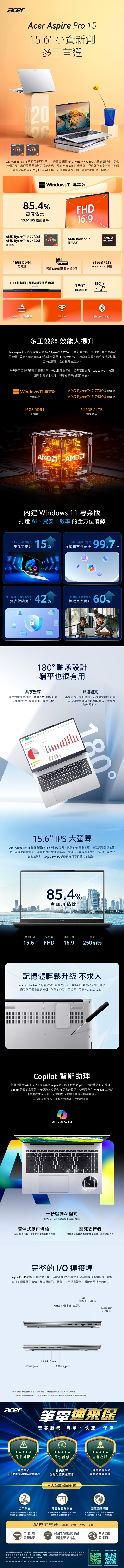 商品規格作業系統:Windows 11 Pro處理器:AMD Ryzen™ 7 7730U晶片組:NLCD :尺寸/規格:15.6"/霧面/LED背光/IPS解析度:FHD 1920 x 1080色域:NTSC 45%亮度:250 nits顯示晶片:AMD Radeon™ GraphicsVRAM:N記憶體:16GB DDR4 SO-DIMM支援容量(總插槽數量/總容量):2/32GB儲存空間:1TB PCIe NVMe Gen3 SSD支援擴充空間(包含已安裝部分):M.2 SSD*2Acer TrueHarmony:NDTS® Audio:NAcer Purified.Voice:Nbuilt in speaker:YBuilt-in microphone:YWebcam:2M FHD無線網路:802.11a/b/g/n/ac+ax2.4 GHz/5 GHz雙頻段2x2 MU-MIMO"藍牙:Bluetooth 5.1區域網路RJ-45:YKensington lock slot:Y尺寸(mm):359.3 (W) x 230.2 (D) x 18.6 (H) mm材質:塑膠重量:1.49 kg電源變壓器:65W電池:58 Wh 3-cell Li-ion batteryBattery Life:Up to 8 hours (video playback & web browsing)Input/OutputCard Reader:Y (MicroSD up to 1TB)USB Type-C:1x USB 3.2 Gen 1 (up to 5 Gbps)DisplayPort over USB-CUSB charging 5/9/12/15/20 V; 3.25 ADC-in port 20 V; 65 W1x USB 3.2 Gen 1 (up to 5 Gbps)DC-in port 20 V; 65 W"Type-C 支援影像傳輸:Y (only 1 type-c Port)USB Type-A:2x USB 3.2 Gen 11x USB 2.0HDMI:Y (HDMI 1.4 with HDCP Support)External display (VGA) port:NDisPlay Port:N可外接螢幕數量:2耳機/喇叭輸出:Y(與耳機/喇叭輸出共用jack)麥克風輸入:Y(與耳機/喇叭輸出共用jack)Ethernet (RJ-45):Y安全指紋辨識:NTPM:N保固:台灣2年到府收送貨源:公司貨*** 請注意:本機不含 Microsoft® Office 授權/需自行另購 ***以上規格僅供參考,若有錯誤,請以原廠官網公布為準