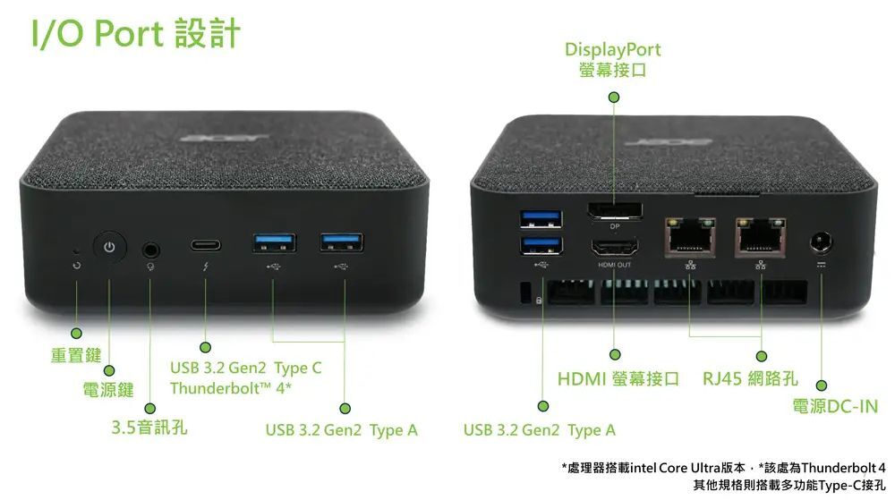 ~~2025/12/08到貨商品規格處理器:Intel Core Ultra 7 255H主機板晶片組:intel Arc 130T GPU記憶體:16GB DDR5 SO-DIMM = (16G x 1條)(筆記型短版)記憶體支援容量 : 總插槽數量 2 / 最高容量64G)注意:記憶體速度時脈頻率,根據處理器設定而降低。硬碟:1TB M.2 SSD顯示介面:intel Arc 130T GPU光碟機:無讀卡機:無鍵鼠組:無線鍵盤滑鼠組音效:7.1 Channel HD Audio (ALC897)特殊介面:-螢幕輸出介面:HDMI.DP無線網路:Wi-Fi 6 + Bluetooth 5.2有線網路:Intel I219V電源供應:120W作業系統:Win11專業版 (64bit)保固:原廠三年保固/到府收送(原廠於保固期內將自行或委託第三方到府收送)●前端介面1x Power Button1x Audio jacks1x Reset Button1x USB 3.2 Gen 2 Type-C™ (支援充電/螢幕顯示/資料傳輸)2x USB 3.2 Gen 2 Type-A●後端介面1x HDMI Port (out)1x Display Port (DP 1.4a)2x USB 3.2 Gen 2 Type-A2x Ethernet (RJ-45) port (GigaLAN)1x Kensington Lock slot擴充介面:1x M.2 2230 Slot (for WLAN)2x M.2 2280 Slot (for SSD,已使用其中1個)2x DDR5 SO-DIMM 記憶體插槽(筆記型用短版)(最高支援容量64G)注意:記憶體速度時脈頻率,根據處理器設定而降低。●商品尺寸體積(公分):13.1 (W) x 13.1 (D) x 43 (H)重量:500克貨源:公司貨*** 請注意:本機不含 Microsoft® Office 授權/需自行另購 ***以上規格僅供參考,若有錯誤,請以原廠官網公布為準