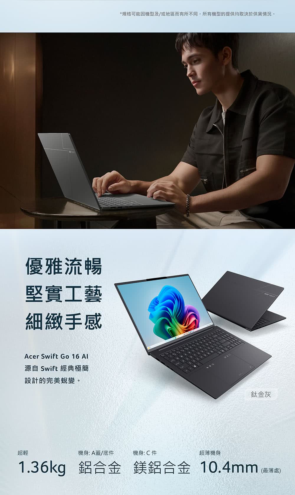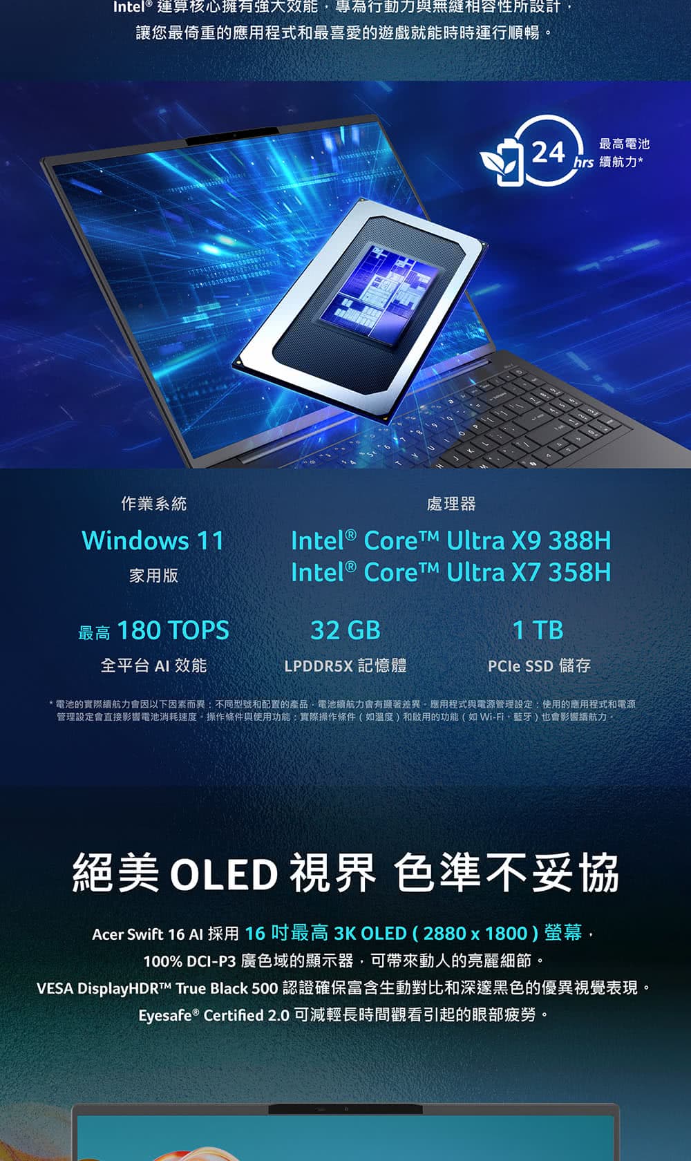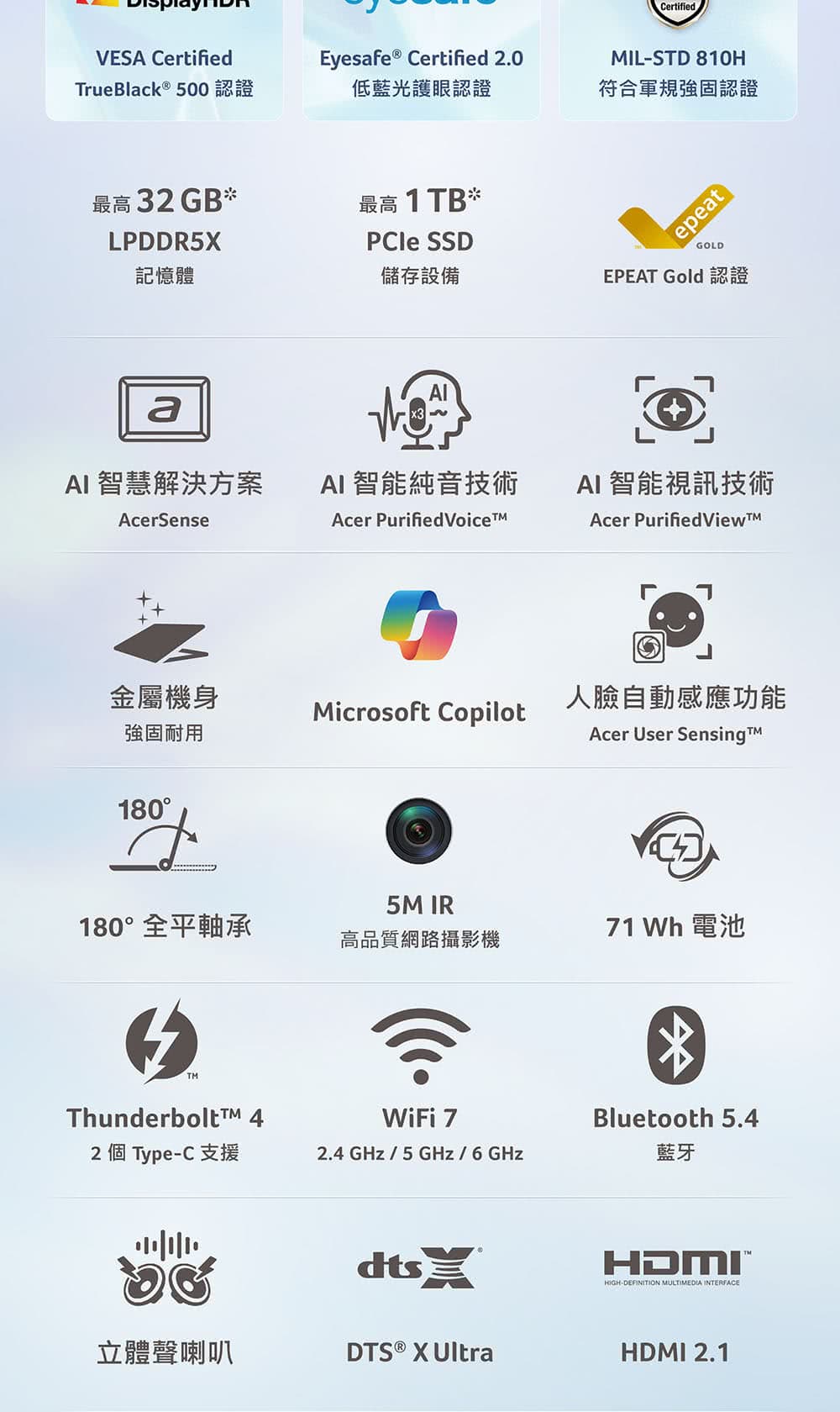 商品規格AI PN:NX.JY1TA.002型號:SFG16-I71-76ZJ作業系統:Windows 11 Home處理器:Intel® Core™ Ultra X7 processor 358HLCD尺寸/規格:16" 16:10/OLED/鏡面解析度:WQXGA+ 2880 x 1800色域:DCI-P3 100%亮度:400 nits顯示晶片:Intel® Arc™ B390 GPUVRAM:N風扇:2熱導管:2記憶體:32GB LPDDR5X(Onboard)支援容量(總插槽數量/總容量)0/32GB儲存空間:1TB PCIe Gen4 SSD支援擴充空間(包含已安裝部分)M.2 SSD *1光碟機:無AudioAcer TrueHarmony:YDTS® Audio:YAcer Purified.Voice:Ybuilt in speaker:YBuilt-in microphone:Y鍵盤:白色背光無線網路:Intel® Wi-Fi 7 Wireless LAN藍牙:Bluetooth® 5.4區域網路/RJ-45:NKensington lock slot:N尺寸(mm):354.95 (W) x 245.3 (D) x 10.4/15.7 (H) mm材質:鋁合金+鎂鋁合金重量:1.36 kg電源變壓器:100W TypeC電池:71Wh Li-ion batteryBattery Life:Up to 16.5 hours (MobileMark® 2030)Up to 24 hours (video playback)Up to 14 hours (web browsing)Input/Output/Card Reader:NUSB Type-C:2(USB4® 40Gbps)(Thunderbolt 4)(DC-in 20 V; 100 W)Type-C 支援影像傳輸:YUSB Type-A:1(USB 3.2 Gen 2)+1(USB 3.2 Gen 1)HDMI:Y(HDMI 2.1)External display (VGA) port:NDisPlay Port:N可外接螢幕數量:3耳機/喇叭輸出:Y(與耳機/喇叭輸出共用jack)麥克風輸入:Y(與耳機/喇叭輸出共用jack)安全:NTPM:N保固:台灣2年附贈配件:滑鼠/包貨源:公司貨*** 請注意:本機不含 Microsoft® Office 授權/需自行另購 ***以上規格僅供參考,若有錯誤,請以原廠官網公布為準