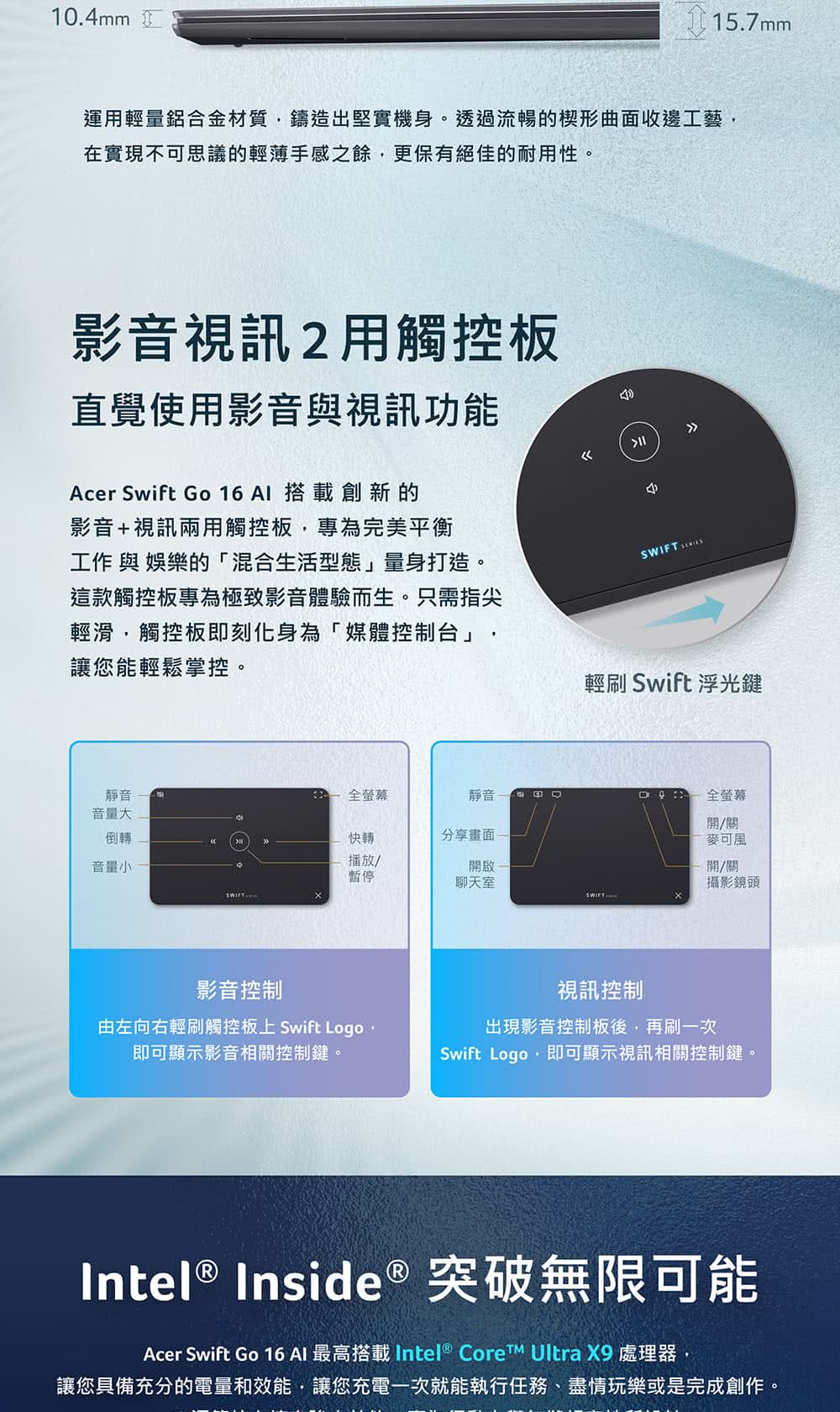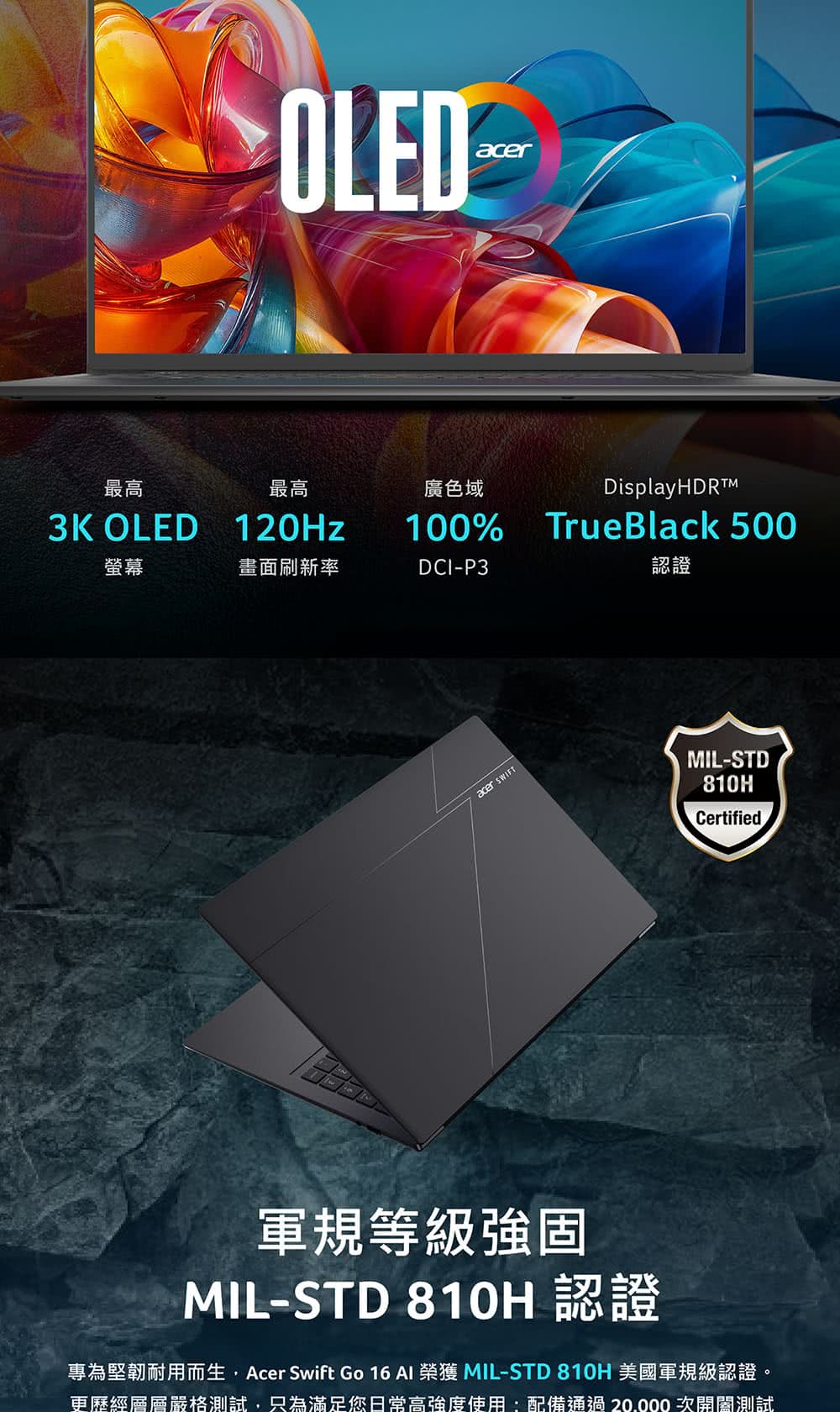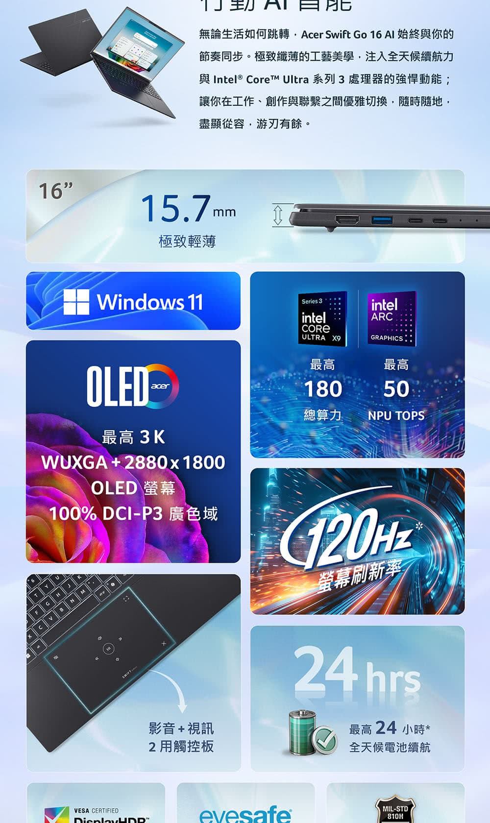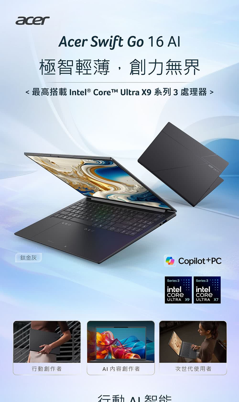 商品規格AI PN:NX.JY1TA.002型號:SFG16-I71-76ZJ作業系統:Windows 11 Home處理器:Intel® Core™ Ultra X7 processor 358HLCD尺寸/規格:16" 16:10/OLED/鏡面解析度:WQXGA+ 2880 x 1800色域:DCI-P3 100%亮度:400 nits顯示晶片:Intel® Arc™ B390 GPUVRAM:N風扇:2熱導管:2記憶體:32GB LPDDR5X(Onboard)支援容量(總插槽數量/總容量)0/32GB儲存空間:1TB PCIe Gen4 SSD支援擴充空間(包含已安裝部分)M.2 SSD *1光碟機:無AudioAcer TrueHarmony:YDTS® Audio:YAcer Purified.Voice:Ybuilt in speaker:YBuilt-in microphone:Y鍵盤:白色背光無線網路:Intel® Wi-Fi 7 Wireless LAN藍牙:Bluetooth® 5.4區域網路/RJ-45:NKensington lock slot:N尺寸(mm):354.95 (W) x 245.3 (D) x 10.4/15.7 (H) mm材質:鋁合金+鎂鋁合金重量:1.36 kg電源變壓器:100W TypeC電池:71Wh Li-ion batteryBattery Life:Up to 16.5 hours (MobileMark® 2030)Up to 24 hours (video playback)Up to 14 hours (web browsing)Input/Output/Card Reader:NUSB Type-C:2(USB4® 40Gbps)(Thunderbolt 4)(DC-in 20 V; 100 W)Type-C 支援影像傳輸:YUSB Type-A:1(USB 3.2 Gen 2)+1(USB 3.2 Gen 1)HDMI:Y(HDMI 2.1)External display (VGA) port:NDisPlay Port:N可外接螢幕數量:3耳機/喇叭輸出:Y(與耳機/喇叭輸出共用jack)麥克風輸入:Y(與耳機/喇叭輸出共用jack)安全:NTPM:N保固:台灣2年附贈配件:滑鼠/包貨源:公司貨*** 請注意:本機不含 Microsoft® Office 授權/需自行另購 ***以上規格僅供參考,若有錯誤,請以原廠官網公布為準