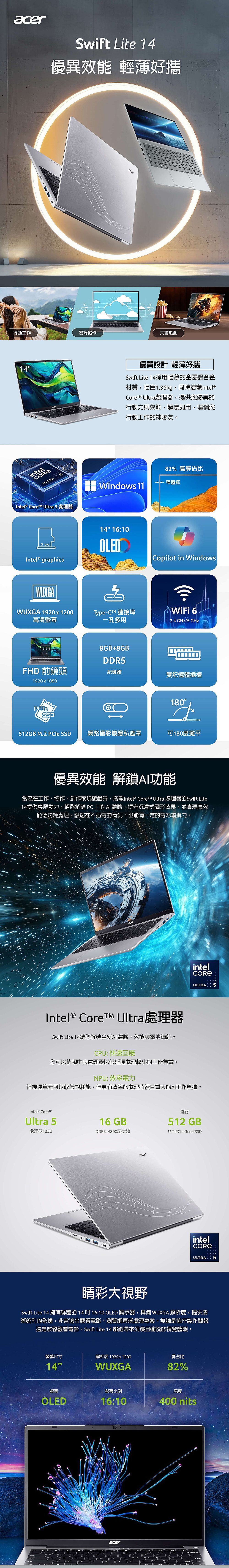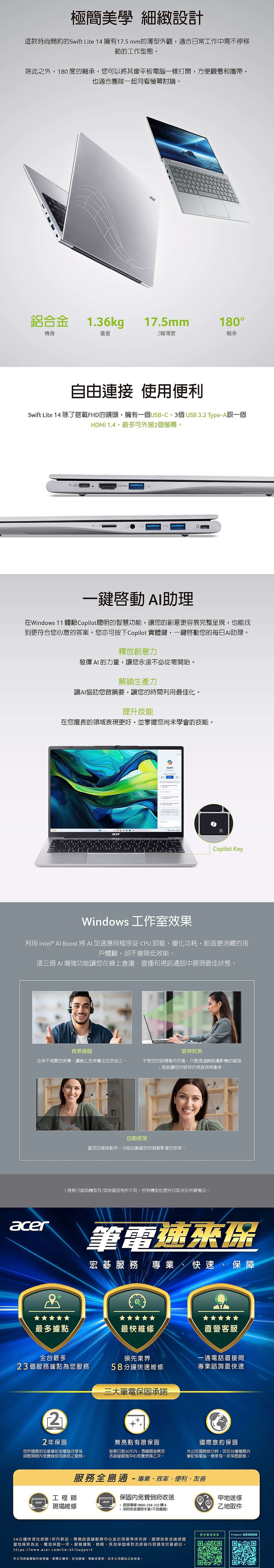 型號:SFL14-51M-50W8CPU:Intel Core Ultra 5 processor 125Uclock/Turbo:1.3 GHz/4.3 GHzCores/Threads:12/14L3 Cache:12 MB尺寸/規格:14" 16:10/IPS/霧面/LED背光解析度:WUXGA 1920 x 1200色域:NTSC 45%亮度:300 nits顯示晶片:Intel graphicsVRAM:N散熱設計風扇:1熱導管:1記憶體實際出貨:8G(Onboard)+8GB DDR5,共16GB支援容量(總插槽數量/總容量):2/32GB儲存空間實際出貨:512GB PCIe Gen4 SSD支援擴充空間(包含已安裝部分):M.2 SSD *1光碟機:Nbuilt in speaker:YBuilt-in microphone:Y鍵盤:無背光Webcam:2M FHD Camera無線網路:Wi-Fi 6802.11a/b/g/n/acDual Band: 2.4 GHz/5 GHz2x2 MU-MIMO藍牙:Bluetooth 5.1區域網路RJ-45:NKensington lock slot :Y尺寸(mm) :314.4 (W) x 221.9 (D) x 17.5/17.5 (H) mm材質:A蓋鋁合金重量:1.33 kg電源變壓器 :65W TypeC電池:58Wh Li-ion batteryCard Reader:Y(microSD Card reader)USB Type-C:1(USB 3.2 Gen 2)(DisplayPort)Type-C 支援影像傳輸:YUSB Type-A:3(USB 3.2 Gen 1)HDMI:Y(HDMI 1.4)External display (VGA) port:NDisPlay Port:N可外接螢幕數量:2耳機/喇叭輸出:Y(與耳機/喇叭輸出共用jack)麥克風輸入:Y(與耳機/喇叭輸出共用jack)指紋辨識:NTPM:N保固:台灣2年附贈配件:滑鼠/包包*** 請注意:本機不含 Microsoft® Office 授權/需自行另購 ***以上規格僅供參考,若有錯誤,請以原廠官網公布為準
