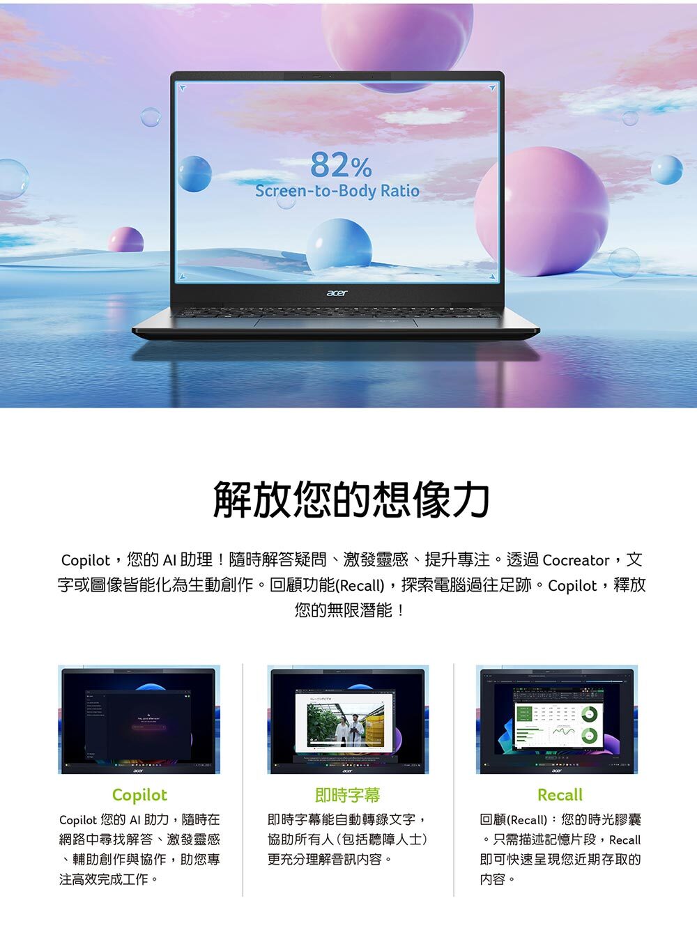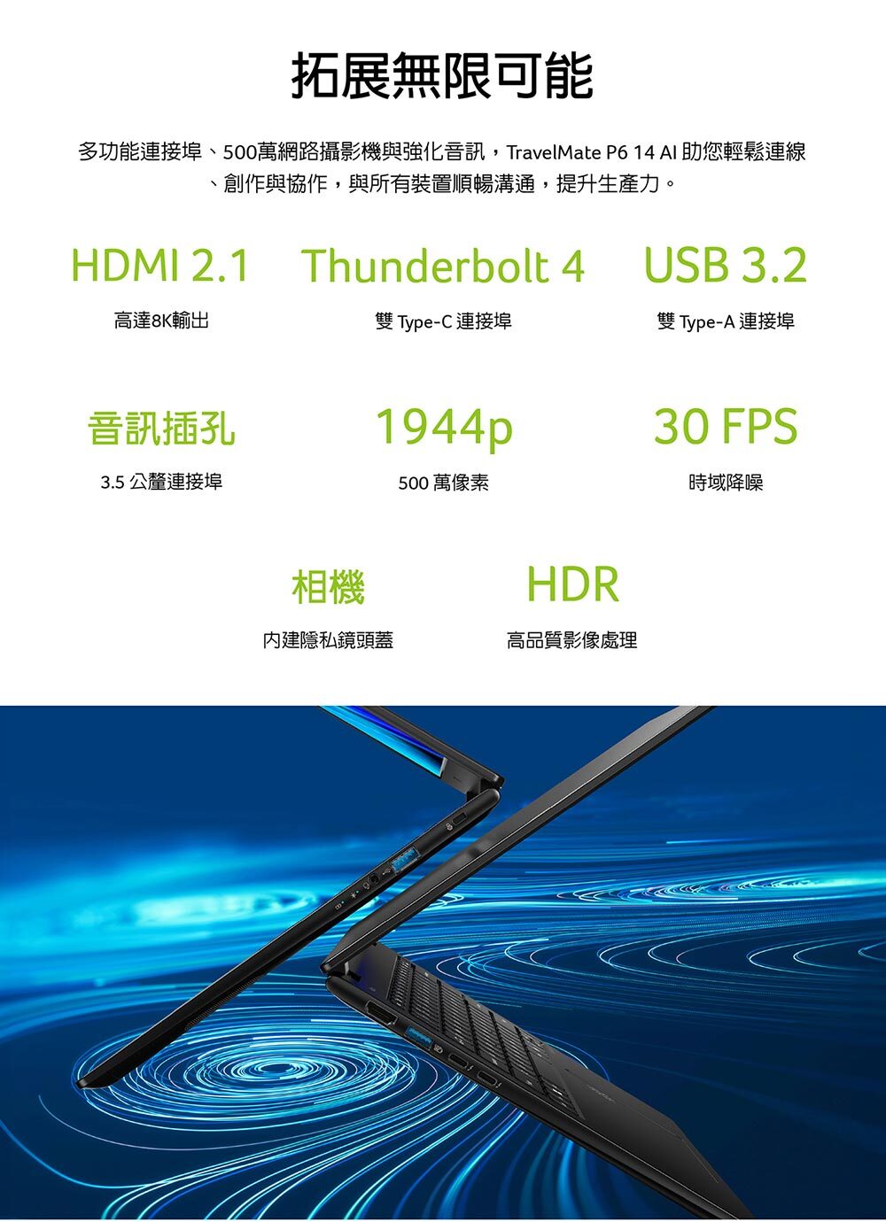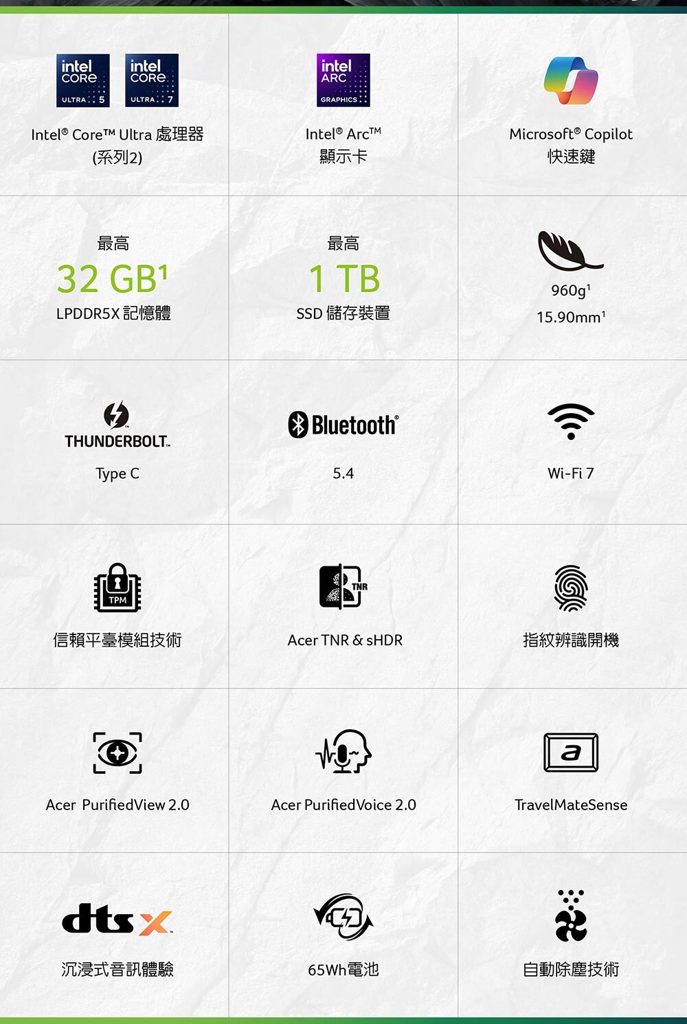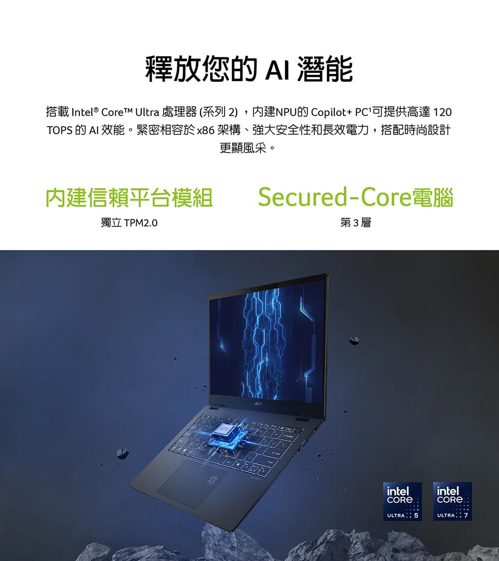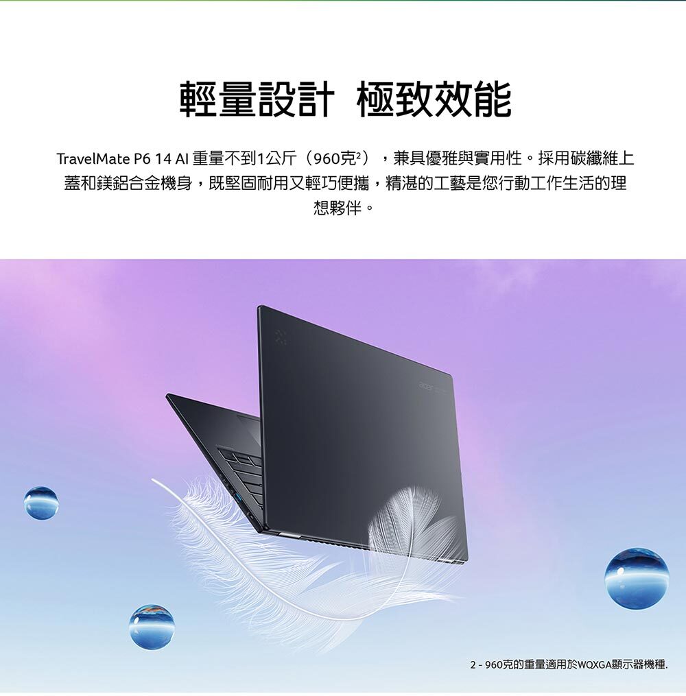 商品規格產品型號:TMP614-54-7518顏色:黑LCD 尺寸:14" WQXGA IPS解析度:2880 x 1800作業系統:Windows 11 Pro處理器:Intel® Core™ Ultra 7 processor 258V顯示晶片:Intel® ARC™ Graphics 140VVRAM:N/A記憶體:OB32GB LPDDRX5(可擴充插槽數量/總容量):0/32GB硬碟:1T PCIe NVMe SSD支援擴充空間(含已安裝部分):M.2 SSD*1光碟機:NCard Reader:NSmart Card Reader:N無線網路:Intel® Wi-Fi 7 Wireless LAN藍牙:WLAN support BT5.4指紋辨識:YTPM安全晶片:Y (韌體)Kensington lock slot:YWebcam 前:2880 x 1800電池:65Wh電源變壓器:100W尺寸:313.6 (W) x 227.1 (D) x 15.9/16.65 (H) mm重量:960g(3 Cell)Battery Life:Up to 14.5 hoursUSB Port:USB3.2 Gen 1 *2 / Type C*2(Thunderbolt™ 4)HDMI:Y區域網路 (RJ45):NExternal display (VGA) port:N耳機/喇叭輸出:Y麥克風輸入:Y音效_內建揚聲器:Y音效_內建麥克風:Y音效_其他:兩組內建揚聲器數位麥克風保固:台灣3年,1年國際旅約貨源:公司貨*** 請注意:本機不含 Microsoft® Office 授權/需自行另購 ***以上規格僅供參考,若有錯誤,請以原廠官網公布為準