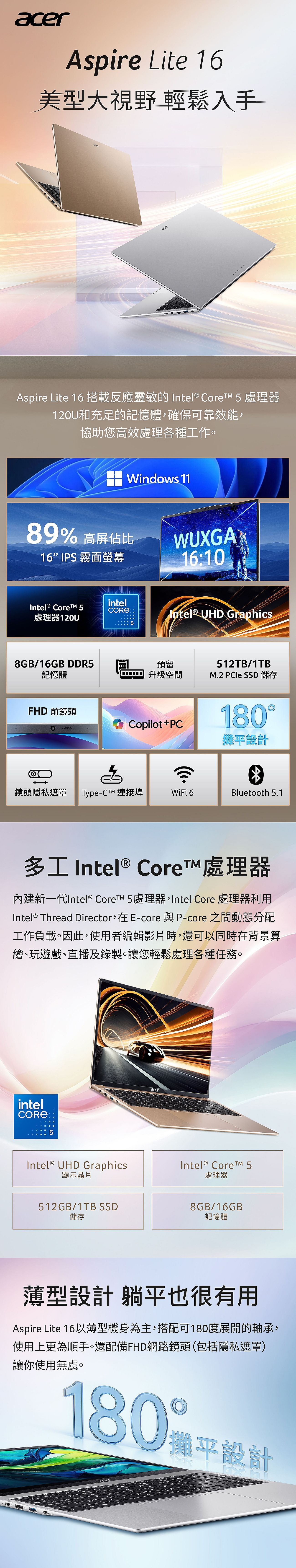 商品規格作業系統:Windows 11 HomeCPU:Intel® Core™ 5 processor 120U晶片組:N尺寸/規格:16" 16:10/IPS/霧面/LED背光解析度:WUXGA 1920 x 1200色域:NTSC 45%亮度:300 nits顯示晶片:Intel® UHD GraphicsVRAM:N實際出貨:8GB DDR5支援容量(總插槽數量/總容量):2/32GB實際出貨:512GB PCIe Gen4 SSD支援擴充空間(包含已安裝部分):M.2 SSD *2光碟機:Nbuilt in speaker:YBuilt-in microphone:Y鍵盤:無背光Webcam:2M Full HD Camera"無線網路:Intel® Wireless Wi-Fi 6 AX201802.11a/b/g/n/acR2+ax wireless LANDual Band (2.4 GHz and 5 GHz)2x2 MU-MIMO藍牙:Bluetooth® 5.1區域網路RJ-45:YKensington lock slot:Y尺寸(mm):357.8 (W) x 244.8 (D) x 18.9/18.9 (H) mm材質:塑膠重量:1.53 kg電源變壓器:65W TypeC電池:58Wh battery可外接螢幕數量:2耳機/喇叭輸出:Y(與耳機/喇叭輸出共用jack)麥克風輸入:Y(與耳機/喇叭輸出共用jack)安全指紋辨識:NTPM:N保固:台灣2年附贈配件:不附鼠包貨源:公司貨*以上規格僅供參考,若有錯誤,請以原廠官網公布為準。