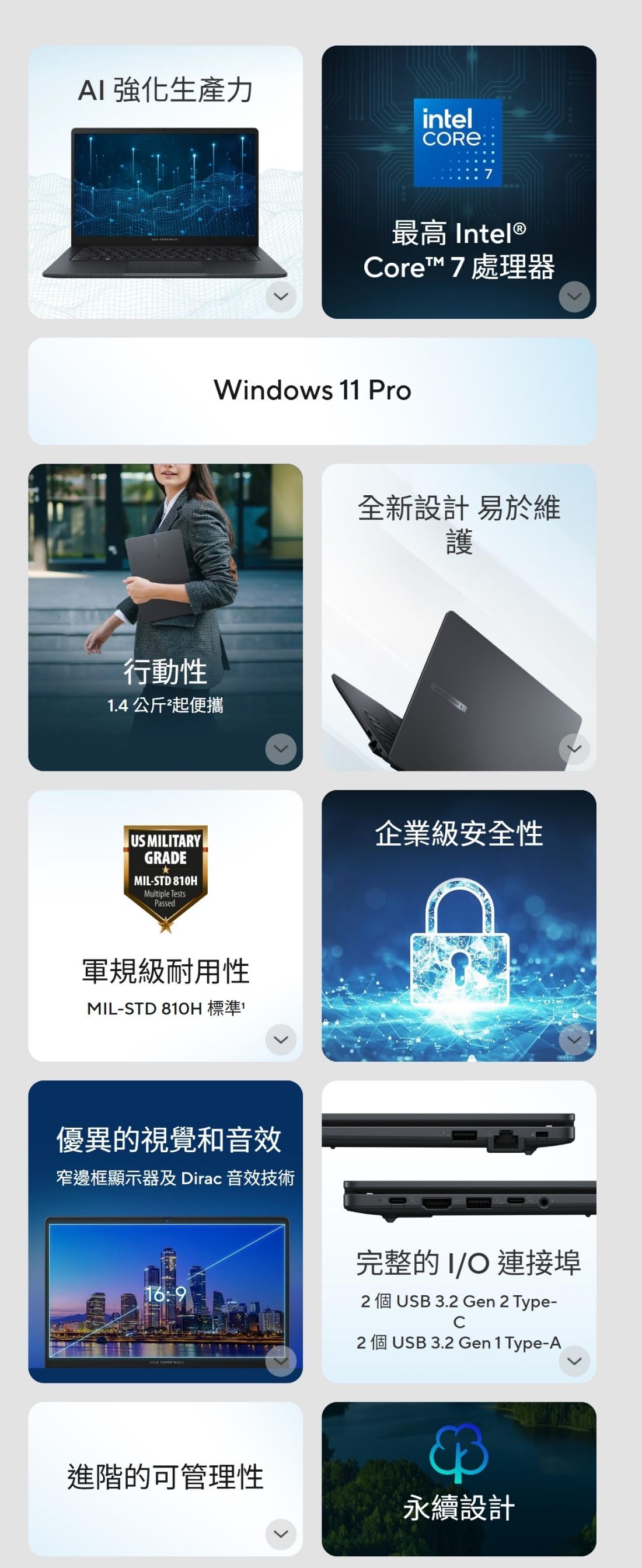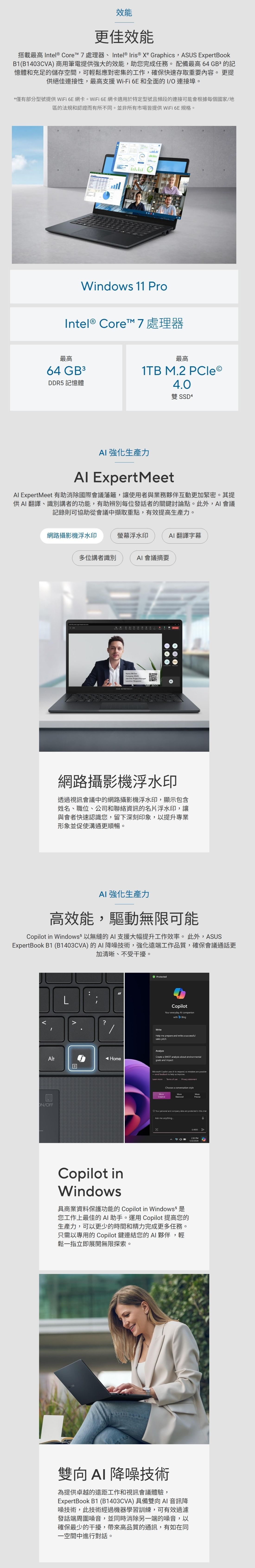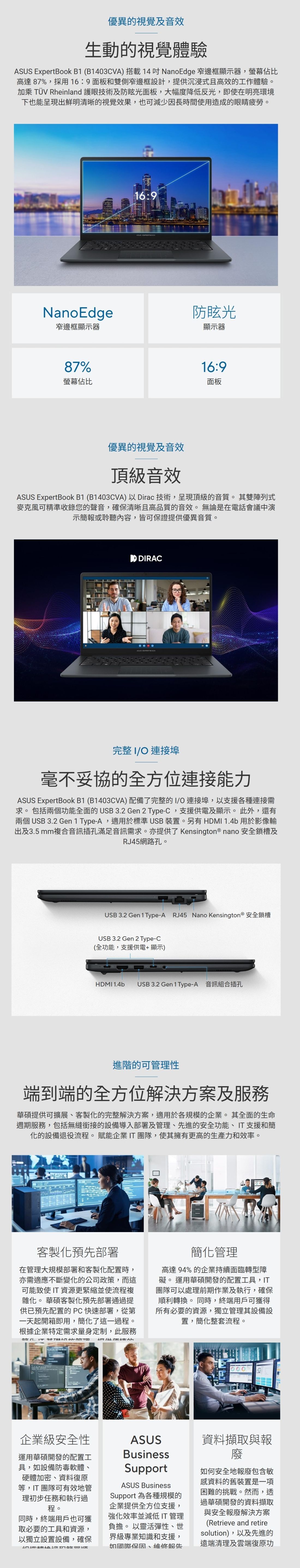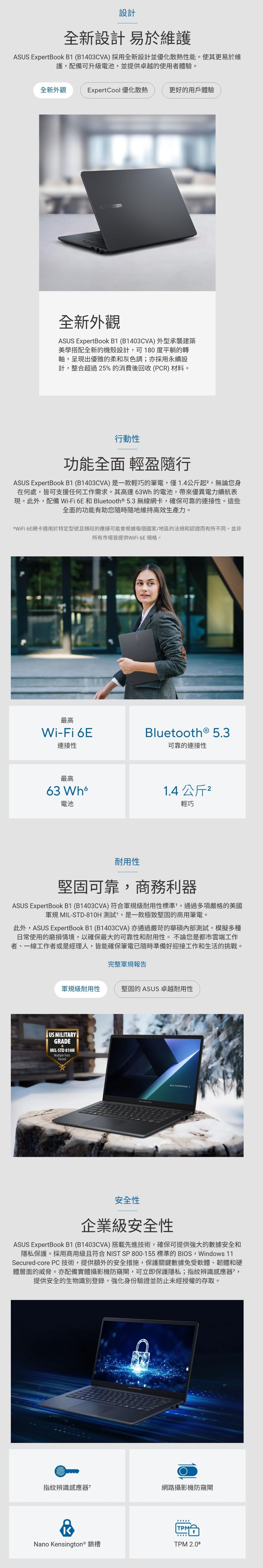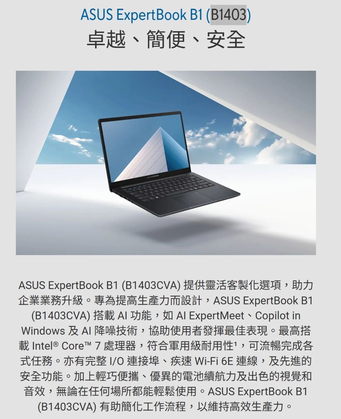 ASUS ExpertBook B1 (B1403CVA) 提供靈活客製化選項,助力企業業務升級。專為提高生產力而設計,ASUS ExpertBook B1 (B1403CVA) 搭載 AI 功能,如 AI ExpertMeet、Copilot in Windows 及 AI 降噪技術,協助使用者發揮最佳表現。最高搭載 Intel® Core™ 7 處理器,符合軍用級耐用性1,可流暢完成各式任務。亦有完整 I/O 連接埠、疾速 Wi-Fi 6E 連線,及先進的安全功能。加上輕巧便攜、優異的電池續航力及出色的視覺和音效,無論在任何場所都能輕鬆使用。ASUS ExpertBook B1 (B1403CVA) 有助簡化工作流程,以維持高效生產力
