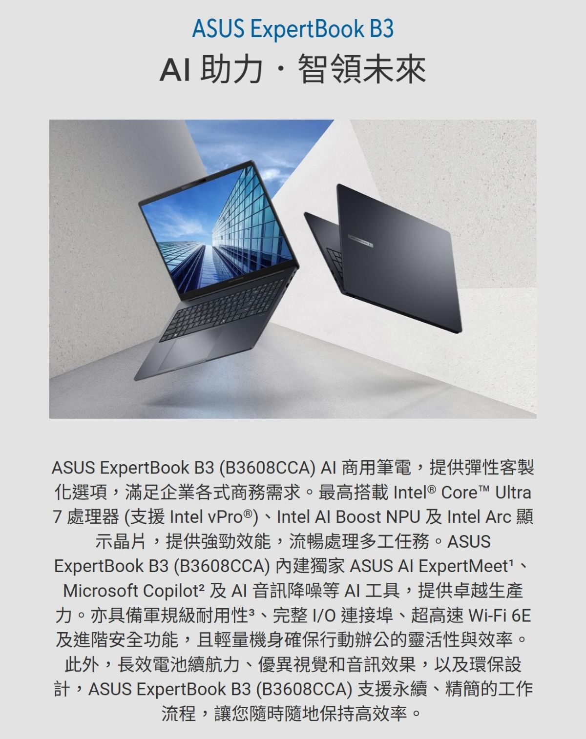 型號:B3608CCA-0041A125H處理器 :Intel® Core™ Ultra 5 處理器 125H 1.2 GHz (18MB 快取, 最高 4.5 GHz, 14 核心) ; Intel® AI Boost NPU作業系統:Windows 11 Pro螢幕規格:16.0 吋, WUXGA (1920 x 1200) 16:10, 防眩光, IPS, 廣視角, 300 尼特, 60Hz, NTSC: 45%, 非觸控螢幕顯示卡:Intel® Graphics(H系列CPU 配置16G以上雙通道記憶體可支援Intel® Arc™ graphics)記憶體(內建/最大) :16GB DDR5 SO-DIMM ; (2x DDR5 SO-DIMM slots ,可升級 )最高64GB DDR5儲存空間:512GB M.2 2230 NVMe™ PCIe® 4.0 SSD ; +擴充 500G M.2 2280 SSD(LTE/5G 版將無法額外安裝2230 SSD)WLAN無線網路:Wi-Fi 6E(802.11ax) (Dual band) 2*2 + Bluetooth® 5.3 Wireless Card區域網路(RJ45): 1 x RJ45 乙太網路光碟機:無WEBCAM網路攝影機:1080p FHD , 紅外線攝影機支援 Windows Hello, 實體防窺閘輸入輸出介面(I/O):2x USB 3.2 Gen 1 Type-A2x USB 3.2 Gen 2 Type-C 支援顯示/供電1 x RJ45 Gigabit EthernetMicro SD 卡讀卡機智慧卡讀卡機1x HDMI 2.1 TMDS1 x 3.5mm 音訊複合插孔指紋辨識:Y (與電源鍵整合)TPM 安全晶片:Y (TPM2.0)Kensington Lock: Y尺寸(寬x深x高) :35.84 x 25.39 x 1.89 ~ 1.90公分重量(公斤) :1.78 公斤 (含 50 WHrs電池)附贈配件:攜帶包 , 有線光學滑鼠(USB)保固:三年保固(含電池) ,到府維修電池:50WHrs, 3S1P, 3-cell Li-ion電源系統:TYPE-C, 65W AC 變壓器貨源:公司貨*** 請注意:本機不含 Microsoft® Office 授權/需自行另購 ***< 文案中相關圖文及說明,僅供參考,規格配置依機型不同有所差異,請以實際商品為準 >
