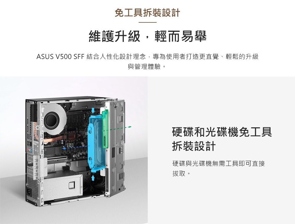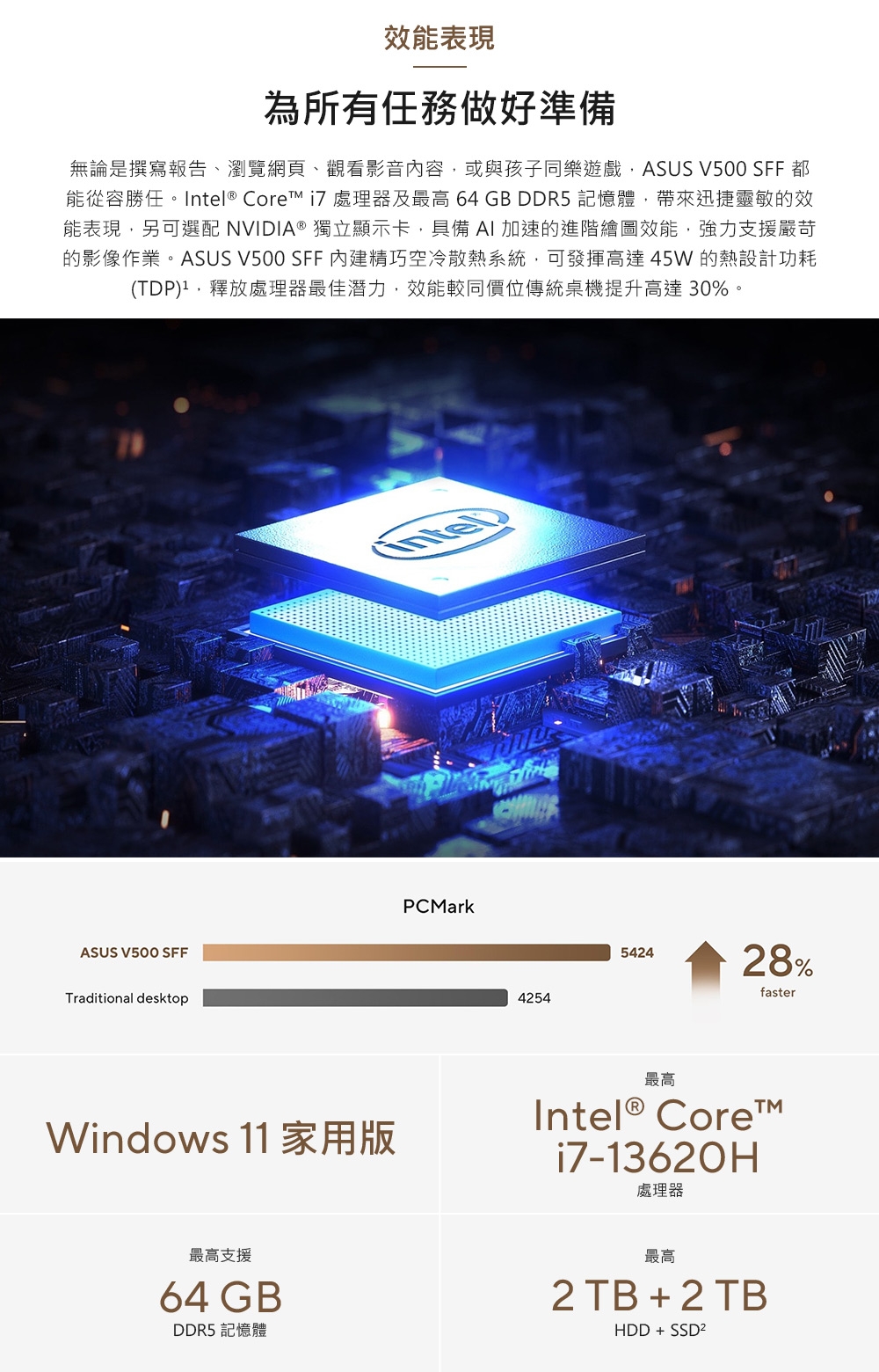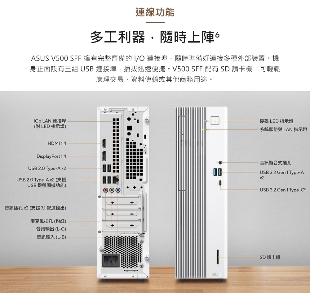 商品規格處理器:Intel Core i3-1315U主機板晶片組:Intel記憶體:8GB DDR5 SO-DIMM(筆記型短版)記憶體支援容量 : 總插槽數量 2 / 最高容量64G)硬碟:512GB M.2 2280 NVMe PCIe 4.0 SSD(擴充硬碟需自行購買螺絲)顯示介面:Intel UHD Graphics光碟機:無讀卡機:無鍵鼠組:有音效:High Definition 7.1 Channel Audio螢幕輸出介面:HDMI.DP無線網路:Wi-Fi 6(802.11ax) (Dual band) 1*1 + Bluetooth 5.4 Wireless Card有線網路:Intel WGI219V 10/100/1000 Mbps, non-vPro電源供應:180W power supply (80+ Bronze, peak 228W)作業系統:Windows 11 家用版保固:原廠三年保固/到府收送(免費第一年到府維修)(原廠於保固期內將自行或委託第三方到府收送)●前端介面1x 3.5mm combo audio jack1x USB 3.2 Gen 1 Type-C2x USB 3.2 Gen 1 Type-A●後端介面1x RJ45 Gigabit Ethernet1x HDMI 1.41x Displayport 1.41x 7.1 channel audio (microphone, line-out, Line-in)1x Kensington lock4x USB 2.0 Type-A●擴充介面(含已使用)3.5" x 12 x SATA 6.0Gb/s ports1x M.2 connector for WiFi2x M.2 2280 connector for storage2x DDR5 SO-DIMM 記憶體插槽(筆記型用短版)(最高支援容量64G)注意:記憶體速度時脈頻率,根據處理器設定而降低。●商品尺寸體積(公分):15.50 x 29.60 x 34.70 cm重量:6.00 kg貨源:公司貨*** 請注意:本機不含 Microsoft® Office 授權/需自行另購 ***以上規格僅供參考,若有錯誤,請以原廠官網公布為準