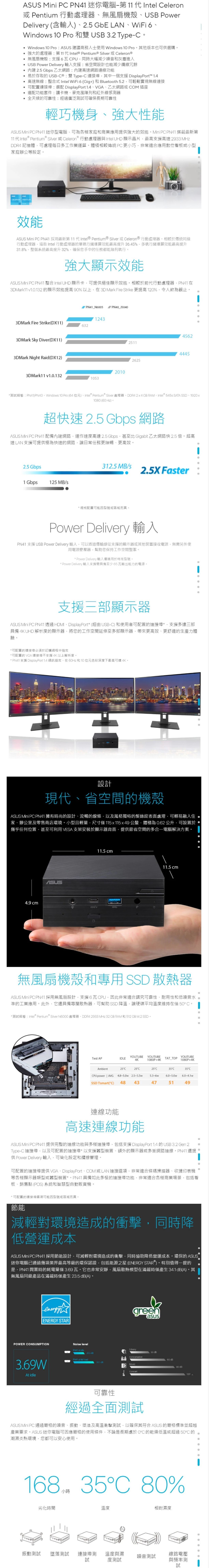 處理器:Intel Celeron N4505主機板晶片組:Integrated記憶體:8GB DDR4 3200MHz + (4G+4G)硬碟:500GB M.2 NVMe™ PCIe® SSD顯示介面:Integrated - Intel® UHD Graphics光碟機:無讀卡機:無鍵鼠組:無音效:內建螢幕輸出介面:D-Sub(VGA).HDMI無線網路:Intel® Wi-Fi 6 (Gig+), Bluetooth® 5.0有線網路:10/100/1000/2500 Mbps, 2.5G LAN電源供應:19Vdc, 3.42A, 65W Power Adapter作業系統:Windows 11 專業版 (64 bit)保固:原廠一年保固(零件/人工/收送)●前端介面1 x USB 3.2 Gen2 Type-C(w/ quick charge)1 x USB 3.2 Gen1 Type-A1 x Audio Jack1 x Kensington Lock(side)●擴充介面(含已使用)1 x USB 3.2 Gen1 Type-C (w/ DP output, PD-in)2 x USB 3.2 Gen1 Type-A1 x HDMI1 x 2.5G RJ45 LAN1 x DC-in1 x VGA Port體積:115 x 115 x 49 mm重量:700g (include 2.5" HDD)標準配備:無鍵盤滑鼠