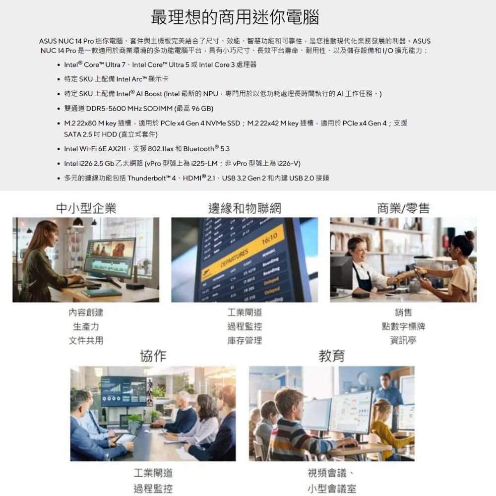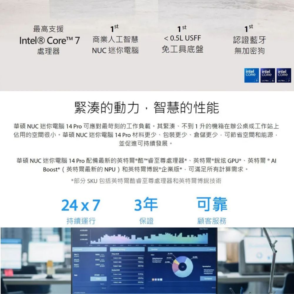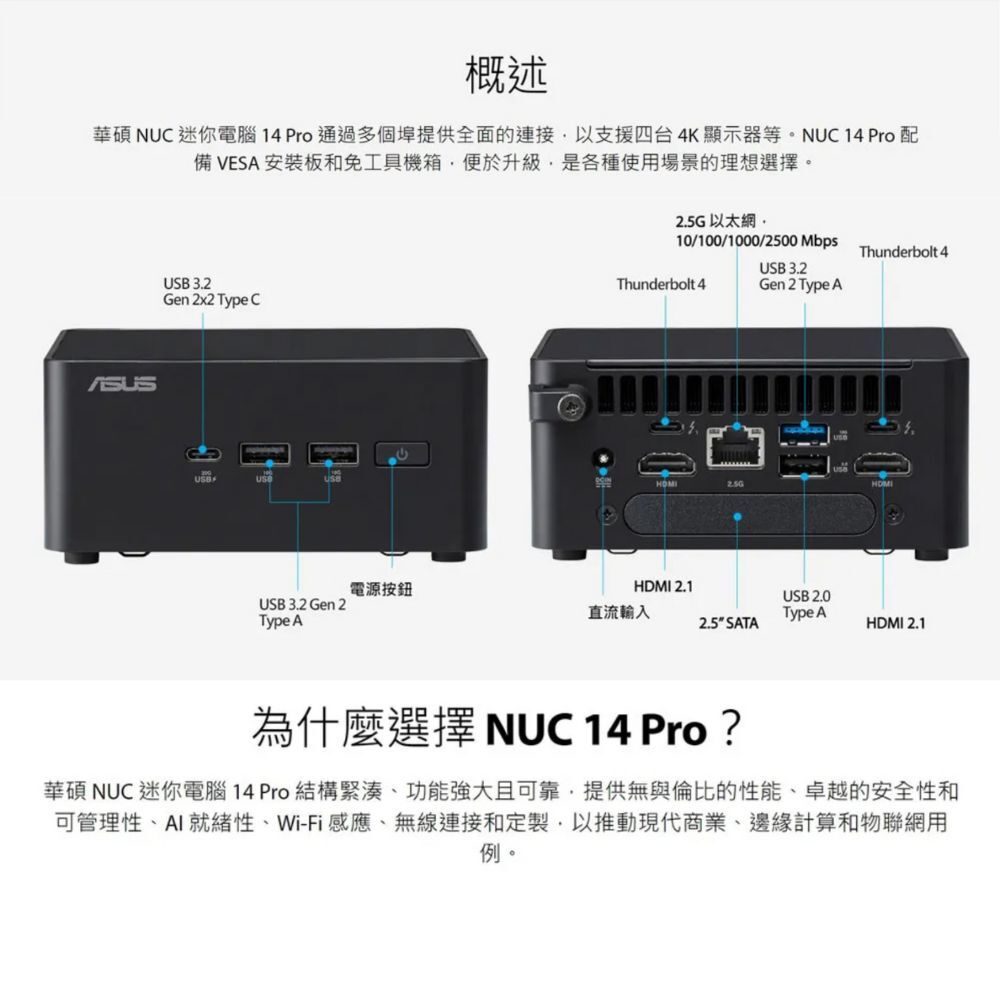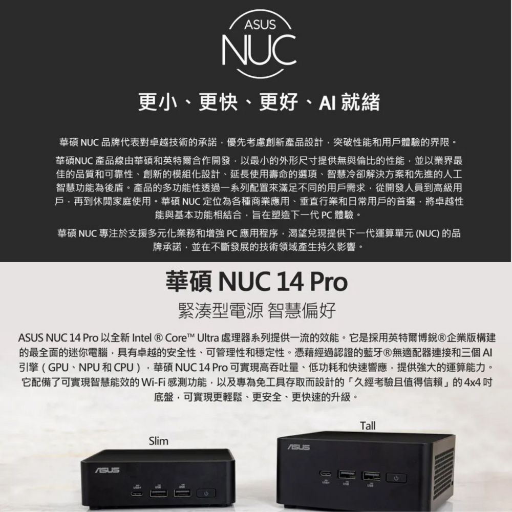 商品規格產品型號:ASUS NUC 14 Pro RNUC14RVHU7058A9處 理 器:Intel® Core™ Ultra 7 155H記 憶 體:8G*1 DDR5-5600 / 2個插槽,可加購擴充,Max 48GB硬 碟:512GB M.2 PCIE 2280 NVMe™ PCIe® 4.0 x 4 SSD顯示晶片:Intel® Arc™ GPU音 效:High Definition 7.1 Channel Audio螢幕輸出:HDMI.Thunderbolt™ 4區域網路:Intel® Ethernet Controller I226-V/LM, 2.5G無線網路:Intel® Wi-Fi 6E AX211, 2x2, and Bluetooth® 5.3電源供應:120W Power Adapter重 量:600g體 積:117 x 112 x 54 mm作業系統:Windows 11 Home配 件:無 (鍵盤滑鼠需另購買)保 固:原廠三年保固/到府收送貨 源:公司貨備 註:以上規格僅供參考,如有任何問題,請依原廠公告為主。