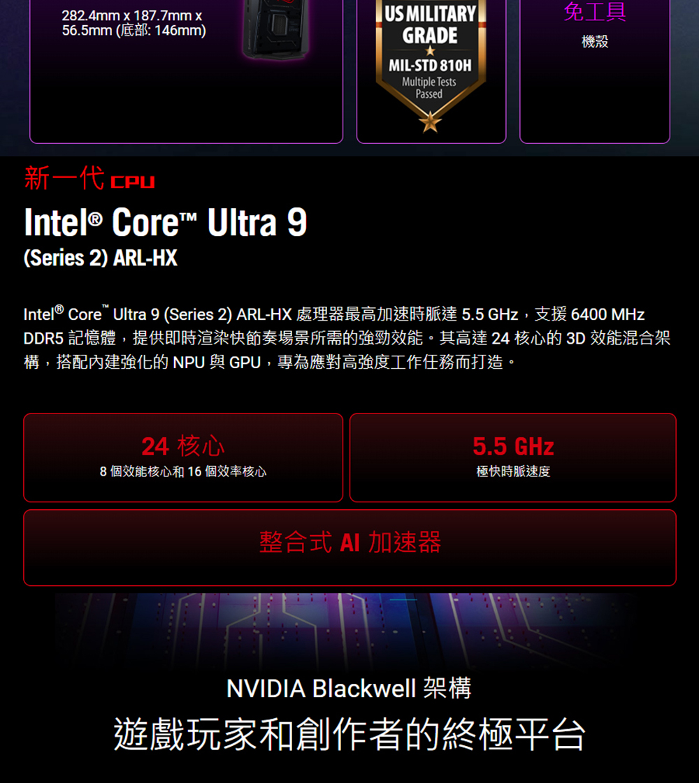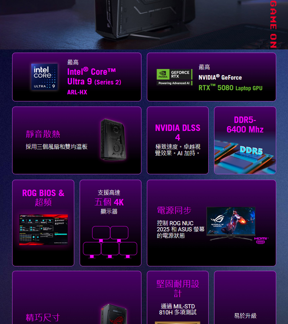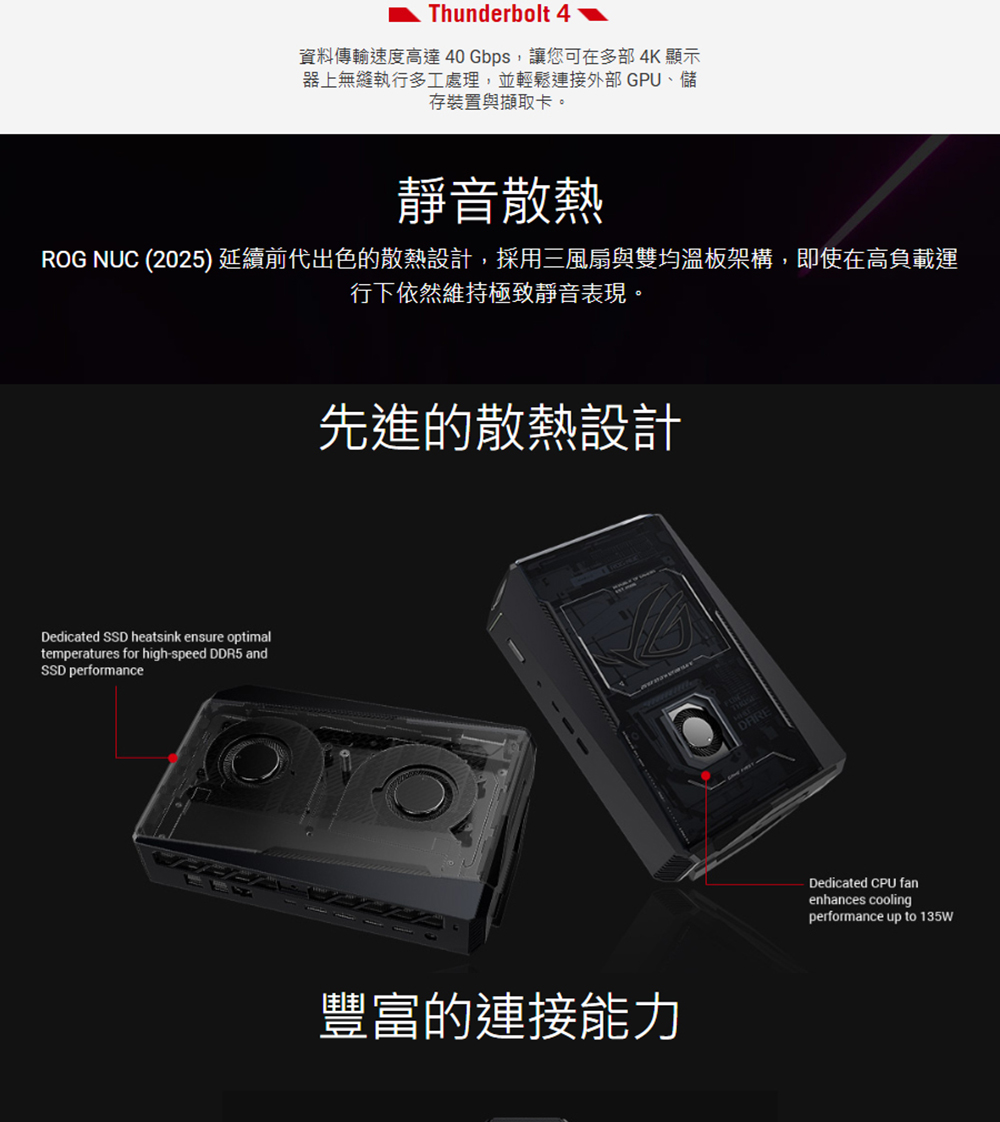 ASUS 華碩 RNUC15JNK9X28AA9規格說明CPU:Intel® Core™Ultra 9 275HX (2.7GHz/Turbo 5.4GHz)(Cache 36MB)記憶體:32GB(16G*2) DDR5硬碟:2TB M.2 PCIE 2280 NVMe™ PCIe® 4.0 x 4 SSD作業系統:Windows 11 HOME顯示卡 / 繪圖支援:NVIDIA® GeForce RTX™ 5080 Laptop GPU區域網路:Intel® 2.5 Gb Ethernet port無線網路:Intel® Wi-Fi 7 BE200, Bluetooth 5.4介面 前(側)置:2 x USB 3.2Gen2 Ports1 x USB-C後置:1 x Thunderbolt™ 4 / USB4 Type-C port with DP 2.1 and (5V@3A / 5V@1.5A / 9V@2A / 12V@1.5A) fast charging profiles2 x HDMI Ports2 x DP Ports4 x USB 3.2 Gen2 Ports尺寸:282.4mm x 187.7mm x 56.5mm (bottom: 146mm)重量:3.12 KG保固:原廠三年貨源:公司貨