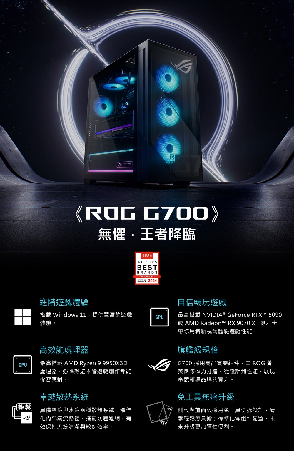 商品規格作業系統:Windows 11 Home處理器:AMD Ryzen™ 7 8700F Processor 4.1 GHz晶片組:AMD® B650 Chipset顯示晶片:AMD® Radeon™ RX 9060 XT PRIME 16GB GDDR6 OC : 2xDP, 1x HDMI記憶體:16GB DDR5 U-DIMM x 2 記憶體最高64GB硬碟:1TB M.2 2280 NVMe™ PCIe® 4.0 SSD前面板輸出端子1x 耳機1x 麥克風輸入2x USB 3.2 Gen 1 Type-A1x USB 3.2 Gen 2 Type-C後面板輸出端子1x RJ45 Gigabit 乙太網路接口1x HDMI 1.41x Display port 1.43 x 音源接口4x USB 2.0 Type-A1x USB 3.2 Gen 2 Type-A2x USB 3.2 Gen 1 Type-A1x USB 3.2 Gen 2 Type-C擴充槽(包含已使用)1x PCIe® 4.0 x 163x PCIe® 4.0 x 162x M.2 2280 connector for storage4x DDR5 U-DIMM slot音訊:高傳真 7.1 聲道音效電源規格:600W power supply (80+ Gold, peak 600W)重量:18.00 kg (39.68 lbs)產品尺寸:(寬x長x高)24.00 x 50.92 x 47.96 cm (9.45" x 20.05" x 18.88")保固:2年保固貨源:公司貨*** 請注意:本機不含 Microsoft® Office 授權/需自行另購 ***以上規格僅供參考,若有錯誤,請以原廠官網公布為準