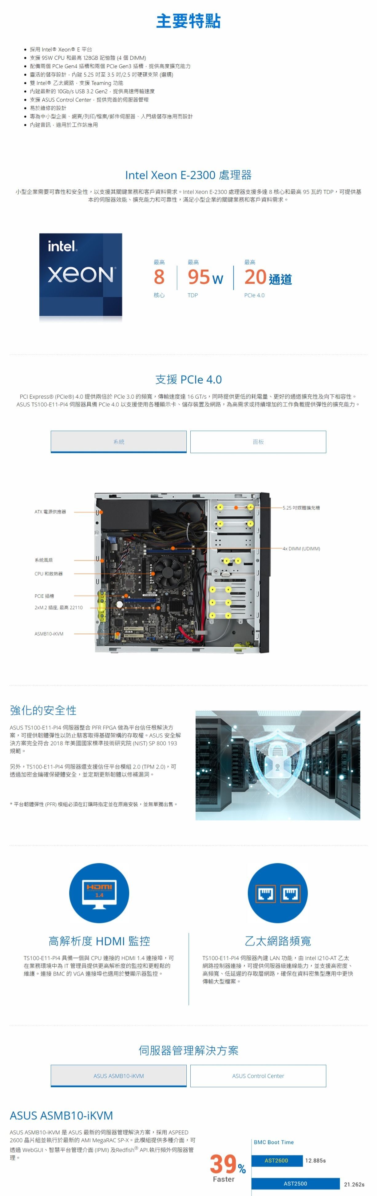 Intel® Xeon® E 工作負載最佳化伺服器靈活的儲存擴充能力●中央處理器:IIntel Xeon E-2334 8M快取, 3.4GHz最大超頻4.8GHz, 四核心, 單CPU●處理器數量(出廠配置):1●處理器數量(最大擴充):1●晶片組:Intel C256 Chipset●顯示晶片: Aspeed AST2510 with 64MB (僅支援VGA)●作業系統:選購●記憶體:32G DDR4 3200 ECC UDIMM (實際運行DDR4 2666)插槽x4,最大支援128GB●硬碟機:2TB SATA3 7200rpm(企業級)●硬碟機數量(標準/最大):3 x Internal 3.5″ (or 2 x 2.5” optional cage) drive bays 1 x Internal 2.5″ drive bay 2 x M.2 (Up to 22110) Gen4 x4 Link and Gen3 x2 Link gray SATA port will disable when M.2 is SATA signal●光碟機:DVD-RW●磁碟控制器:SATA 控制器: Intel C256 Chipset 8 x SATA3 6Gb/s ports●I/O傳輸介面(前面板):2 x USB 3.0 ports 2 x USB 2.0 ports 1 x Headphone port 1 x Microphone port(後面板):2 x USB 3.2 Gen2 ports 2 x USB 3.2 Gen1 ports 1 x VGA port (support by ASMB10)1 x HDMI port from CPU (useable only with iGPU) 2 x LAN Ports 1 x PS/2 Keyboard/ Mouse Port●網路功能:2 x Intel I210AT + 1 x Mgmt LAN●擴充槽數量:2 x PCI-E x4 slot, x8 Gen3 Link 1 x PCI-E x8 slot, x8 Gen4 Link 1 x PCI-E x16 slot, x16 Gen4 Link (Auto switch to x8 link if slot 4 is occupied )●尺寸:423mm x 190mm x 435mm 16.65″ x 7.48″ x 17.1″●電源供應器:500W 80PLUS Single Power Supply, Gold Rating: 100-127/220-240Vac, 6/3A, 60-50Hz, Class I●機構型式:Tower●特別說明:KVM遠端管理模組/TPM安全晶片●配件:附USB鍵盤/USB滑鼠●保固期限:3年