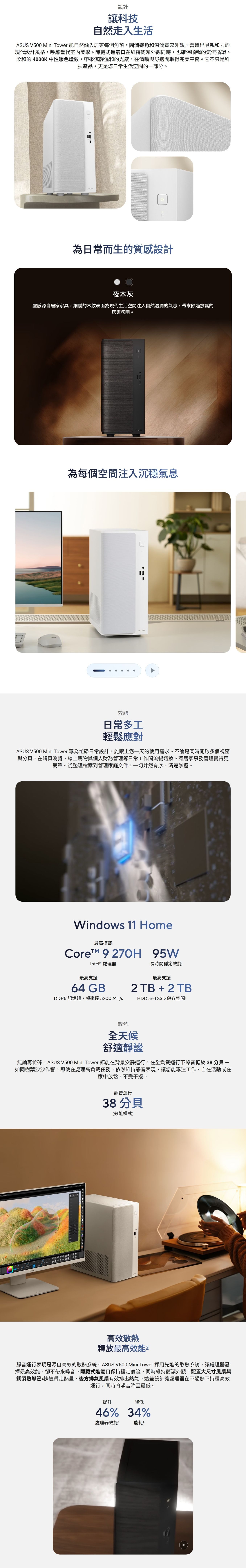 商品規格處理器:Intel® Core™ 9 Processor 270H 2.5 GHz記憶體:16GB DDR5 SO-DIMM, 2x DDR5 SO-DIMM slot,記憶體最高64GB硬碟:1TB M.2 2280 NVMe™ PCIe® 4.0 SSD電源供應:330W作業系統:Win11家用版區域網路:Wi-Fi 6(802.11ax) (Dual band) 1*1 + Bluetooth® 5.4 Wireless Card前面板輸出端子1x 耳機1x USB 3.2 Gen 1 Type-C2x USB 3.2 Gen 1 Type-A1 x 3.5mm 複合音源線插孔2x USB 3.2 Gen 2 Type-A1 x USB 3.2 Gen 1 Type-C2 x USB 3.2 Gen 1 Type-A後面板輸出端子1x RJ45 GB 乙太網路1x HDMI 1.41 x Display port 1.41 x 7.1 聲道音效 (3 個連接埠)1x Kensington 鎖4 x USB 2.0 Type-A擴充槽(包含已使用)1x PCIe® 4.0 x 16 (operating at PCIe® 4.0 x8)2x M.2 2280 connector for storage1 x WiFi ( M.2 插孔 )2x DDR5 SO-DIMM slot音訊:高傳真 7.1 聲道音效重量:6.00 kg (13.23 lbs)產品尺寸 (寬x長x高):15.55 x 30.17 x 35.68 cm (6.12" x 11.88" x 14.05")安全性Kensington 防盜鎖插槽HDD User Password Protection and Security包裝盒內容:有線光學滑鼠 (USB)有線鍵盤 (USB)3.5 吋 HDD 裝配組合:VGA cable assembly kit貨源:公司貨*** 請注意:本機不含 Microsoft® Office 授權/需自行另購 ***以上規格僅供參考,若有錯誤,請以原廠官網公布為準
