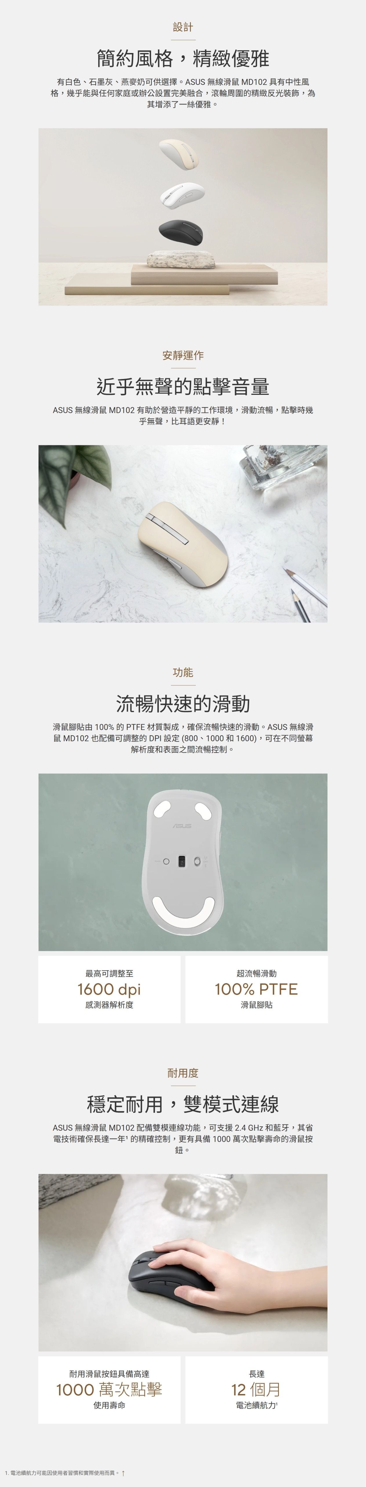 [產品規格]型號:ASUS Wireless Mouse MD102顏色:石墨灰、燕麥奶、白色連線:無線連接. Bluetooth,RF 2.4GHz射頻距離:10m追蹤:光學追蹤解析度:1600dpi1000dpi800dpi尺寸:滑鼠尺寸: 118.9mm (L) * 66.5mm (W) * 42mm (H)接收器尺寸: 19.9mm (L) * 14mm (W) * 6.6mm (H)重量:69g作業系統:Windows® 11、Chrome OS、Windows® 10包裝盒內容:保固手冊、快速入門指南、電池、接收器、滑鼠保固:一年貨源:公司貨備註說明:電池續航力可能因使用習慣與環境而有所不同。