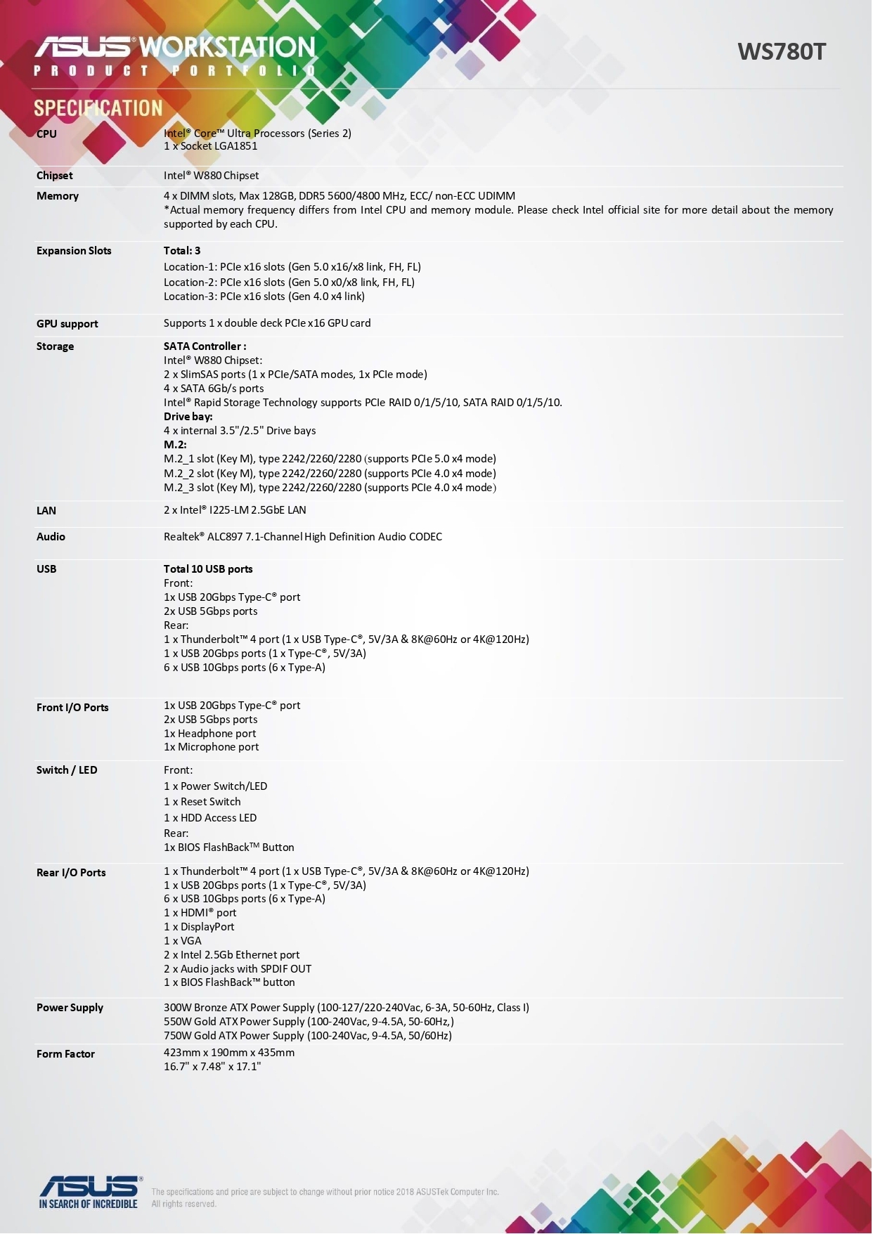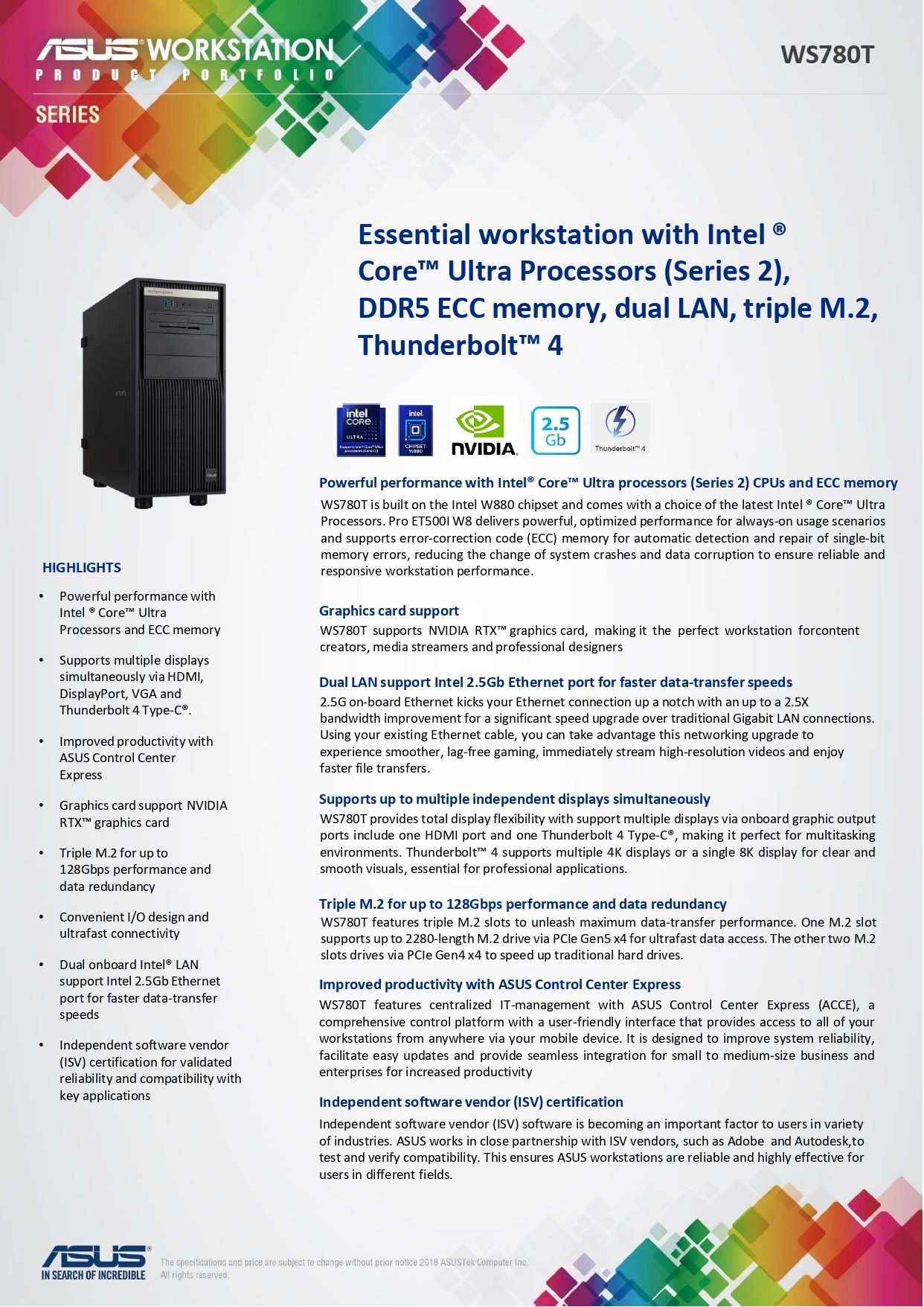 品牌: ASUS商品分類:桌上型工作站型號:WS780T料號:90WS00A2-M000A0作業系統:Windows 11 Pro處理器:Intel Core Ultra 7-265(30M 快取記憶體,最高可達5.30 GHz)晶片組:Intel W880 Chipset記憶體:16G NON-ECC DDR5-5600 (4Slots/Maximum up to 128GB UDIMM)硬碟:1TB SSD網路:2 x Intel 2.5Gb Ethernet前置 I/O 連接埠:1x USB 20Gbps Type-C® port2x USB 5Gbps ports1x Headphone port1x Microphone port後置 I/O 連接埠:1 x Thunderbolt™ 4 port (1 x USB Type-C®) from CPU iTBT1 x USB 20Gbps ports (1 x Type-C) from CPU iTBT6 x USB 10Gbps ports (6 x Type-A)1 x DisplayPort port1 x D-Sub port1 x HDMI® port2 x Intel 2.5Gb Ethernet port2 x Audio jacks with SPDIF OUT1 x BIOS FlashBack™ button光碟機:DVD-RW擴充槽:Total: 3Location-1: PCIe x16 slots (Gen 5.0 x16/x8 link, FH, FL)Location-2: PCIe x16 slots (Gen 5.0 x0/x8 link, FH, FL)Location-3: PCIe x16 slots (Gen 4.0 x4 link)* Specifications vary by CPU types.尺寸:423mm x 190mm x 435mm電源供應器:550W Gold ATX Power Supply (100-240Vac, 9-4.5A, 50-60Hz,)環境:Operation temperature: 10℃ ~ 35℃Non operation temperature: -40℃ ~ 70℃Non operation humidity: 20% ~ 90% ( Non condensing)配件:USB鍵盤/USB滑鼠保固:保固三年,3日內完修/華碩外包廠商處理貨源:公司貨< 文案中相關圖文及說明,僅供參考,規格配置依機型不同有所差異,請以實際商品為準 >