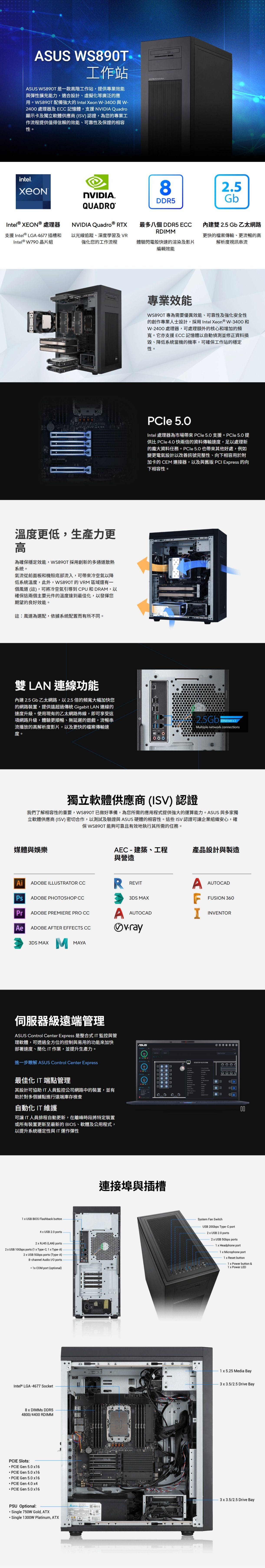 華碩工作站 WS890T系列Intel Xeon W-3400 / W-2400 處理器、Intel W790 晶片組和 DDR5-4800 ECC 記憶體,實現專業效能和穩定性支援最多兩個 NVIDIA® Quadro RTX™ 以執行 2D/3D 渲染內建雙 2.5Gb 乙太網路連接埠以提供更快速、高頻寬且低延遲的傳輸速度雙 M.2 提供最高 32 Gbps 以實現更高的效能和資料備援能力EPEAT Bronze 認證工作站,可實現更環保的環境以 USB 20 Gbps Type-C、USB 10Gbps Type A 和 C 以及 USB 5 Gbps 連接埠提供超快連線速度ASUS Control Center Express:用於強化資料保護的即時 IT 監控及管理軟體通過獨立軟體供應商 (ISV) 認證的可靠性及主要應用程式相容性