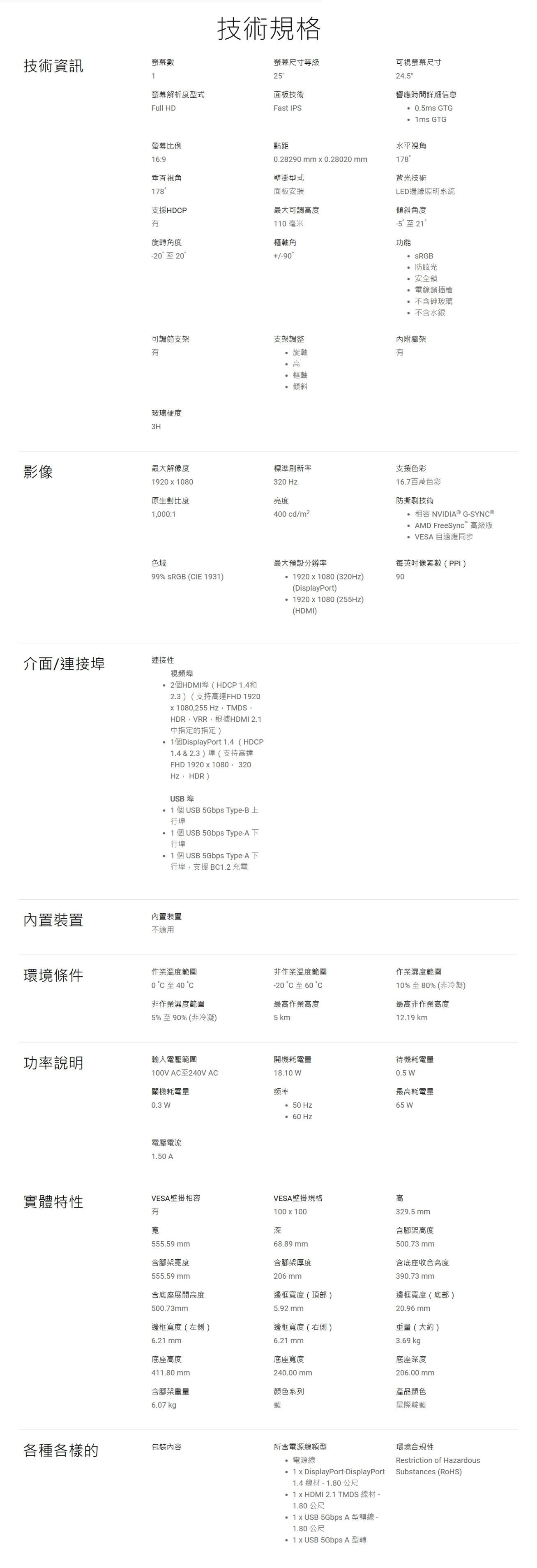 24.5 吋 320 Hz 遊戲專用顯示器配備 Fast IPS 面板、栩栩如生的色彩準確度和超流暢的視覺效果。