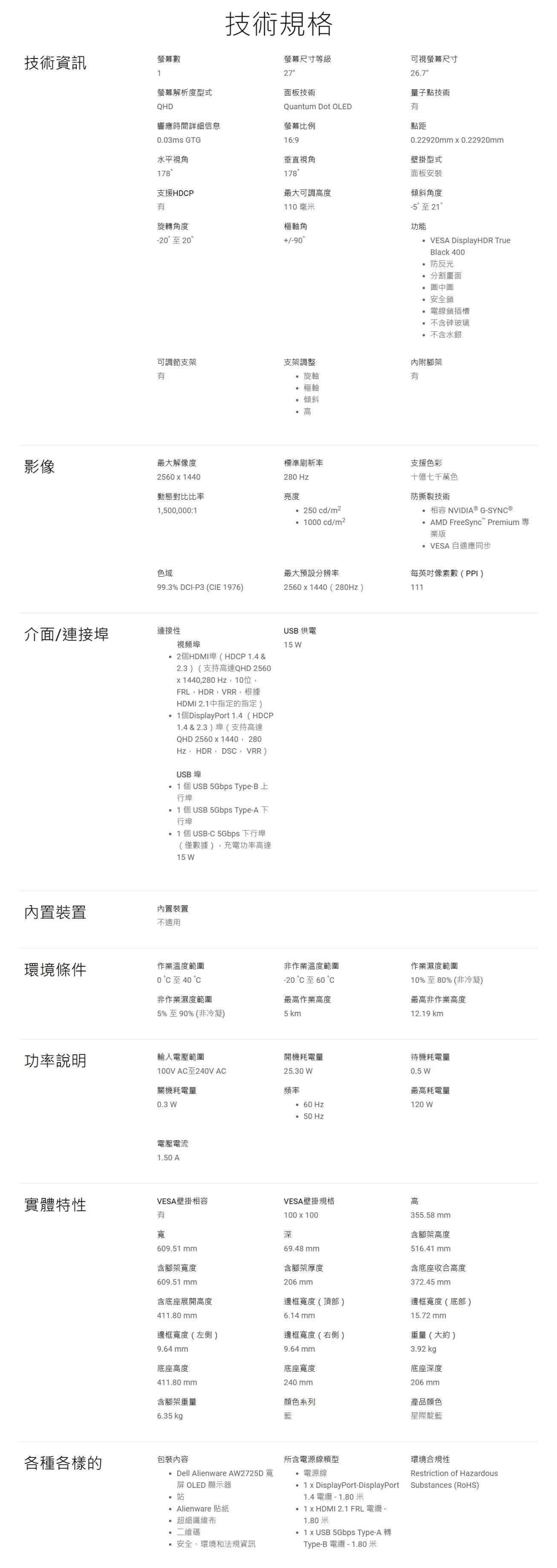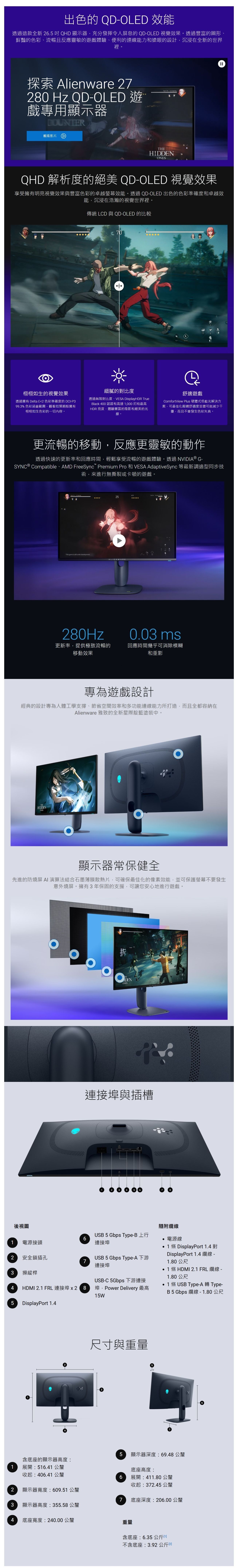 Alienware 27 吋 280 Hz QD-OLED 遊戲專用顯示器 - AW2725D