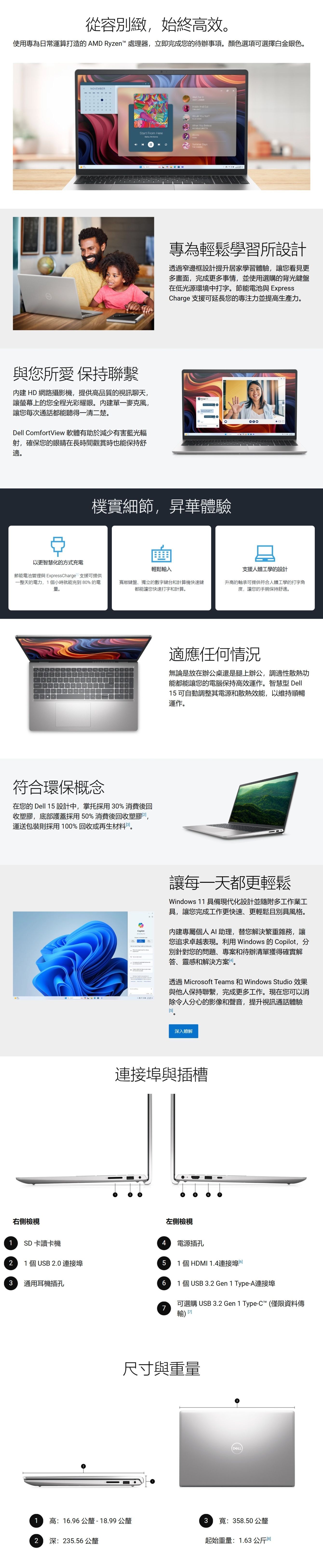 [商品規格]型號:DC15255-R1508STW處理器:AMD Ryzen™ 5 7530U 6-核 含 Radeon™ 顯卡作業系統:Windows 11 家用版視訊卡:AMD Radeon™ 顯示卡顯示器:15.6吋, 非-觸控, FHD, 120Hz, WVA, IPS, 防眩光, 250 nits, LED 背光記憶體 :16GB: 1x16GB, DDR4, 3200 MT/s儲存:512 GB, M.2, PCIe NVMe, 固態碟外殼:銀河星跡 (塑膠)照相機:720p (30 fps),HD 攝影機鍵盤:繁體中文 背光 鍵盤 含 數字鍵台音效與喇叭:立體聲喇叭,2W x 2 = 共 4W網卡(NIC) :Realtek Wi-Fi 5 RTL8821CE, 1x1, 802.11ac, MU-MIMO, 藍牙® 無線卡主要電池:3 芯電池, 41 瓦時, 整合電源:65 瓦特交流電源適配器掌托:白金銀掌托不含指紋辨識器連接埠:1 個 USB 2.0 連接埠1 個 通用耳機插孔1 個 電源插孔1 個 HDMI 1.4連接埠1 個 USB 3.2 Gen 1 Type-A連接埠1 個 可選購 USB 3.2 Gen 1 Type-C™ ( 僅限資料傳輸)插槽:1 個 SD 卡讀卡機尺寸與重量:高 :16.96 公釐-18.99 公釐寬:358.50 公釐深:235.56 公釐起始重量: 1.63 公斤貨源:公司貨保固:Dell Care Plus 含 硬體 & 軟體1-2 營業日 到府 於遠端診斷後, 24 個月意外損壞服務 :None*** 請注意:本機不含 Microsoft® Office 授權/需自行另購 ***< 文案中相關圖文及說明,僅供參考,規格配置依機型不同有所差異,請以實際商品為準 >