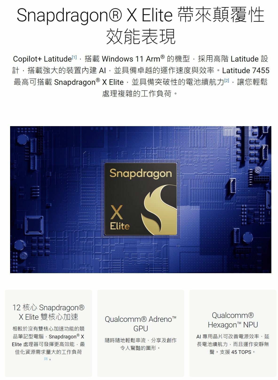 處理器:Qualcomm® Snapdragon® X Elite X1E-80-100 (12 核心 [最高 3.4 GHz],雙核心加速最高達 4.0 GHz,NPU 最高達 45 TOPS)