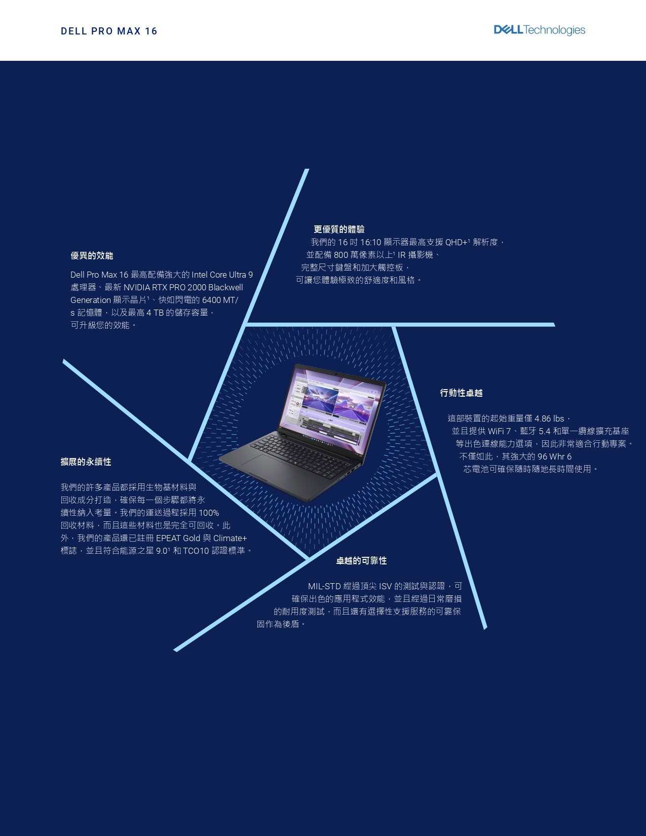 結合卓越的效能與大型顯示器,專為辦公室內或需要外出的進階使用者和輕量級設計應用程式而設計。【技術規格】型號:MC16250-U716G512G-NON顯示器:16吋 (40.6 cm),非觸控,16:10,FHD+ 1920x1200,60 Hz,防眩光,300 尼特,45% NTSC處理器:Intel® Core™ Ultra 7 265H vPro® (24 MB 快取記憶體,14 核心,14 執行緒,最高 5.30 GHz,45W)作業系統:Windows 11 專業版內建顯示卡:Intel® Graphics記憶體 :16 GB:2 條 8 GB,DDR5,5600 MT/s,SoDIMM,雙通道硬碟:512 GB,M.2 Gen4 PCIe NVMe,SSD鍵盤:磁鐵礦色中文 (繁體) 背光 (有 Copilot 鍵) 鍵盤,99 鍵手腕靠墊選項:指紋辨識器 (含 CV3)連接埠:1個通用音訊連接埠1個USB 3.2 Gen 1 Type-A (具備 PowerShare 功能)1個RJ-45 乙太網路 (1 Gbps)1個HDMI 2.11個USB 3.2 Gen 1 Type-A2個Thunderbolt™ 4,具備 Power Delivery 功能和 DisplayPort 1.4 (USB Type-C)光碟機:無插槽:1個楔形防盜鎖孔1個microSD1個智慧卡讀卡機 (需另外選購)尺寸與重量:高度 (最大):25.60 公釐高度 (正面):15.08 公釐高度 (背面):19.08 公釐深:256.00 公釐寬度:358.00 公釐起始重量:2.20 公斤電池:6 芯, 96瓦時, 鋰離子聚合物電池,支援 ExpressCharge™ 功能,長效型電源適配器:130W AC 配接卡, USB Type C觸控板:進階 Precision 觸控板,採用多點觸控手勢技術音效與喇叭:搭配 Realtek ALC1708 音訊控制器的立體聲喇叭 (2 W x 2,共 4 W)照相機:1080p (30 fps)、寬螢幕 FHD+ RGB HDR家用與小型企業安全解決方案:信賴平台模組 (TPM) 2.0 安全性無線:Intel® Wi-Fi 6E AX211,2x2,802.11ax,MU-MIMO,Bluetooth® 5.3 無線網路卡,內部天線保固:3 年保固服務 (遠端診斷後的到府/現場服務)貨源:公司貨配件:筆電包*** 請注意:本機不含 Microsoft® Office 授權/需自行另購 ****以上規格僅供參考,若有錯誤,請以原廠官網公布為準。