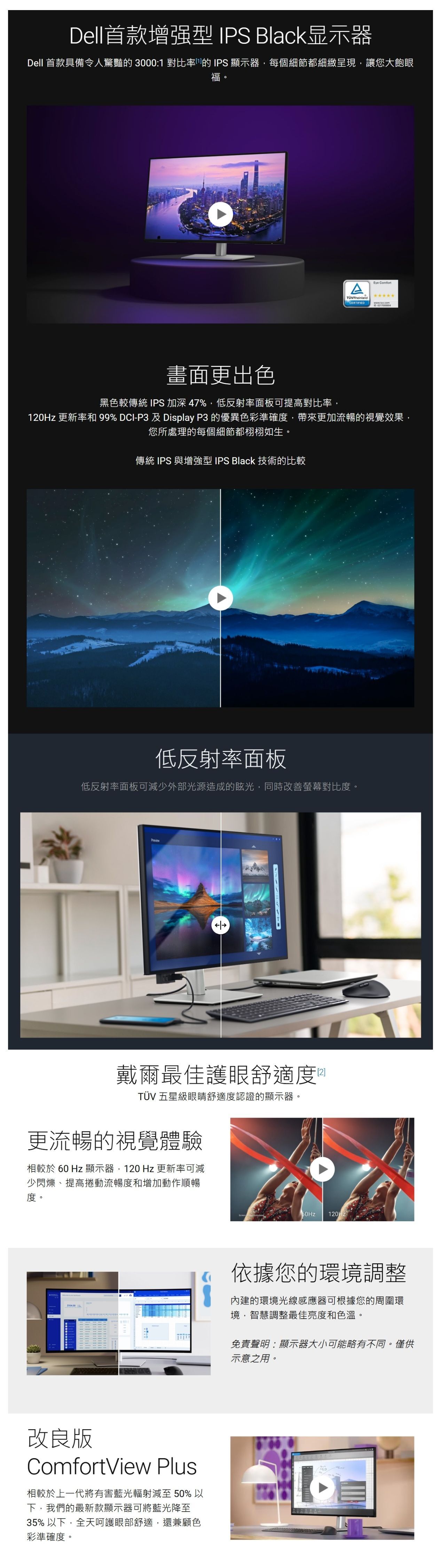 這款 27 吋顯示器為Dell 首款搭載強化 IPS Black 技術的顯示器,具備 3000:1 對比率,並透過改良版 ComfortView Plus、環境光線感應器和 120Hz 更新率,提升眼睛舒適度。