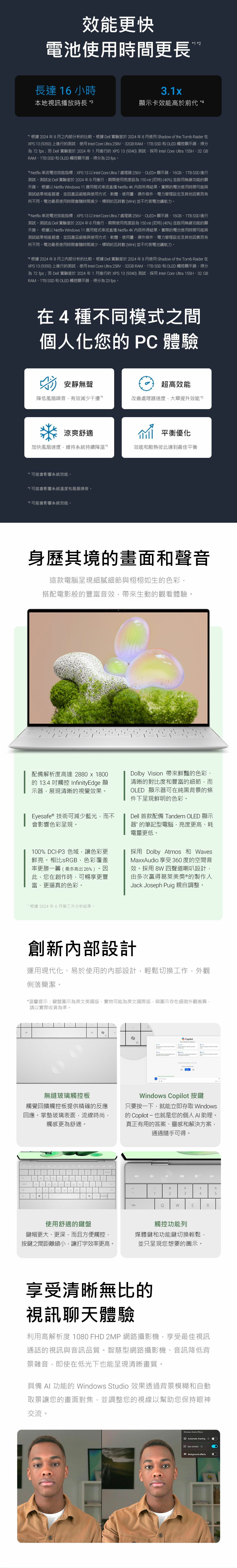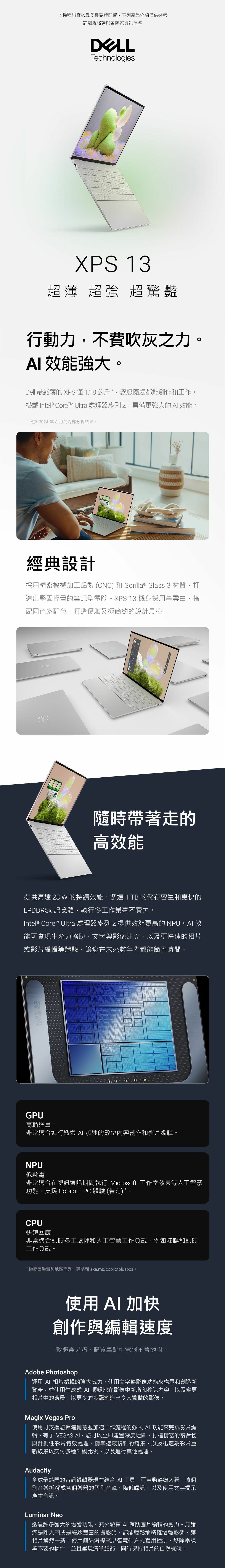 ◆ 最新 Intel® Core™ Ultra7 處理器 258V 系列◆ 內建 AI 的輕薄型電腦◆ 配備 13.4 吋 InfinityEdge OLED 觸控螢幕型號:XPS13-9350-R1808STTW