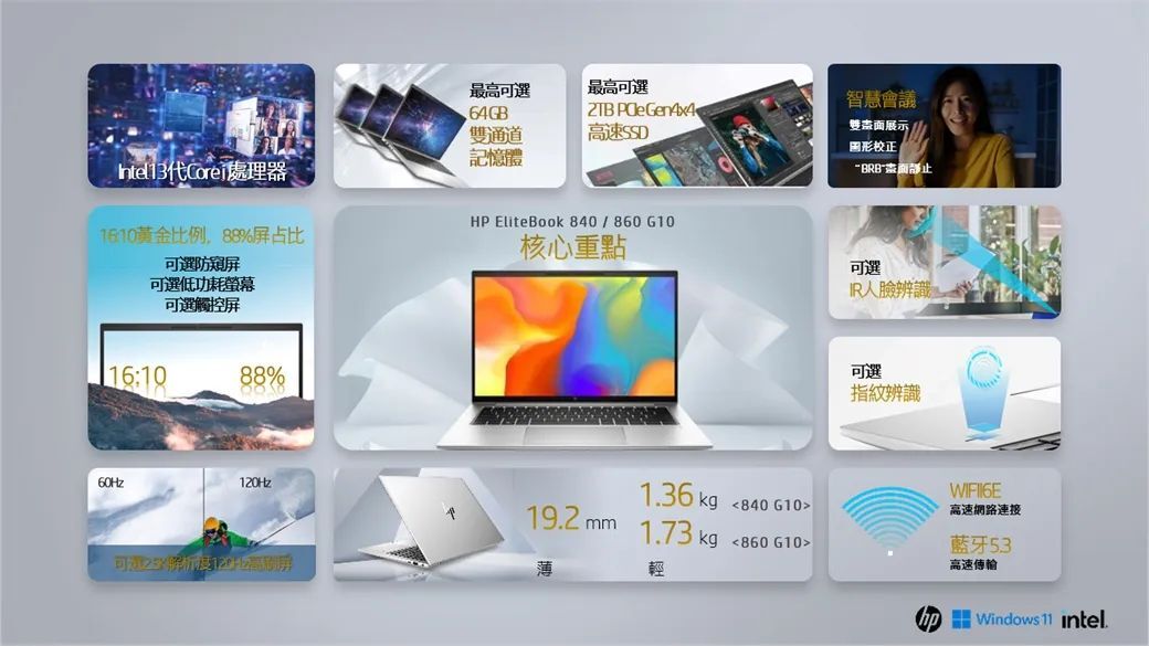 HP EliteBook 840 G10 筆記型電腦型號:HP EliteBook 840 G10料號:C9HA8ATCPU處理器:Intel Core i5-1335U(1.3 GHz base frequency, up to 4.5 GHz, 12 MB L3 cache, 10 cores, 12 threads)作業系統:Windows 11 Pro螢幕尺寸:14 吋對角線,WUXGA (1920 x 1200),16:10黃金比例,IPS,防眩光,250 尼特,45% NTSC;系統記憶體:16Gx1 DDR5 5200 / 可擴充,最大64G記憶體插槽/已佔用:2 SODIMM/1硬碟:512 GB PCIe® NVMe™ M.2 固態硬碟顯示晶片:Intel Iris Xe Graphics無線通訊功能:Intel Wi-Fi 6E AX211 (2x2) and Bluetooth 5.3 M.2 combo, vPro網路攝影機:5MP IR Camera指紋辨識器:Yes音效:Poly Studio電池類型:HP Long Life 3-cell, 51Wh配件:65W USB-C Adapter讀卡機:NFC+FPR+SmartCard左側介面:2x Thunderbolt™ 4 with USB4 Type-C® 40Gbps signaling rate (USB Power Delivery, DisplayPort™ 1.4)11x SuperSpeed USB Type-A 5Gbps signaling rate (USB 3.2 Gen 1)1x HDMI 2.11x Smart Card Reader右側介面:1x SuperSpeed USB Type-A 5Gbps signaling rate (Charging) (USB 3.2 Gen 1)1x Headphone/mic combo jack1x 安全鎖槽尺寸:31.56 x 22.40 x 1.92 cm重量:約 1.38 公斤(重量因配置而異 )保固:HP 1年標準保固 (1/1/0); 加碼贈送彩虹3C 延長保固一年貨源:公司貨*** 請注意:本機不含 Microsoft® Office 授權/需自行另購< 文案中相關圖文及說明,僅供參考,規格配置依機型不同有所差異,請以實際商品為準 >