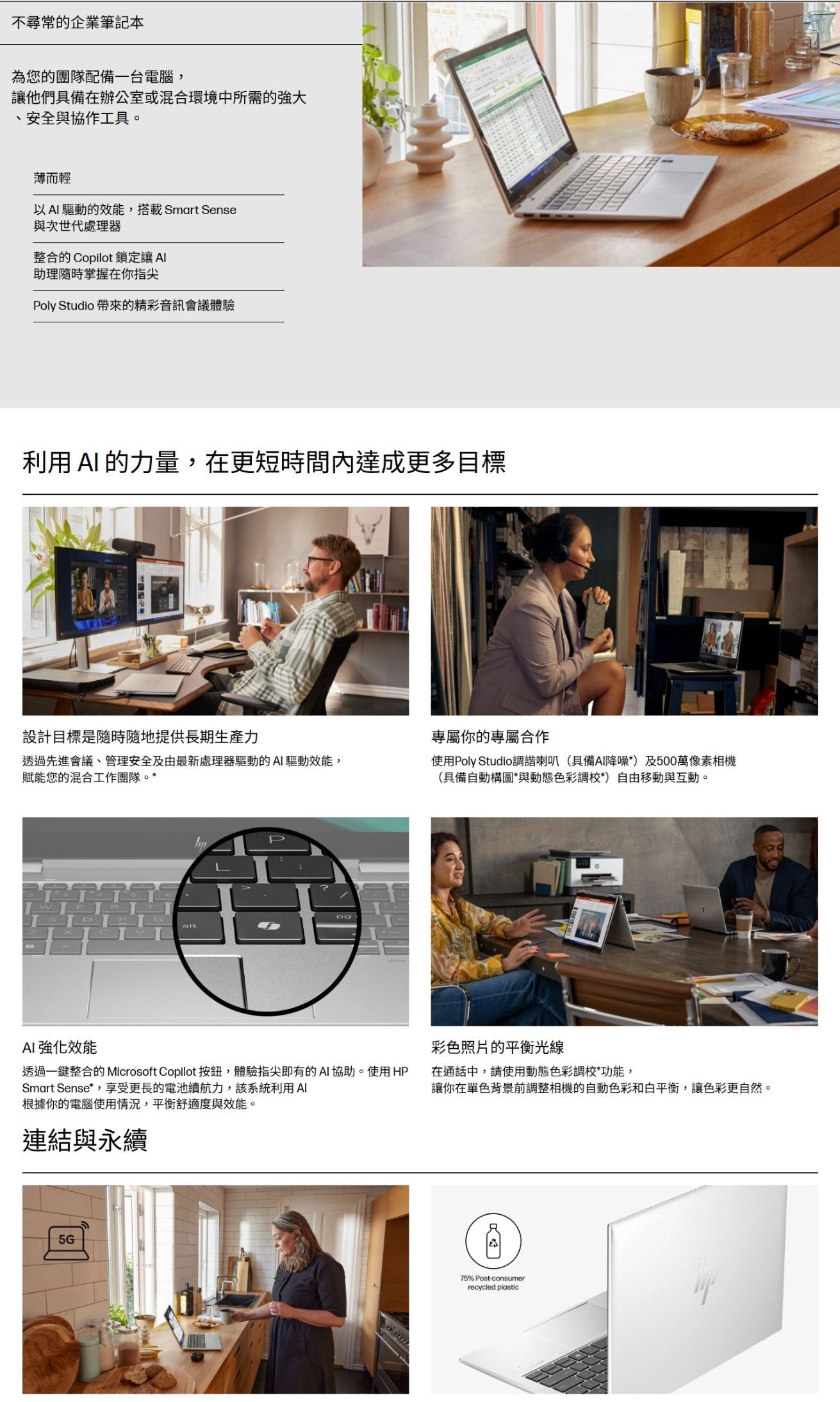 商品規格名稱: EliteBook 840 G11料號:C79YJPT螢幕:14吋 WQXGA (2560 x 1600) 霧面, WLED, 500nits, 120Hz, DCI-P3 100%, 人臉辨識處理器:Intel Core Ultra 7 155H(up to 3.8 GHz E-core Max Turbo frequency, up to 4.8 GHz P-core Max Turbo frequency,24 MB L3 cache, 6 P-cores, 8 E-cores and 2 LP E-cores ,22 threads)記憶體:16GB DDR5 5600(16GBx1) / 64GB / 2 Slot硬碟(內建/插槽):1TB SSD PCIe-4x4 2280 NVMe TLC / 1 slot顯示晶片:可達Intel Arc Graphics (系統配置需達雙通道記憶體,單通道僅為Intel Graphics)作業系統:Windows 11 Pro無線通訊功能:Intel AX211 Wi-Fi 6E 160MHz + Bluetooth 5.3電池:HP Long Life 3-cell, 56 Whr Polymer, 支援快充約30分鐘50%變壓器:65W USB-C Adapter光碟機:none (需選購外接式光碟機)左側傳輸介面:2 Thunderbolt™ 4 USB4™ Type-C® 40 Gbps USB Power Delivery DisplayPort™ 1.41 Super Speed USB Type-A 5Gbps Power charging1 HDMI 2.11 Smart Card Reader右側傳輸介面:1 Super Speed USB Type-A 5Gbps Power charging1 Headphone/mic combo jack1 安全鎖槽網路攝影機:5MP webcam + IR Camera支援臉部辨識功能 Windows Hello尺寸:31.5 x 22.4 x 1.63 cm重量:1.418 kg起 /依配備而不同指紋辨識:YesNFC:Yes音效:Poly Studio保固:1年全球有限保固(1/1/0)貨源:公司貨*** 請注意:本機不含 Microsoft® Office 授權/需自行另購 ***以上規格僅供參考,若有錯誤,請以原廠官網公布為準