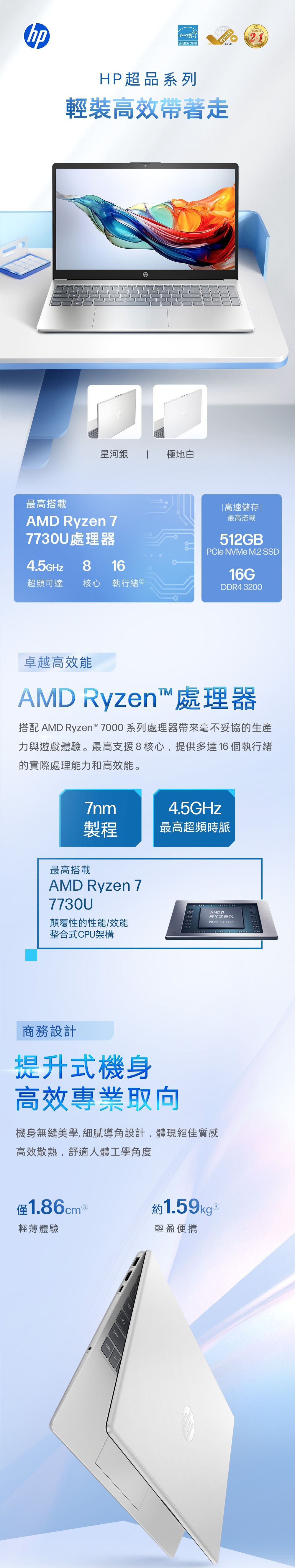 商品規格機型:15-fc0008AU顏色:星河銀處理器:AMD Ryzen 7 7730U記憶體:16GB DDR4 3200顯示晶片:AMD Radeon Graphics硬碟機/轉速:512GB SSD作業系統:Windows 11尺寸:35.98 x 23.6 x 1.86 cm重量:1.59kg螢幕:15.6吋 FHD (1920 x 1080)網路裝置:Wi-Fi 6 + 藍牙 5.4電池:3-Cell 41Whr傳輸介面:2 x USB Type-A / 1 x USB Type-C / 1 x HDMI保固:第一年國際有限 + 第二年台灣保固(包含零件與人工) / 第一年台灣本島到府收送貨源:公司貨*** 請注意:本機不含 Microsoft® Office 授權/需自行另購 ***以上規格僅供參考,若有錯誤,請以原廠官網公布為準