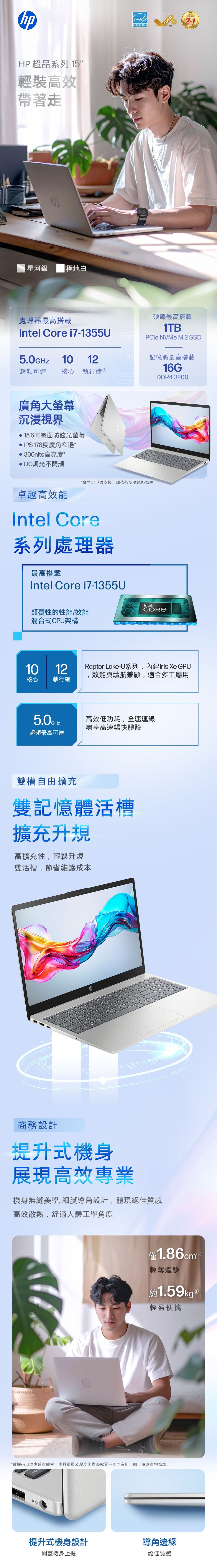 商品規格型號:15-fd0168TU顏色:極地白螢幕尺寸(吋): 15.6" FHD (1920x1080) 窄邊框超廣角螢幕, 不閃頻, 16:9, 霧面防眩光螢幕中央處理器型號: 13th Gen Intel Core i5-1334U, Intel 7/10核心(2P+8E), 12執行緒, TDP 15W重量(kg): 1.59 kg機身尺寸: 35.9 x 23.6 x 1.86 cm晶片組: Intel Integrated SoC記憶體容量: 16GB DDR4 3200 / 2 插槽固態硬碟: 512GB PCIe NVMe M.2 SSD顯示晶片卡型號: Intel Integrated Graphics無線網路: WiFi 6 / 802.11 ax 2x2電池容量(cell/mAh.): 標配 3cell 41WHr支援快速充電: Yes (45mins 50%)power adapter: 45W光碟機: No內建網路攝影機: HP TrueVision FHD 1080p, 鏡頭開關鍵觸控板: Yes (多點觸控手勢)獨立數字鍵盤: Yes背光鍵盤: Yes鍵盤顏色: C面銀色, 鍵帽灰色I/O連接埠:USB 2.0: NoUSB-A (3.2 Gen1): 2 x 5Gbps (Data Transfer Only)USB-C (3.2 Gen1): 1 x 5Gbps (Data Transfer Only)USB 埠支援 sleep充電: NoHDMI: HDMI v1.4b (最高支援 1920x1080 @60Hz 外接輸出)支援 Miracast 技術: Yes喇叭/音效技術: Dual Speakers內建麥克風: 雙陣列數位麥克風指紋辨識器: No讀卡機: NoRJ-45: No藍芽: Bluetooth 5.3感應器裝置: No作業系統: Windows 11售後保固服務: 第一年國際有限 + 第二年台灣保固(含零件與人工) / 第一年台灣本島到府收送備註: EPEAT 2.0 / Energy Star 8.0貨源:公司貨*** 請注意:本機不含 Microsoft® Office 授權/需自行另購 ***以上規格僅供參考,若有錯誤,請以原廠官網公布為準
