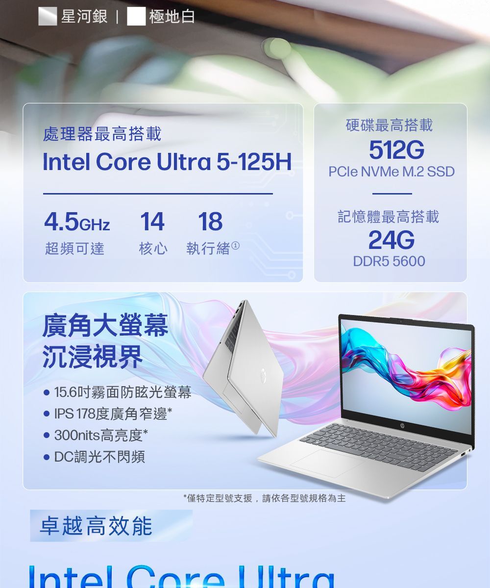 商品規格型號:Laptop 15-fd1535TU作業系統:Windows 11螢幕:15.6吋 FHD,1920x1080,IPS,16:9,霧面防眩光螢幕支援多點觸控:No處理器:Intel Core Ultra 5-125H硬碟:512 GB PCIe NVMe M.2 SSD記憶體:16GB DDR5 5600 MT/s顯示晶片:Intel Arc Graphics光碟機:無內建網路攝影機:720p True Vision TNR傳輸介面:USB 3.2 Gen 2 (3.1 Gen 2) Type-C ports quantity*1,HDMI 1.4b,電池:41 Wh 6.25 h 65 W網路通訊功能:Wi-Fi 6 (802.11ax) 2×2 + Bluetooth 5.4獨立數字鍵盤:Yes背光鍵盤:Yes指紋辨識:Yes顏色:星河銀重量:1.65kg尺寸:359.8 x 236 x 18.6 mm保固:售後保固服務第一年國際有限 (包含零件與人工)/第一年台灣本島到府收送貨源:公司貨*** 請注意:本機不含 Microsoft® Office 授權/需自行另購 ***以上規格僅供參考,若有錯誤,請以原廠官網公布為準