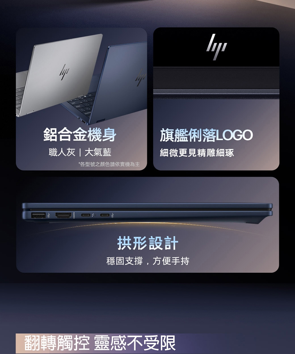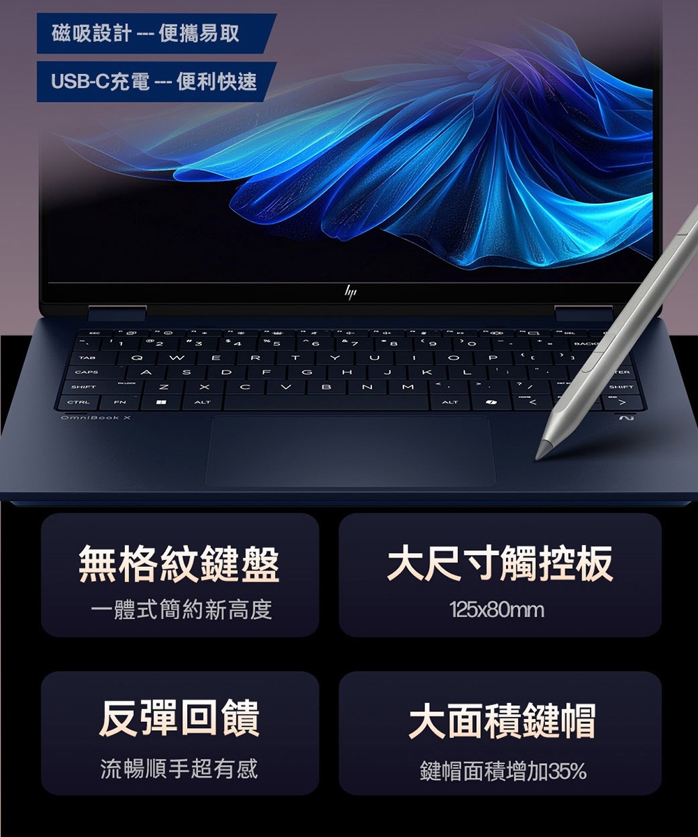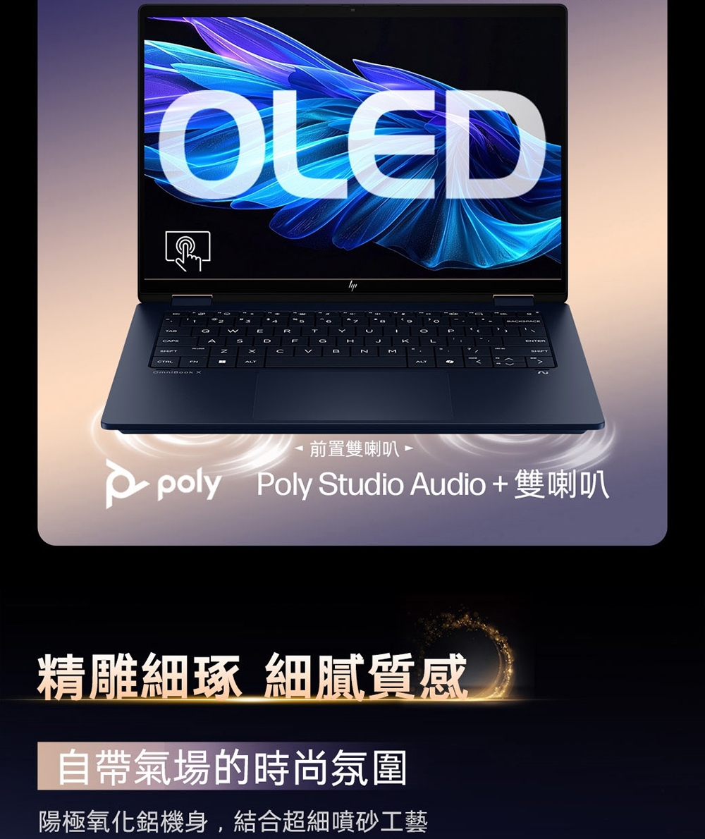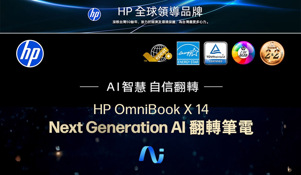 <2025全新系列 - OmniBook X : Next Gen AI PC>• 14吋360度翻轉機身, 僅約1.41kg• 鋁合金A/C/D材質, 絲滑質感• 持續落實永續環保理念: 採用海洋回收塑料/再生金屬件/消費性回收塑料,應用於筆電之設計中 ; 並使用100%可回收包材, 可循環再利用<高效翻轉筆電>• AMD Ryzen AI 300系列處理器, TSMC四奈米技術, 50 NPU TOPS, 智慧效能表現再進化• 5MP廣視域AI鏡頭, 提供最佳的視訊品質• Poly Camera Pro, 提供背景/濾鏡/環境光源調整等功能, 即時優化視訊狀態<高規格螢幕表現>• 16:10 2.8K OLED螢幕, 大比例、高解析度、高畫質, 舒適且提升生產力• 極微邊框, 89.58%螢幕佔比, 視野寬廣無限• TUV + Eyesafe認證, 低藍光降低對眼睛的負擔, 同時維持色彩表現• DC調光不閃屏• 100% DCI-P3色域, 400nits高亮度, 色彩表現豐富• Corning® Gorilla® Glass 3, 強度增加, 降低螢幕磨損<優化使用體驗>• 舒適鍵盤打字回饋感, 流暢順手超有感• Poly Studio 音效, 體驗更舒適的聽覺享受• 支援電池快充技術, 最快30分鐘充達50%電力• TYPE-C支援PD快充• 箱內含type-c充電式4096階手寫筆[商品規格]HP OmniBook X FlipNGAI 14-fk0065AU 職人灰螢幕尺寸:"14""OLED2.8K(2880x1800)100%DCI-P3,400nitsSDR/500nitsHDR,TUV+Eyesafe,低藍光,不閃頻,VRR48-120Hz,0.2ms反應時間"螢幕比例:16:10玻璃:微邊框鏡面,Corning®Gorilla®Glass3觸控:Yes處理器:AMD Ryzen AI 7 350,TSMC4nm,8核心/16執行緒/50TOPS(2.0GHz,up to5.0GHz,16MBL3)重量:1.41kg尺寸:31.3x21.85x1.46cm晶片組:AMD integrationSoC記憶體:32GB LPDDR5x7500(onboard)/0/32G(無法升級)硬碟:1TB PCIeGen4NVMeM.2SSD繪圖:AMDRadeon™860MGraphics(支援FreeSyncPremiumPro)無線:Wi-Fi7(802.11be2x2),BT5.4電池:3cell59Whr充電器:65WType-C(快充30min至50%)光碟機:No攝影機:5MPIRWFOVAICam,TNR,物理鏡頭開關觸控板:Yes(多點觸控)數字鍵盤:No背光鍵盤:Yes(灰色)Copilot鍵:YesUSB-A:2x10GbpsUSB-C:1x40Gbps,1x10Gbps(支援PD/資料/DP2.1最高5K@60Hz)HDMI:HDMI2.1(最高支援4K@60Hz)Sleep充電:USB-C支援Miracast:Yes音效:PolyStudio+DualSpeakers,DTS:X®Ultra,HPBoost2.0(含獨立放大器)麥克風:雙陣列數位指紋辨識:No讀卡機:NoRJ45:No感應器:重力+陀螺儀+紅外線熱感測OS:Windows11Home保固:1年國際+1年台灣(含零件人工)/2年本島到府維修認證:EPEATGoldClimate+,ENERGYSTAR8.0附贈:Type-C充電式MPP2.0手寫筆(up to4096壓力階)