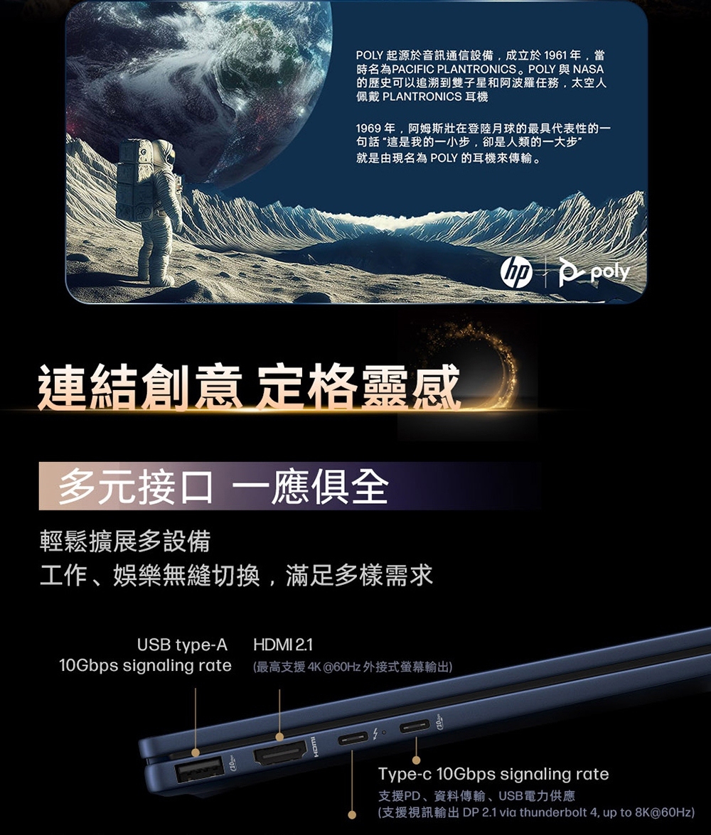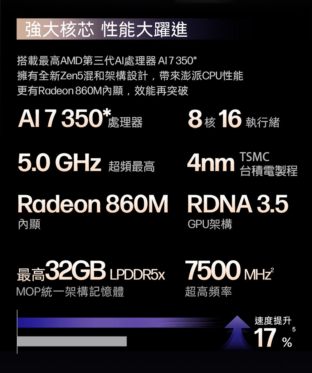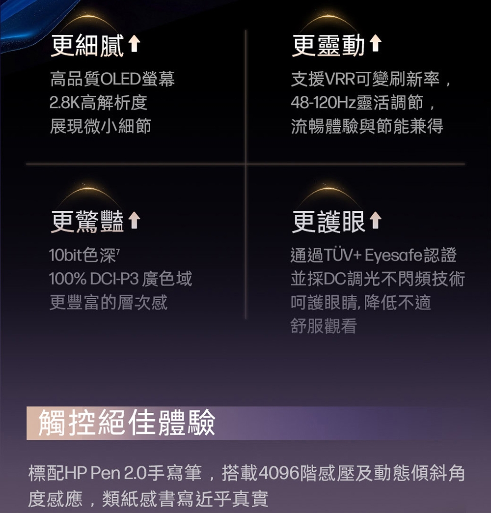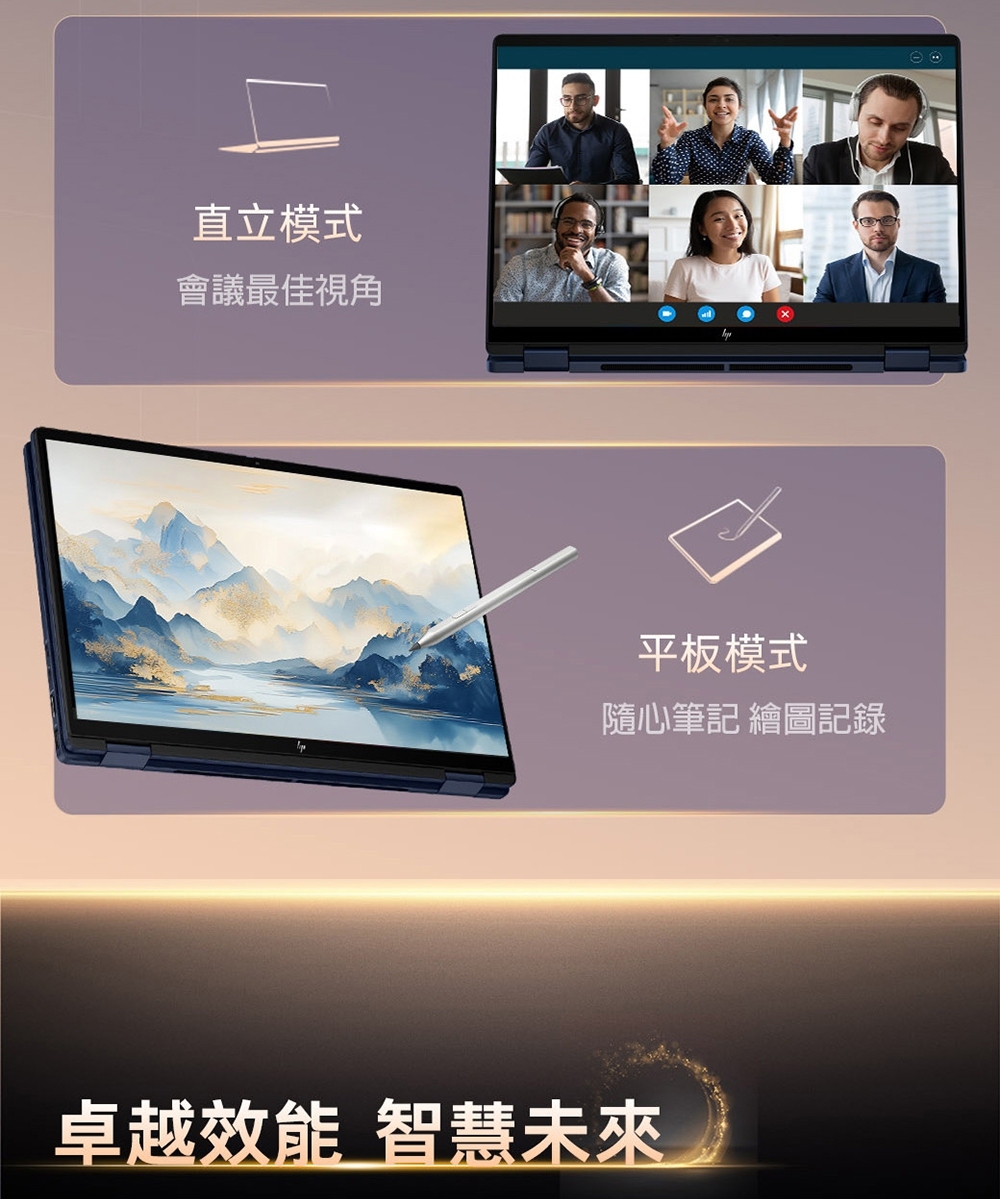 <2025全新系列 - OmniBook X : Next Gen AI PC>• 14吋360度翻轉機身, 僅約1.41kg• 鋁合金A/C/D材質, 絲滑質感• 持續落實永續環保理念: 採用海洋回收塑料/再生金屬件/消費性回收塑料,應用於筆電之設計中 ; 並使用100%可回收包材, 可循環再利用<高效翻轉筆電>• AMD Ryzen AI 300系列處理器, TSMC四奈米技術, 50 NPU TOPS, 智慧效能表現再進化• 5MP廣視域AI鏡頭, 提供最佳的視訊品質• Poly Camera Pro, 提供背景/濾鏡/環境光源調整等功能, 即時優化視訊狀態<高規格螢幕表現>• 16:10 2.8K OLED螢幕, 大比例、高解析度、高畫質, 舒適且提升生產力• 極微邊框, 89.58%螢幕佔比, 視野寬廣無限• TUV + Eyesafe認證, 低藍光降低對眼睛的負擔, 同時維持色彩表現• DC調光不閃屏• 100% DCI-P3色域, 400nits高亮度, 色彩表現豐富• Corning® Gorilla® Glass 3, 強度增加, 降低螢幕磨損<優化使用體驗>• 舒適鍵盤打字回饋感, 流暢順手超有感• Poly Studio 音效, 體驗更舒適的聽覺享受• 支援電池快充技術, 最快30分鐘充達50%電力• TYPE-C支援PD快充• 箱內含type-c充電式4096階手寫筆[商品規格]HP OmniBook X FlipNGAI 14-fk0065AU 職人灰螢幕尺寸:"14""OLED2.8K(2880x1800)100%DCI-P3,400nitsSDR/500nitsHDR,TUV+Eyesafe,低藍光,不閃頻,VRR48-120Hz,0.2ms反應時間"螢幕比例:16:10玻璃:微邊框鏡面,Corning®Gorilla®Glass3觸控:Yes處理器:AMD Ryzen AI 7 350,TSMC4nm,8核心/16執行緒/50TOPS(2.0GHz,up to5.0GHz,16MBL3)重量:1.41kg尺寸:31.3x21.85x1.46cm晶片組:AMD integrationSoC記憶體:32GB LPDDR5x7500(onboard)/0/32G(無法升級)硬碟:1TB PCIeGen4NVMeM.2SSD繪圖:AMDRadeon™860MGraphics(支援FreeSyncPremiumPro)無線:Wi-Fi7(802.11be2x2),BT5.4電池:3cell59Whr充電器:65WType-C(快充30min至50%)光碟機:No攝影機:5MPIRWFOVAICam,TNR,物理鏡頭開關觸控板:Yes(多點觸控)數字鍵盤:No背光鍵盤:Yes(灰色)Copilot鍵:YesUSB-A:2x10GbpsUSB-C:1x40Gbps,1x10Gbps(支援PD/資料/DP2.1最高5K@60Hz)HDMI:HDMI2.1(最高支援4K@60Hz)Sleep充電:USB-C支援Miracast:Yes音效:PolyStudio+DualSpeakers,DTS:X®Ultra,HPBoost2.0(含獨立放大器)麥克風:雙陣列數位指紋辨識:No讀卡機:NoRJ45:No感應器:重力+陀螺儀+紅外線熱感測OS:Windows11Home保固:1年國際+1年台灣(含零件人工)/2年本島到府維修認證:EPEATGoldClimate+,ENERGYSTAR8.0附贈:Type-C充電式MPP2.0手寫筆(up to4096壓力階)