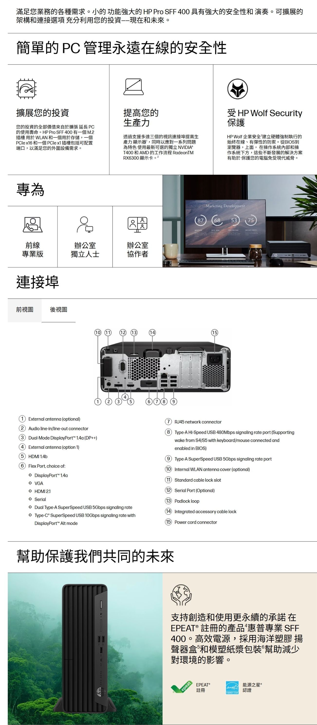 (後): 音訊輸出孔, 1個DP 1.4a, 1個HDMI 1.4a, 2個USB-A 480Mbps, 3個USB-A 5Gbps, 1個RJ45