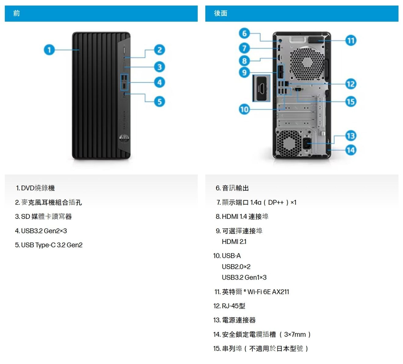 機型:HP Pro Tower 400 G9料號:B8UM6PT作業系統:Windows 11 Pro 64處理器CPU:Intel Core i5-14500 (2.6GHz up to 5.0GHz,24M Cache)14核心記憶體:16GB*1 DDR5 (最高64GB, 2*DIMM)硬碟:1TB M.2 2280 PCIe NVMe SSD顯示晶片: Intel UHD 770晶片組: Intel Q670燒錄機:無讀卡機:無無線網路: Realtek 8852BE Wi-Fi 6 +Bluetooth 5.3 WW WLAN網路: 10/100/1000音效:Realtek ALC3252擴充槽:1個PCI-E x16, 1個PCI-E x1, 1個PCI, 1個M.2 2230, 1個M.2 2280(前):組合音訊插孔, 3個USB-A 10Gbps, 1個USB-C 10Gbps(後): 音訊輸出孔, 1個DP 1.4a, 1個HDMI 1.4, 2個USB-A 480Mbps, 3個USB-A 5Gbps, 1個RJ45配件:USB鍵盤,滑鼠電源供應器:260W 80 PLUS Platinum尺寸: 33.7 x 30.8 x 15.5 cm保固:三年,隔日到府 (3/3/3) (含台灣本島到府服務)貨源:公司貨