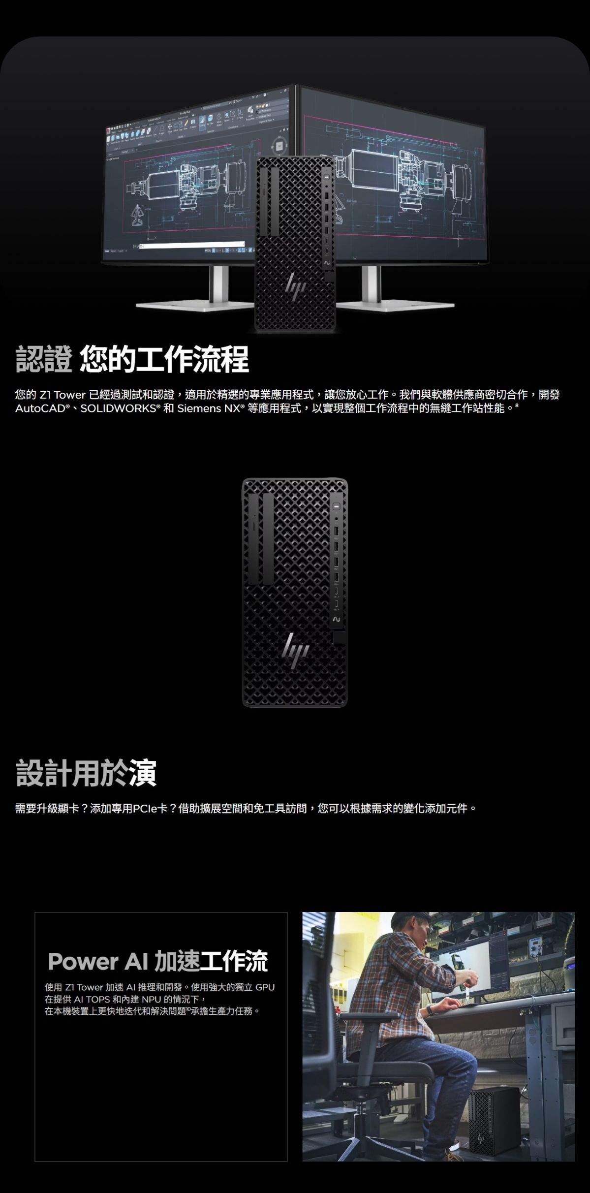 HP Z1 立式電腦超越商用 PC,提供經過專業應用程式認證的可擴充效能,並支援高階顯示卡。