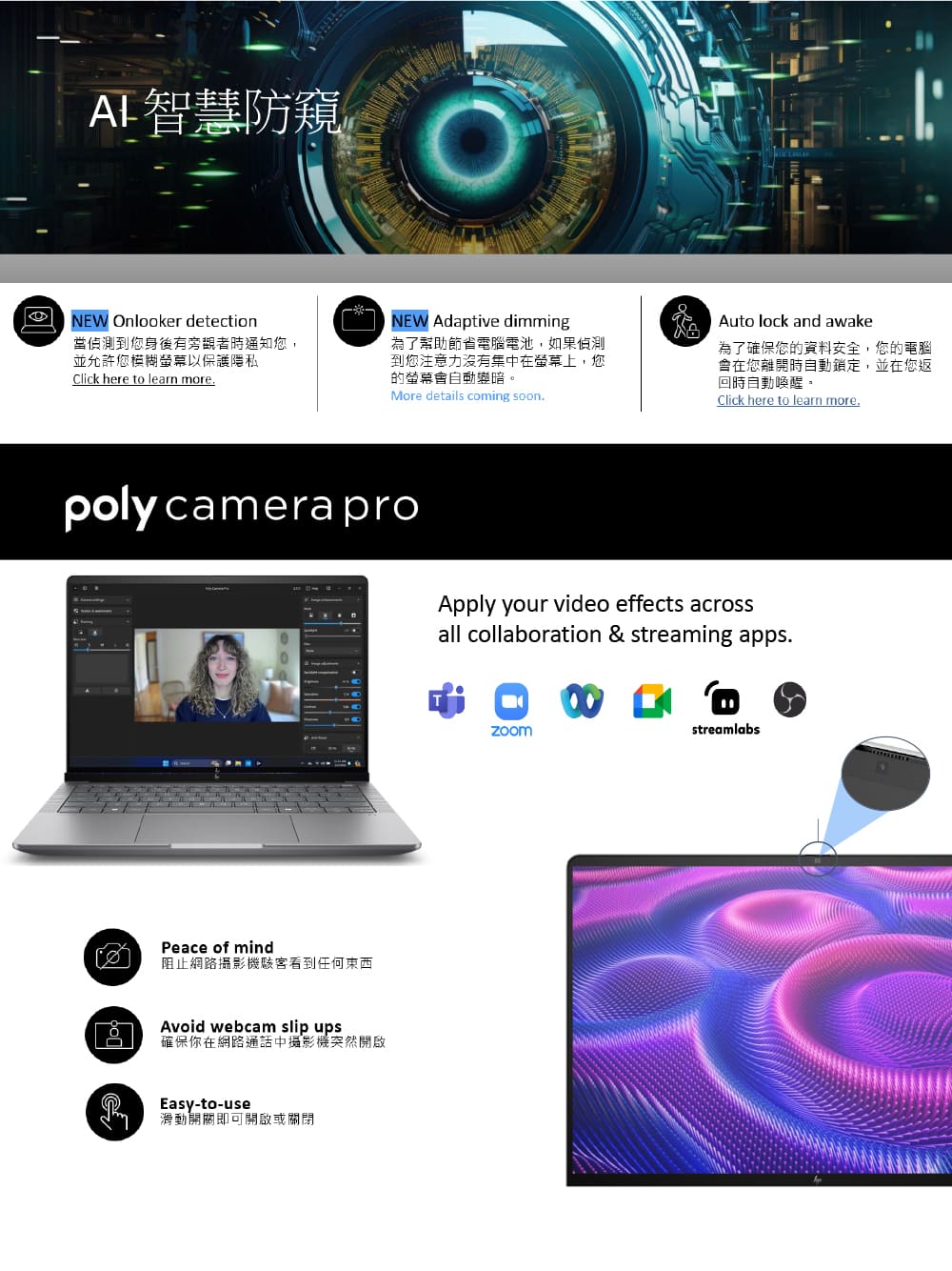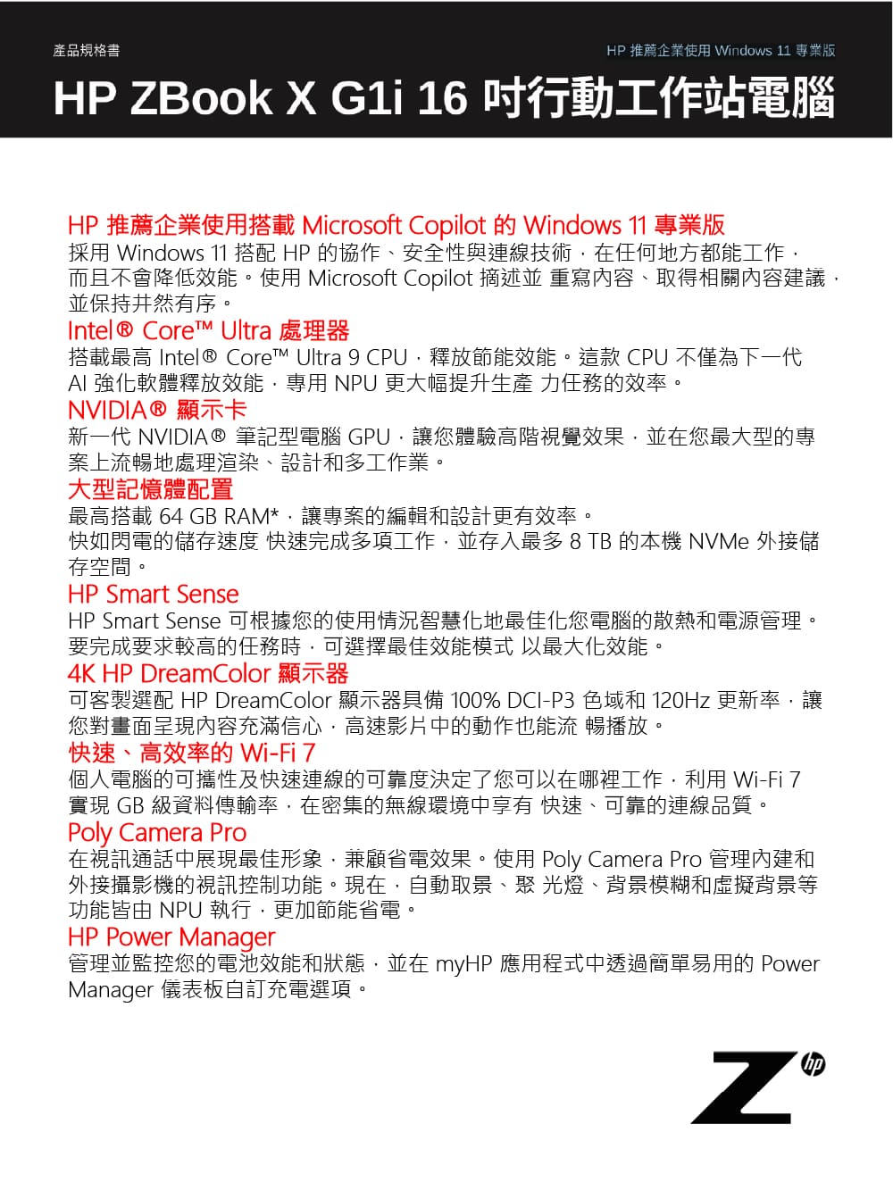 規格說明♦主要規格:.螢幕:16吋 WUXGA (1920 x 1200).觸控螢幕:No.處理器:Intel Core Ultra 7 255H.記憶體:16G*1 DDR5 5600.硬碟:1TB SSD 2280 PCIe-4x4 NVMe TLC (SSD插槽*2).顯示晶片:NVIDIA RTX PRO 1000 Blackwell 8GB.無線通訊功能:Intel Wi-Fi 7 BE201 + Bluetooth 5.4.尺寸:35.94 x 25.1 x 2.29 cm.重量:2.04 kg(起).作業系統:Windows 11 Pro.電池:HP Long Life 6-cell, 83 Wh Li-ion polymer.售後保固服務:1年保固 (包含台灣本島到府服務)♦I/O連接介面:左側:.1個 電源埠.2個 Thunderbolt 4 with USB4 Type-C 40Gbps signaling rate (USB Power Delivery, DisplayPort 2.1).1個 HDMI 2.1.1個 SuperSpeed USB Type-A 5Gbps signaling rate.1個 Audio Combo Jack.1個 Smart Card reader右側:.1個 安全鎖槽.1個 RJ45 Ethernet port.1個 SuperSpeed USB Type-A 5Gbps signaling rate.1個 SD Card reader♦其他規格:.讀卡機:1個 Smart Card reader、1個 SD Card reader.網路攝影機:5MP camera+人臉辨識.獨立數字鍵盤:Yes.背光鍵盤:Yes.指紋辨識器:Yes.NFC:Yes.喇叭/音效技術:Audio by Poly Studio.電源:150W Smart AC Adapter.支援 HP Tamper Lock貨源:公司貨*** 請注意:本機不含 Microsoft® Office 授權/需自行另購 ***以上規格僅供參考,若有錯誤,請以原廠官網公布為準
