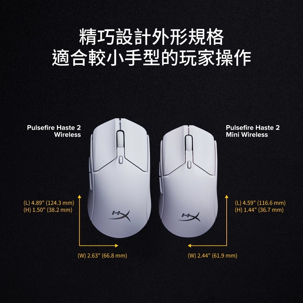 HyperX Pulsefire Haste 2 Mini比Pulsefire Haste 2無線滑鼠小16%,但超輕重量、功能完備、雙模式無線傳輸選項,可承受達一億次鍵擊。搭配流暢的低摩擦鼠腳與隨附的防滑貼,讓玩家擁有絕佳滑鼠操作體驗。