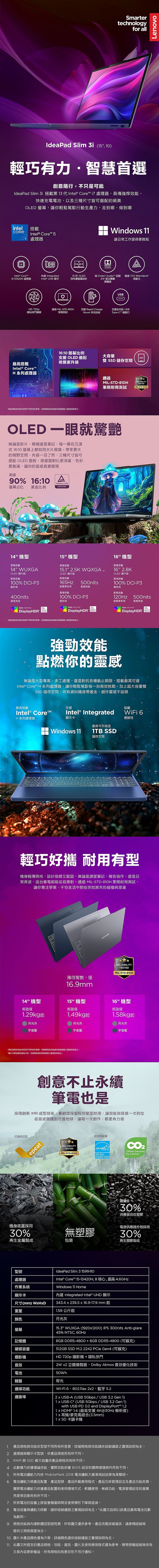 品名:IdeaPad Slim 3 15IRH10料號:83K100WDTW處理器:Intel Core™ i5-13420H 處理器,8 核心 (4P + 4E) / 12T, P-core up to 4.6GHz, E-core up to 3.4GHz, 12MB Intel® Smart顯示:整合 Intel® UHD 顯示卡晶片組:Intel® SoC 平台作業系統:Windows® 11 家用版,繁體中文/簡體中文/英文記憶體:16GB (8GB Soldered DDR5-4800 + 8GB SODIMM DDR5-4800)/最高可 24GB硬碟:512GB SSD M.2 2242 PCIe® 4.0x4 NVMe® /兩個 M.2 2242 PCIe® 4.0 x4 插槽讀卡機:SD卡讀卡器音訊晶片:High Definition (HD) Audio音訊:立體聲揚聲器,2W x2,經杜比音效™優化相機:HD 720p with Privacy Shutter螢幕:15.3吋 WUXGA (1920x1200) IPS 顯示屏,300尼特亮度,防眩光,45%觸控螢幕:無螢幕佔比:IPS 型號:90.7% 有效面積比 (AAR)顏色校準:X-Rite® 工廠色彩校準觸控筆:不支援鍵盤:無背光,繁體中文觸控板:無按鈕 Mylar® 表面多點觸控板,支援精密觸控板 (PTP),75 x 120 mm外殼顏色:月光灰外殼材質:鋁合金(上層),PC-ABS(下層)表面處理:鋁沖壓陽極氧化(上),紋理(下)無線區域網路 + 藍牙:Wi-Fi® 6,802.11ax 2x2 + BT5.2WWAN:不支援WWAN。乙太網路:無連接埠:2 個 USB-A 連接埠(USB 5Gbps / USB 3.2 Gen 1)1 個 USB-C® 介面(USB 5Gbps / USB 3.2 Gen 1),支援 USB PD 45-65W 快充和 DisplayPort™ 1.2 接口1 個 HDMI® 1.4 介面1 個耳機/麥克風組合插孔(3.5 公釐)1 個 SD 卡讀卡器1 個圓形插頭電源連接器安全晶片:韌體 TPM 2.0 已啟用指紋辨識器:沒有其他安全措施:相機隱私快門軍用規格測試:通過 MIL-STD-810H 軍用標準測試(21 項測試)其他認證:TÜV Rheinland® 低藍光(軟體解決方案)電池:50瓦時電源適配器:65瓦圓形插頭(3針)尺寸(寬x深x高):343.4 x 239.5 x 16.9-17.9 毫米重量:起始重量為 1.59 公斤配件:無保固:2年 Premium Care -IPENTRY (ESS)貨源:公司貨*** 請注意:本機不含 Microsoft® Office 授權/需自行另購< 文案中相關圖文及說明,僅供參考,規格配置依機型不同有所差異,請以實際商品為準 >