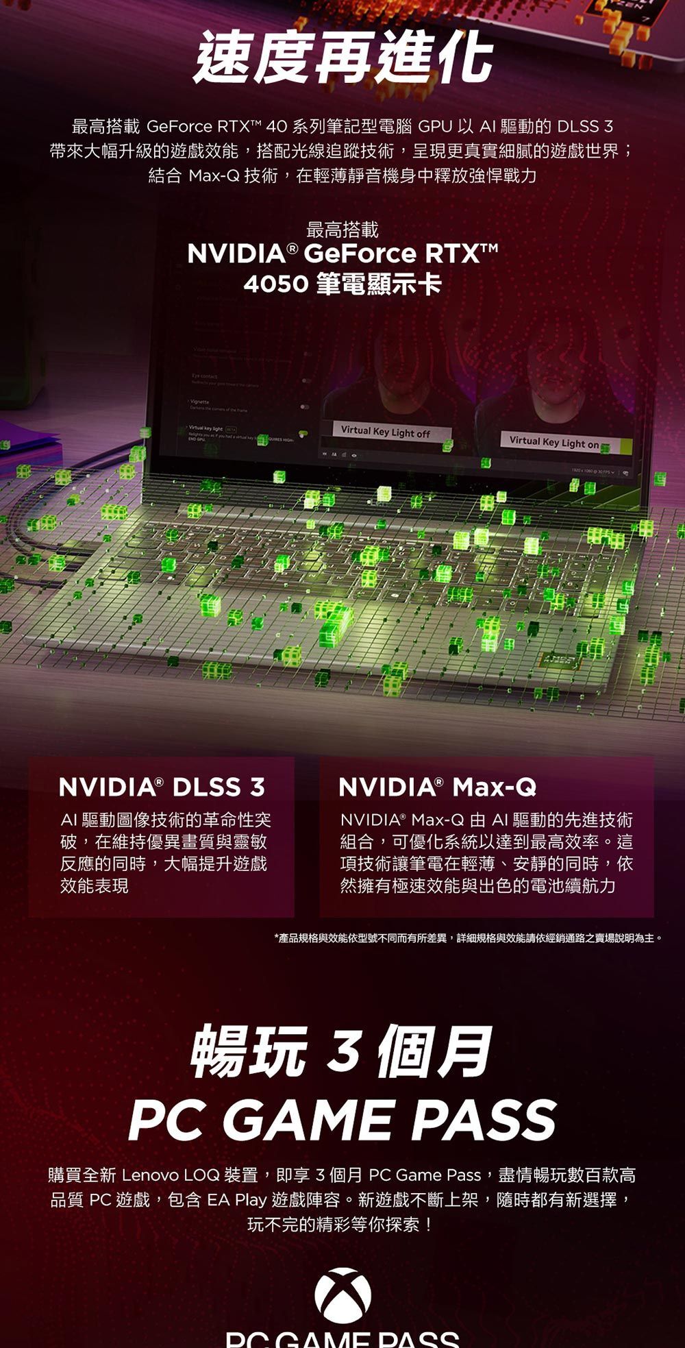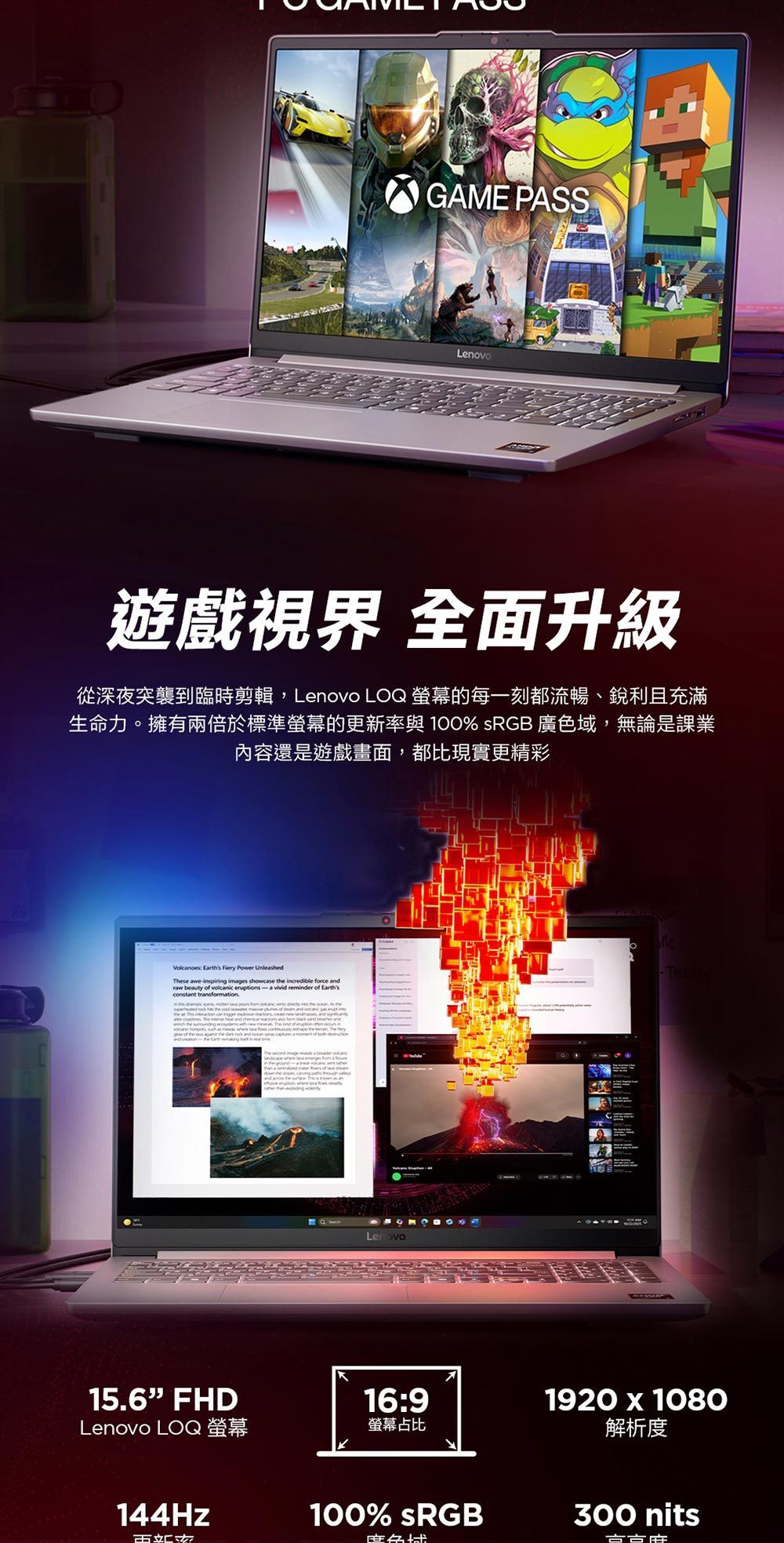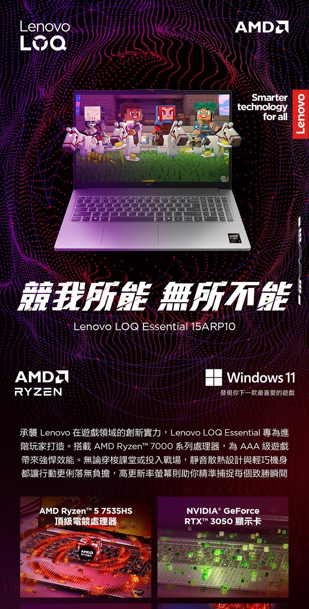 專為追求沉浸式視覺效果和可靠性能的入門級遊戲玩家而設計。 最高可選配 AMD Ryzen™ 7 7735HS,提供 8 個核心,最高頻率為 4.75Ghz。 NVIDIA® RTX 4050 最高可提供 194 AI TOPS 的效能。 15.6 吋 FHD 顯示器具有 100% sRGB 色域和 144Hz 更新率。 57.5Wh電池可提供長達10小時的續航力。 *下單前請先詢問貨況*品名:LOQ 15ARP10E型號: 83S000A8TW作業系統:Windows® 11 家用版,繁體中文/簡體中文/英文處理器:AMD Ryzen™ 7 7735HS (8C/16T、3.2/4.75GHz、4MB L2/16MB L3)顯示:NVIDIA GeForce RTX™ 4050 顯示卡,6GB GDDR6,加速頻率1605MHz,總耗電量65W,194 AI TOPS晶片組:AMD SoC平台記憶體:1x 16GB SODIMM DDR5-4800(兩個 DDR5 SODIMM 插槽)儲存硬碟:512GB SSD M.2 2242 PCIe® 4.0x4 NVMe(兩個 M.2 2242 PCIe® 4.0 x4 插槽)光碟機:無讀卡器:有螢幕:15.6 吋 FHD (1920x1080) IPS 顯示屏,300 尼特亮度,防眩光,100% sRGB 色域,144Hz 刷新率,支援 FreeSync™觸控螢幕:無螢幕佔比:88% AAR(有效面積比率)觸控筆:不支援鍵盤:無背光,繁體中文觸控板:無按鈕 Mylar® 表面多點觸控板,支援精密觸控板 (PTP),尺寸為 69 x 104 mm音訊晶片:高清音頻,Realtek® ALC3287 編解碼器音訊:立體聲揚聲器,2W x 2,經 Nahimic Audio 優化麥克風:2x,數組相機:高清 720p 帶隱私快門電池:57.5瓦時電源適配器:135W 細長插頭(3針)特別功能:人工智慧晶片:LA1材質:PC-ABS(上層),PC-ABS(下層)表面處理:IMR(模內滾壓裝飾)無線區域網路 + 藍牙:Wi-Fi® 6,802.11ax 2x2 + BT5.2WWAN:不支援乙太網路:100/1000M(RJ-45)連接埠:●2 個 USB-A 連接埠(USB 5Gbps / USB 3.2 Gen 1)●1 個 USB-C® 連接埠(USB 5Gbps),支援 USB PD 65-100W 快充●1 個 HDMI® 2.1 接口,最高支援 8K/60Hz●1 個耳機/麥克風組合插孔(3.5 公釐)●1 個乙太網路介面 (RJ-45)●1 個讀卡器●1 個細長型電源連接器安全晶片:韌體 TPM 2.0 已啟用指紋辨識器:沒有其他認證:相機隱私快門保固:2年 Premium Care -IPENTRY (ESS)尺寸(寬x深x高):359.2 x 236 x 19.9-22.95 毫米