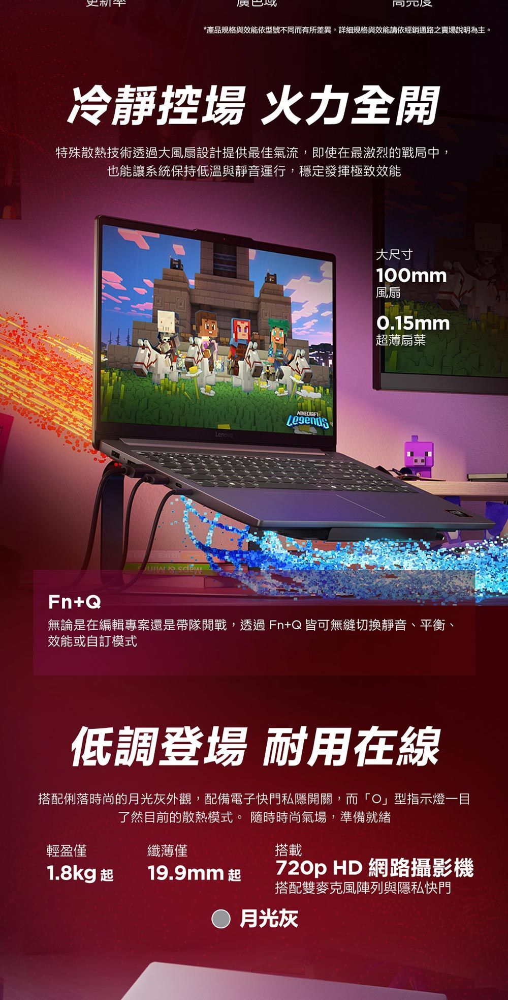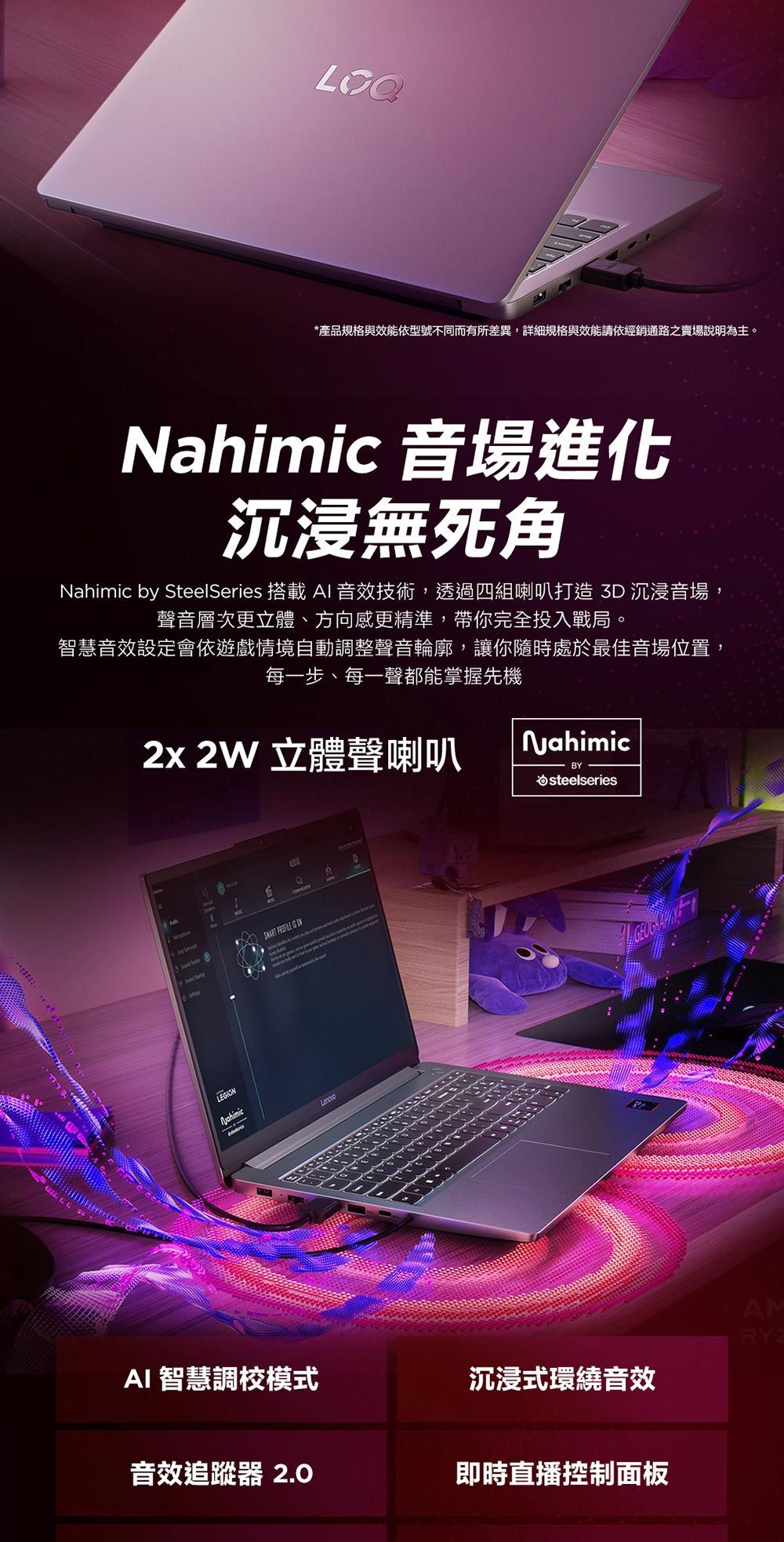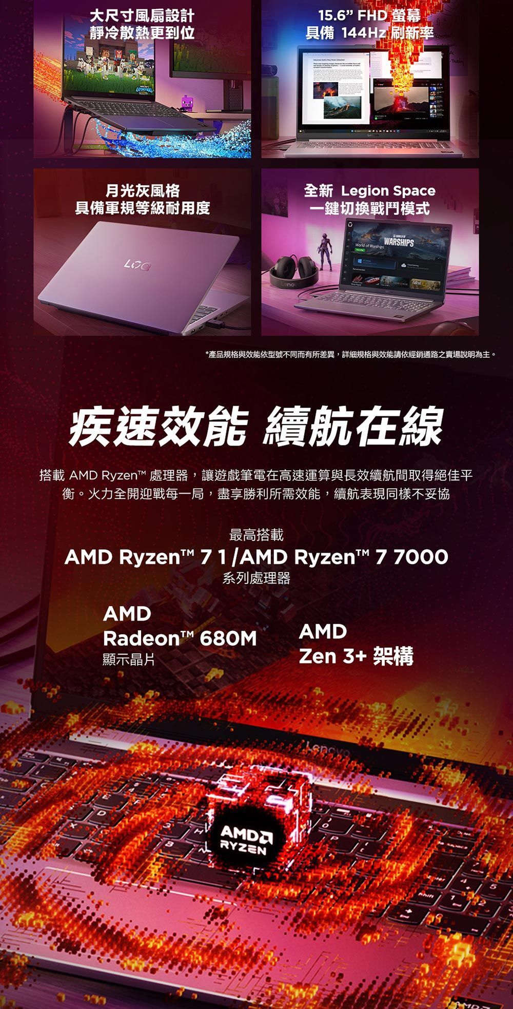 專為追求沉浸式視覺效果和可靠性能的入門級遊戲玩家而設計。 最高可選配 AMD Ryzen™ 7 7735HS,提供 8 個核心,最高頻率為 4.75Ghz。 NVIDIA® RTX 4050 最高可提供 194 AI TOPS 的效能。 15.6 吋 FHD 顯示器具有 100% sRGB 色域和 144Hz 更新率。 57.5Wh電池可提供長達10小時的續航力。 *下單前請先詢問貨況*品名:LOQ 15ARP10E型號: 83S000A8TW作業系統:Windows® 11 家用版,繁體中文/簡體中文/英文處理器:AMD Ryzen™ 7 7735HS (8C/16T、3.2/4.75GHz、4MB L2/16MB L3)顯示:NVIDIA GeForce RTX™ 4050 顯示卡,6GB GDDR6,加速頻率1605MHz,總耗電量65W,194 AI TOPS晶片組:AMD SoC平台記憶體:1x 16GB SODIMM DDR5-4800(兩個 DDR5 SODIMM 插槽)儲存硬碟:512GB SSD M.2 2242 PCIe® 4.0x4 NVMe(兩個 M.2 2242 PCIe® 4.0 x4 插槽)光碟機:無讀卡器:有螢幕:15.6 吋 FHD (1920x1080) IPS 顯示屏,300 尼特亮度,防眩光,100% sRGB 色域,144Hz 刷新率,支援 FreeSync™觸控螢幕:無螢幕佔比:88% AAR(有效面積比率)觸控筆:不支援鍵盤:無背光,繁體中文觸控板:無按鈕 Mylar® 表面多點觸控板,支援精密觸控板 (PTP),尺寸為 69 x 104 mm音訊晶片:高清音頻,Realtek® ALC3287 編解碼器音訊:立體聲揚聲器,2W x 2,經 Nahimic Audio 優化麥克風:2x,數組相機:高清 720p 帶隱私快門電池:57.5瓦時電源適配器:135W 細長插頭(3針)特別功能:人工智慧晶片:LA1材質:PC-ABS(上層),PC-ABS(下層)表面處理:IMR(模內滾壓裝飾)無線區域網路 + 藍牙:Wi-Fi® 6,802.11ax 2x2 + BT5.2WWAN:不支援乙太網路:100/1000M(RJ-45)連接埠:●2 個 USB-A 連接埠(USB 5Gbps / USB 3.2 Gen 1)●1 個 USB-C® 連接埠(USB 5Gbps),支援 USB PD 65-100W 快充●1 個 HDMI® 2.1 接口,最高支援 8K/60Hz●1 個耳機/麥克風組合插孔(3.5 公釐)●1 個乙太網路介面 (RJ-45)●1 個讀卡器●1 個細長型電源連接器安全晶片:韌體 TPM 2.0 已啟用指紋辨識器:沒有其他認證:相機隱私快門保固:2年 Premium Care -IPENTRY (ESS)尺寸(寬x深x高):359.2 x 236 x 19.9-22.95 毫米