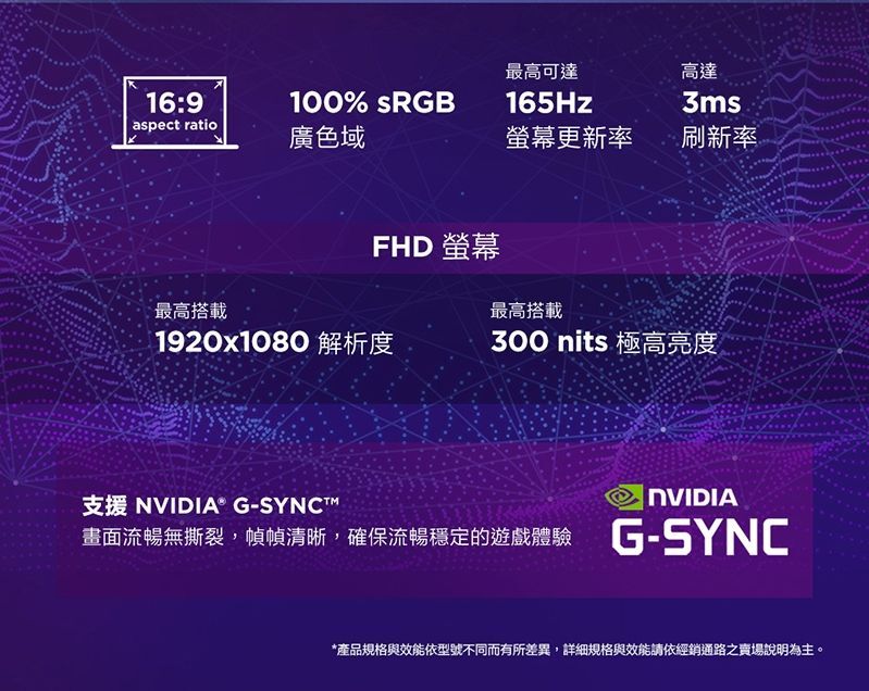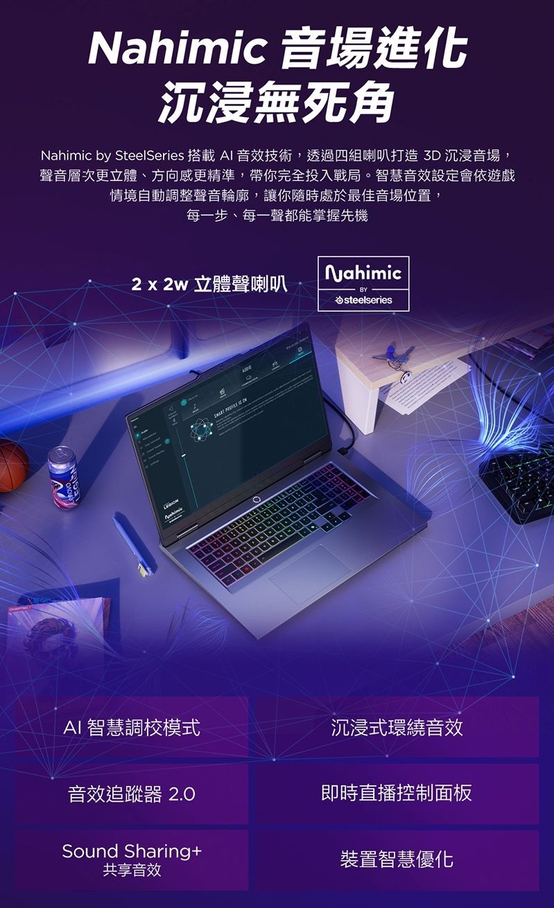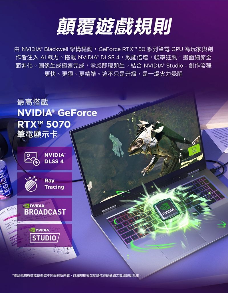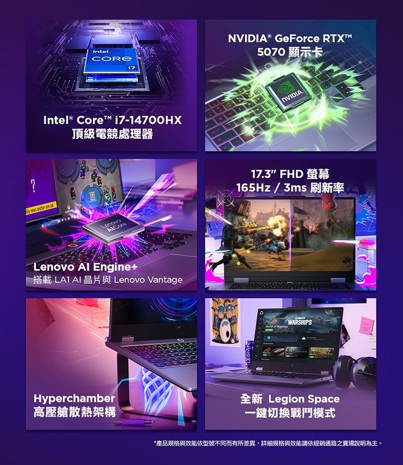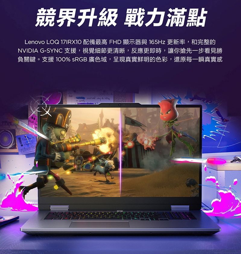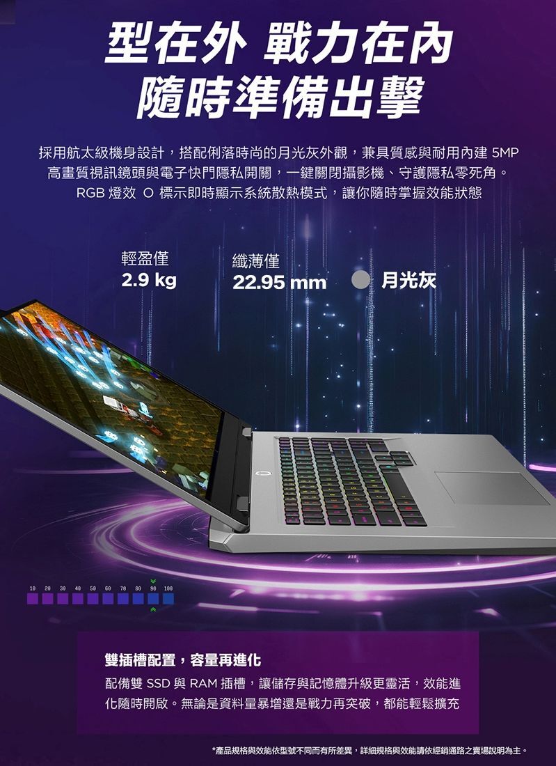 商品規格處理器:Intel Core i7-13650HX作業系統:Windows 11 Home顯示卡:NVIDIA GeForce RTX 5060 8GB GDDR7, Boost Clock 2347MHz, TGP 115W, 798 AI TOPS顯示器:17.3" FHD (1920x1080) IPS 300nits Anti-glare, 100% sRGB, 165Hz, G-SYNC記憶體:16GB SO-DIMM DDR5-5600硬碟:1TB SSD M.2 2242 PCIe 4.0x4 NVMe插槽:2x DDR5 SO-DIMM slots2x M.2 PCIe SSD電池:60Wh電源:245W Slim Tip (3-pin)鏡頭:5.0MP with E-shutter音效:High Definition (HD) Audio, Realtek ALC3287 codec尺寸:398.4 x 276.2 x 22.95-25.25 mm (15.69 x 10.87 x 0.94-0.99 inches)重量:Starting at 2.9 kg (6.39 lbs)無線網路:Wi-Fi 6, 802.11ax 2x2 + BT5.2連接埠 / 插槽:4x USB-A (USB 5Gbps / USB 3.2 Gen 1)1x USB-CR (USB 10Gbps / USB 3.2 Gen 2), with USB PD 65-100W and DisplayPort? 1.41x HDMIR 2.1, up to 8K/60Hz1x Headphone / microphone combo jack (3.5mm)1x Ethernet (RJ-45)1x Power connector鍵盤:24-Zone RGB Backlit, Traditional Chinese揚聲器:Stereo speakers, 2W x2, optimized with Nahimic Audio麥克風:2x, Array讀卡機:N光碟機:N外殼顏色:灰保固:1年保固貨源:公司貨*** 請注意:本機不含 Microsoft® Office 授權/需自行另購 ***以上規格僅供參考,若有錯誤,請以原廠官網公布為準