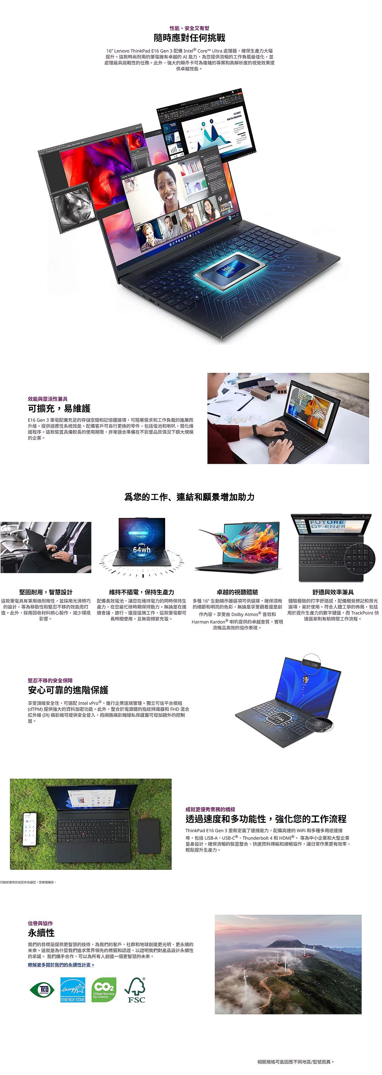 **請先詢問貨況**品名:ThinkPad E16料號:22AY006FTW作業系統:Windows® 11 專業版,繁體中文/英文處理器:Intel Core Ultra 5 226V,8 核心(4 線程 + 4 層並行處理)/ 8 線程,最高睿頻可達 4.5GHz,8MB Intel® 智慧高速緩存AI PC類別:Copilot+ PC神經處理單元 (NPU):整合Intel® AI Boost 技術,最高可達 40 TOPS顯示:整合式 Intel® Arc™ 顯示卡 130V晶片組:Intel® SoC 平台記憶體:16GB LPDDR5X-8533 內存(記憶體焊接在主機板上,沒有記憶體插槽,不可升級)儲存空間:512GB SSD M.2 2242 PCIe® 4.0x4 NVMe® Opal 2.0讀卡機:沒有讀音訊晶片:High Definition (HD) Audio,Senary SN6147 編解碼器音訊:立體聲揚聲器,2瓦 x 2,杜比全景聲®,audio by HARMAN麥克風:2x,數組相機:FHD 1080p 和紅外線 (IR),配備網路攝影機隱私保護蓋電池:48瓦時電源適配器:65W USB-C® (3-pin)螢幕:16吋 WUXGA (1920x1200) IPS 顯示屏,300尼特亮度,防眩光,45% NTSC 色域,60Hz刷新率觸控螢幕:無螢幕佔比:90.7%觸控筆:不支援鍵盤:背光,繁體中文尺寸(寬x深x高):356 x 249 x 10.1/17.05(前/後),21.15(最大)毫米重量:起始重量為1.61 公斤外殼顏色:黑色材質:鋁(上)、鋁(下)無線區域網路 + 藍牙:Intel® Wi-Fi® 6E AX211,802.11ax 2x2 + 藍牙5.3WWAN:不支援WWAN。SIM卡:沒有實體SIM卡槽乙太網路:100/1000M(RJ-45)NFC:不支援標準連接埠:●1 個 USB-A 連接埠(USB 5Gbps / USB 3.2 Gen 1)●1 個 USB-A 連接埠(USB 10Gbps / USB 3.2 Gen 2),永遠開啟●1 個 USB-C® 介面(Thunderbolt™ 4 / USB4® 40Gbps),支援 USB PD 45-65W 和 DisplayPort™ 2.1●1 個 HDMI® 2.1 接口,最高支援 4K/60Hz●1 個耳機/麥克風組合插孔(3.5 公釐)●1 個乙太網路介面 (RJ-45)ThinkShield:ThinkShield 是一款涵蓋硬體、軟體和供應鏈組件的綜合安全解決方案。如欲了解更多詳情,請至官方網站安全晶片:獨立式 TPM 2.0 已啟用物理鎖:Kensington Nano 安全卡槽™,2.5 x 6 毫米智慧卡讀卡器:沒有指紋辨識器:觸控式,晶片級匹配,整合於電源按鈕其他安全措施:●相機隱私快門●用於 Windows® Hello(臉部辨識)的紅外線相機系統管理:非vPro®配件:沒有軍用規格測試:通過 MIL-STD-810H 軍用標準測試其他認證:TÜV Rheinland® 低藍光(軟體解決方案)保固:3年 Premier Support貨源:公司貨*** 請注意:本機不含 Microsoft® Office 授權/需自行另購< 文案中相關圖文及說明,僅供參考,規格配置依機型不同有所差異,請以實際商品為準 >