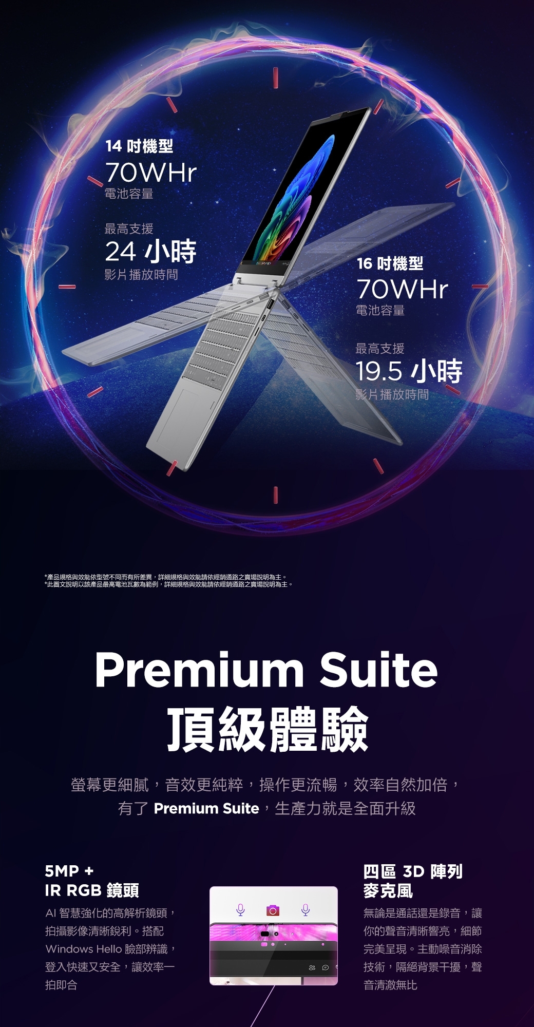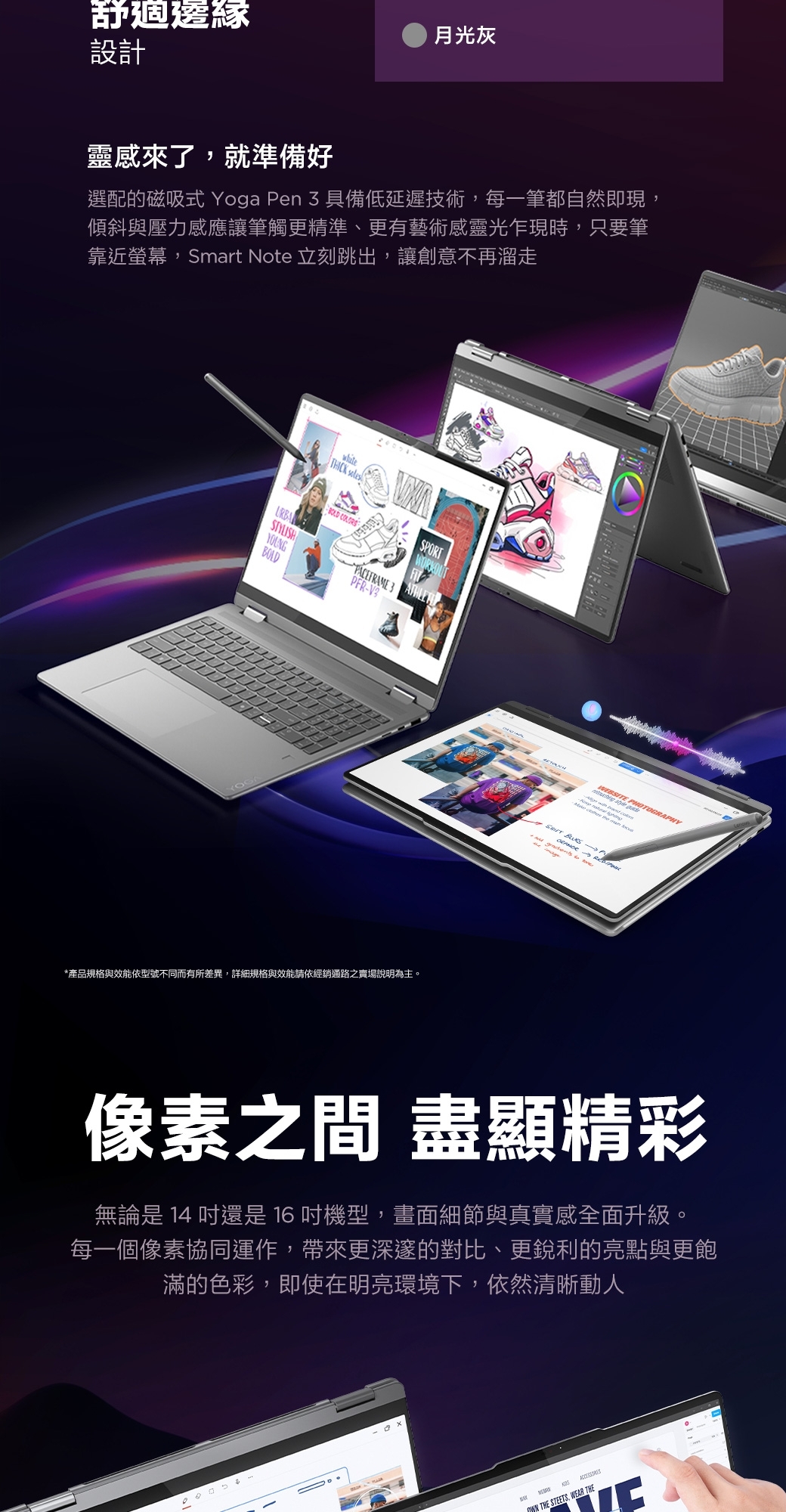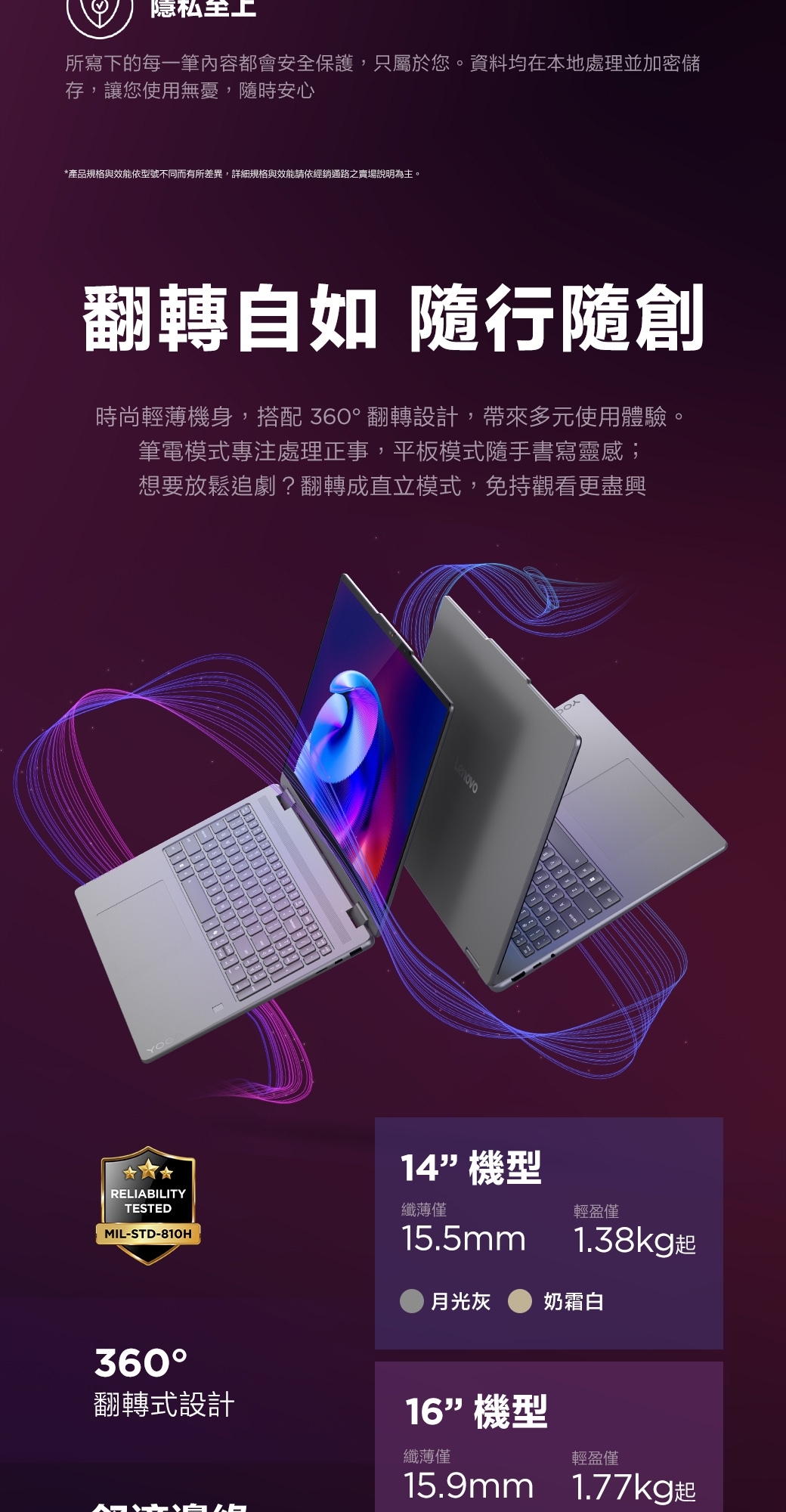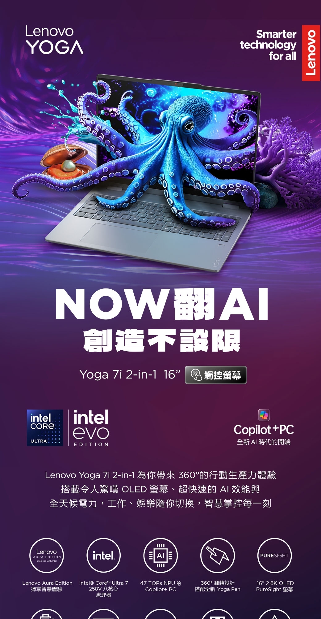 【商品規格】品名:Yoga 7 2-in-1 16ILL10型號:83JT0044TW處理器:Intel® Core™ Ultra 5 226V 處理器 ,8 核心(LPE 核心最高達 3.50 GHz P 核心最高達 4.50 GHz/16 GB MOP)AI PC類別:Copilot+ PCNPU:整合Intel® AI Boost 技術,最高可達 40 TOPS顯示:整合式 Intel® Arc™ 顯示卡 130V晶片組:Intel® SoC 平台記憶體:16 GB LPDDR5X-8533MT/s(封裝內記憶體)記憶體插槽:記憶體焊接在系統主機板上,沒有插槽,雙通道,不可升級儲存裝置:1 TB SSD M.2 2242 PCIe Gen4 TLC作業系統 :Windows 11 家用版,繁體中文/簡體中文/英文面板:16吋 WUXGA (1920x1200),觸控,IPS、鏡面、 300尼特、防指紋、45% NTSC 色域、60Hz刷新率、支援杜比視界®,透過德國TÜV低藍光認證,玻璃材質觸控螢幕:OGM,10點多點觸控螢幕佔比:90.24% AAR(有效面積比)觸控筆:無(需另行購買)鍵盤:背光,繁體中文觸控板:無按鈕玻璃表面多點觸控板,支援精密觸控板 (PTP),尺寸為 80 x 135 mm(3.15 x 5.31 吋)尺寸(寬x深x高):361 x 257 x 15.85 毫米重量:起始重量為 1.92 公斤外殼顏色: 月光灰(Luna Grey)材質:鋁(上)、鋁(下)表面處理:鋁沖壓件(陽極處理噴砂處理)音訊晶片: 高清音頻,Realtek® ALC3306 編解碼器音訊: 4 個立體聲揚聲器,2W x2(低音揚聲器),2W x2(高音揚聲器),經 Dolby Atmos® 優化,智慧型擴大機 (AMP)麥克風:4x, Array相機:FHD 1080p + 紅外線夜視,附隱私快門電池:4 Cell 可充電鋰離子電池 70 Wh電源適配器:65W USB-C (3-pin)無線區域網路 + 藍牙 :Wi-Fi® 7,802.11be 2x2 + BT5.4WWAN:不支援WWAN乙太網路:No Onboard Ethernet連接埠:1 個 USB-A 介面(USB 5Gbps),始終開啟2 個 Thunderbolt™ 4 接口,支援 USB PD 45-65W 快充和 DisplayPort™ 2.1 接口1 個 HDMI® 1.4b 接口1 個耳機/麥克風組合插孔(3.5 公釐)1 個 microSD 卡讀卡器安全晶片:韌體 TPM 2.0 已啟用指紋辨識器:無其他安全措施:相機隱私快門,用於 Windows® Hello(臉部辨識)的紅外線相機配件:無軍用規格測試:通過 MIL-STD-810H 軍用標準測試(21 項測試)其他認證: 採用 WUXGA IPS 面板的機型:TÜV Rheinland® 低藍光(軟體解決方案)保固:2年 Premium Care -IPPREM (ESS)EAN / UPC / JAN:199275028786*** 請注意:本機不含 Microsoft® Office 授權/需自行另購< 文案中圖片及說明,僅供參考。實際產品外觀、介面、鍵盤佈局和配件可能因型號而異,請以實際商品為準 >