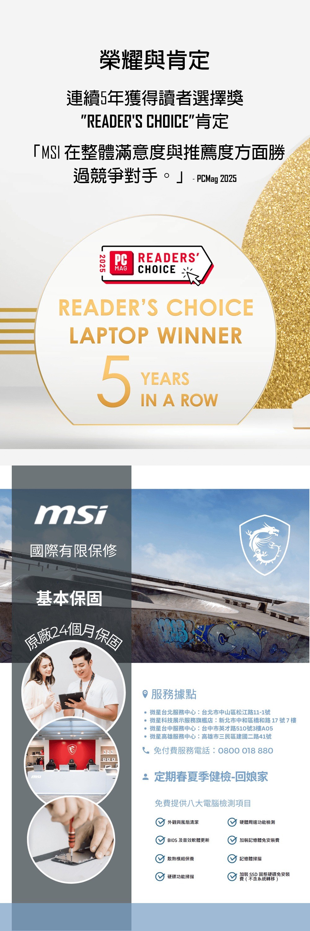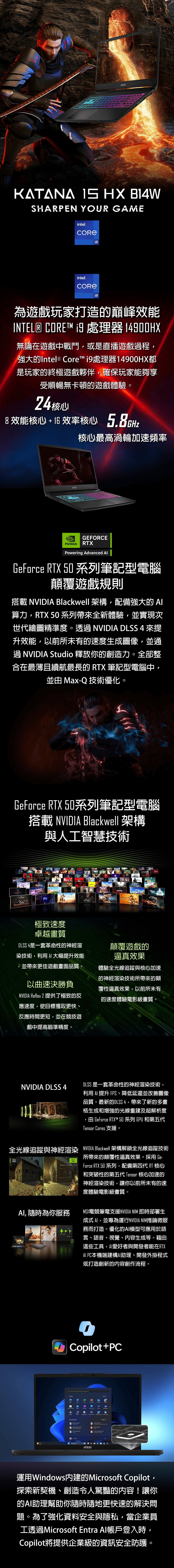 商品規格作業系統: Windows 11 Home螢幕尺寸及解析度: 15.6" QHD (2560x1440), 165Hz, IPS-Level處理器: Intel Core i9-14900HX (2.2GHz/Turbo 5.8GHz)(Cache 36MB)主記憶體: 32GB(16GB*2) DDR5-5600 ,2Slots ,Max 96GB儲存裝置: 1TB M.2 SSD (NVMe PCIe Gen4)顯示晶片規格: GeForce RTX 5060 Laptop GPU 8GB GDDR7 115W插槽:2 Slots Number of SO-DIMM Slot1x M.2 SSD slot (NVMe PCIe Gen4)視訊鏡頭: HD type (30fps@720p)鍵盤/輸入裝置: 4-Zone RGB Gaming Keyboard with Copilot Key支援網路: 802.11 ax Wi-Fi 6E藍芽: Bluetooth 5.3音效: 2x 2W Speaker1x Mic-in/Headphone-out Combo Jack光碟機:NI/O連接埠:1x Type-C (USB3.2 Gen2 / DisplayPort?/ Power Delivery 3.0)3x Type-A USB3.2 Gen21x HDMI 2.1 (8K @ 60Hz / 4K @ 120Hz)1x RJ45尺寸: 359 x 262 x 25.5 mm重量: 2.4 KG電池: 4-Cell 75 Battery (Whr)變壓器:240W adapter保固: 2年保固 / 免費客服電話0800-018880貨源:公司貨*** 請注意:本機不含 Microsoft® Office 授權/需自行另購 ***以上規格僅供參考,若有錯誤,請以原廠官網公布為準