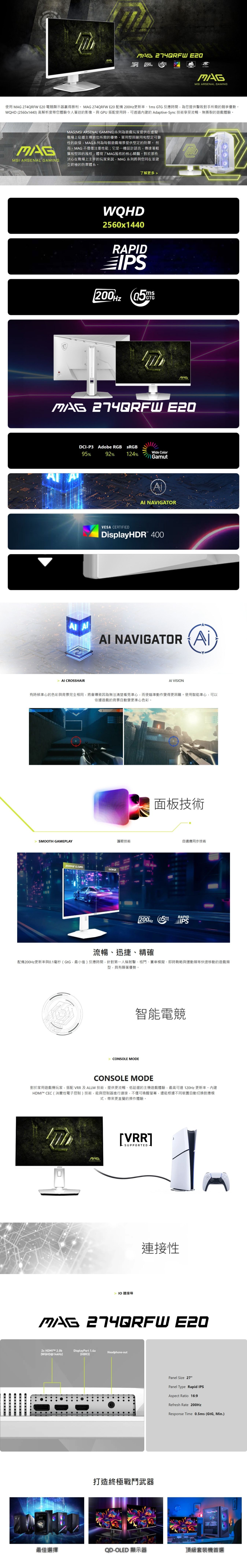 [商品規格]面板尺寸:27"顯示區域(MM):596.736 (H) x 335.664 (V)曲面螢幕:Flat面板類型:Rapid IPS最佳解析度:2560 x 1440 (WQHD)像素 (H x V):0.2331 (H) x 0.2331 (V)螢幕比例:16:9亮度:SDR: 300 cd/m²靜態對比度:1000:1動態對比度(DCR):100000000:1訊號頻率:72~300 KHz(H) / 48-200 Hz(V)更新頻率:200Hz反應時間:0.5ms (GtG, Min.)動態刷新率技術:Adaptive-Sync支援HDR:VESA DisplayHDR 400影像連接埠:1x DisplayPort 1.4a (HBR3)2x HDMI™ 2.0b (WQHD@144Hz)音頻接孔:1x Headphone-out可視角度:178° (H) / 178° (V)Adobe RGB / DCI-P3 / sRGB:92% / 95% / 124% (CIE1976 Standard)表面處理:Anti-glare色彩顯示:1.07B, 10 bits (8 bits + FRC)電源規格:Internal Power Board電源輸入:100~240V, 50/60Hz調整 (仰角):-5° ~ 20°調整 (高度):0~130 mm調整 (左右旋轉):-30° ~ 30°調整 (垂直旋轉):-90° ~ 90°肯辛頓鎖孔:Yes紙箱尺寸 (寬X深X高):840 x 148 x 475 mmDimension with Stand (W x D x H):613.5 x 227.9 x 406.3 mmDimension without Stand (W x D x H):613.5 x 57 x 365.4 mm重量:6.9 kgVESA安裝:100 x 100 mm刷新率範圍:48~200HzConsole Mode:Supported Resolution & Refresh Rate:1080p: 60Hz and 120Hz1440p: 60Hz and 120HzHDMI™ CEC: SupportedVRR: PS5 and Xbox SupportedAccessories:1x DisplayPort Cable (1.4a), 1x Power Cord (C13), 1x Quick Guide, 4x Stand Screw備註:HDMI™: 2560 x 1440 (Up to 144Hz)DisplayPort: 2560 x 1440 (Up to 200Hz)Support: HDMI™ CEC, PIP/PBP; Non Support: KVM貨源:公司貨保固:三年< 文案中相關圖文及說明,僅供參考,規格配置依機型不同有所差異,請以實際商品為準 >