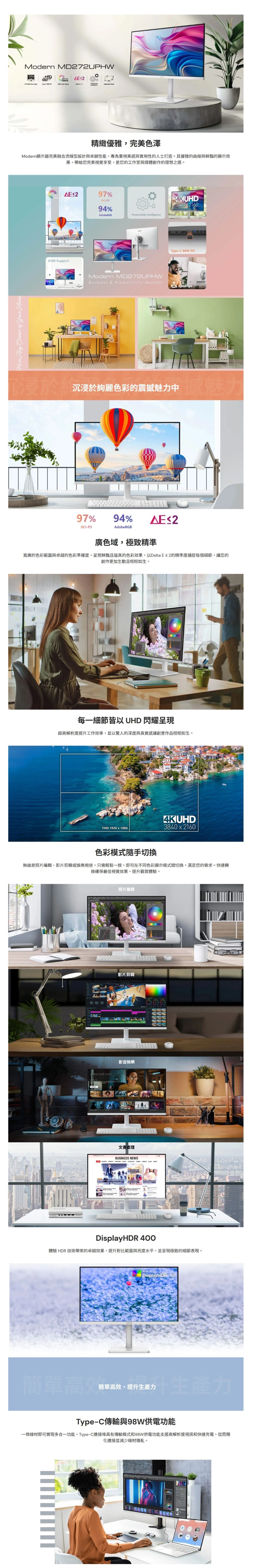 型號:Modern MD272UPHW面板尺寸:27曲面螢幕:Flat最佳解析度:3840 x 2160 (UHD)更新頻率:60Hz反應時間:4ms (GtG)面板類型:IPS亮度:400 cd/m²可視角度:178°(H) / 178°(V)螢幕比例:16:9靜態對比度:1000:1顯示區域(MM):596.736 (H) x 335.664 (V)像素 (H X V):0.1554 (H) x 0.1554 (V)表面處理:Anti-Glare色彩顯示:1.07BCOLOR BIT:10 bits (8 bits + FRC)影像連接埠:2x HDMI™ 2.0b (UHD@60Hz)1x DisplayPort 1.4a1x Type-C (DP alt.) w/ 98W PDUSB接孔:3x USB 5Gbps Type-A1x USB 5Gbps Type-B音頻接孔:1 x Headphone-out肯辛頓鎖孔:YesSPEAKER:2x 3WADOBE RGB / DCI-P3 / SRGB:94% / 97% /124% (CIE1976)VESA安裝:75 x 75 mm電源規格:Internal Power BoardHDR SUPPORT:DisplayHDR 400電源輸入:100~240V, 50/60Hz調整 (仰角):-5° ~ 20°調整 (左右旋轉):-30° ~ 30°調整 (垂直旋轉):-90° ~ 90°調整 (高度):0 ~ 110 mm動態刷新率技術:Adaptive-SyncDIMENSION (W x D x H):613.5 x 63.8 x 362.3 mm重量:6.55 kgCARTON DIMENSION (W X D X H):730 x 193 x 446 mm認證:CB/CE影像輸出兼容性:PC, Mac, PS5™, PS4™, Xbox, Mobile, Notebook*All trademarks and the registered trademarks are the property of their respective owners.ACCESSORIES:1x HDMI Cable (2.0), 1x Type-C Cable (3.2 Gen 1), 1x USB Type-B to A Cable (3.2 Gen 1),1x Power Cord, 1x Quick Guide, 4x VESA Wall Mount Screw備註:HDMI™ : 3840 x 2160 (Up to 60Hz)DisPlayPort: 3840 x 2160 (Up to 60Hz)Type-C: 3840 x 2160 (Up to 60Hz)Delta-E (△E) ≤ 2貨源:公司貨保固:三年< 文案中相關圖文及說明,僅供參考,規格配置依機型不同有所差異,請以實際商品為準 >